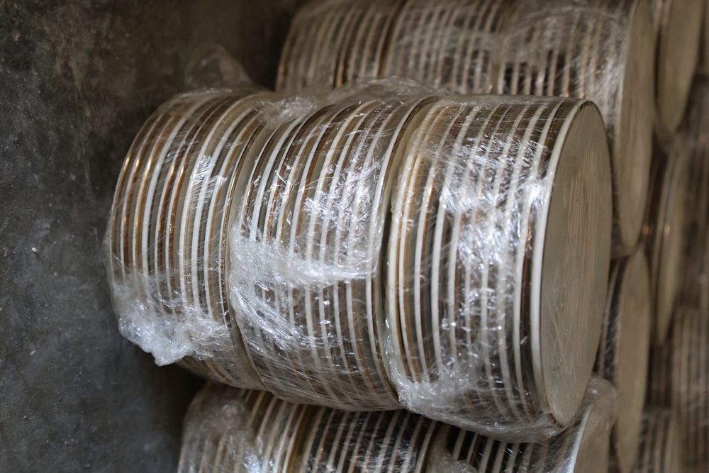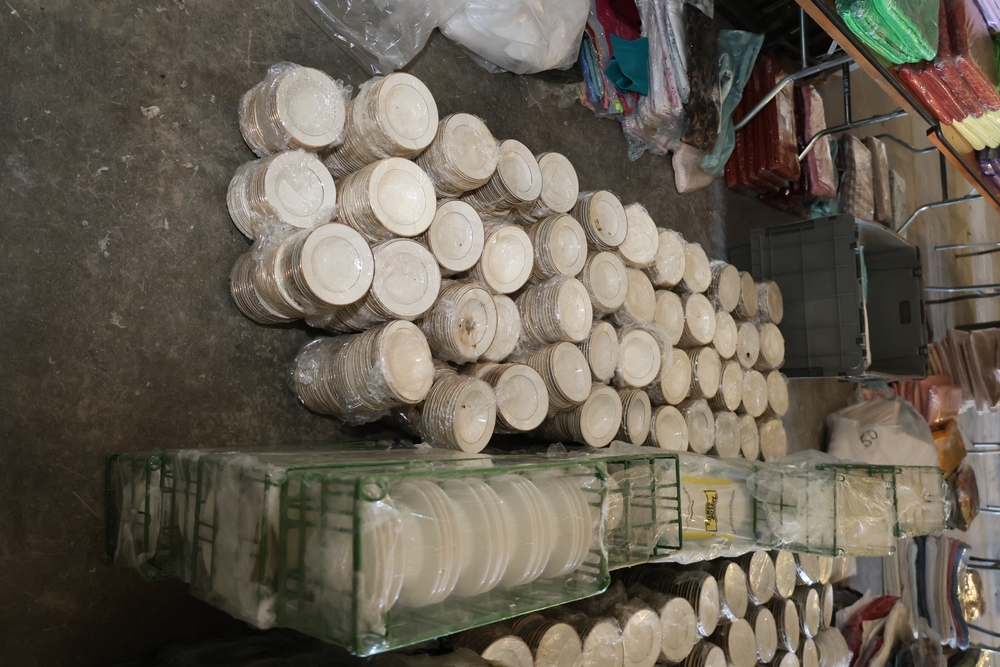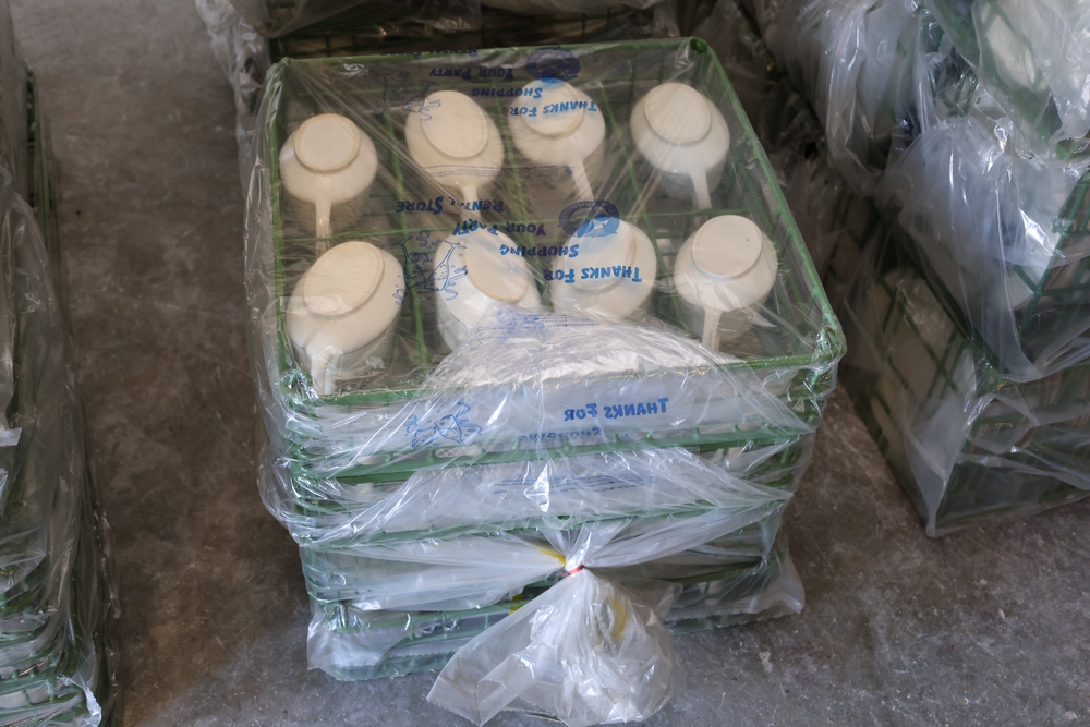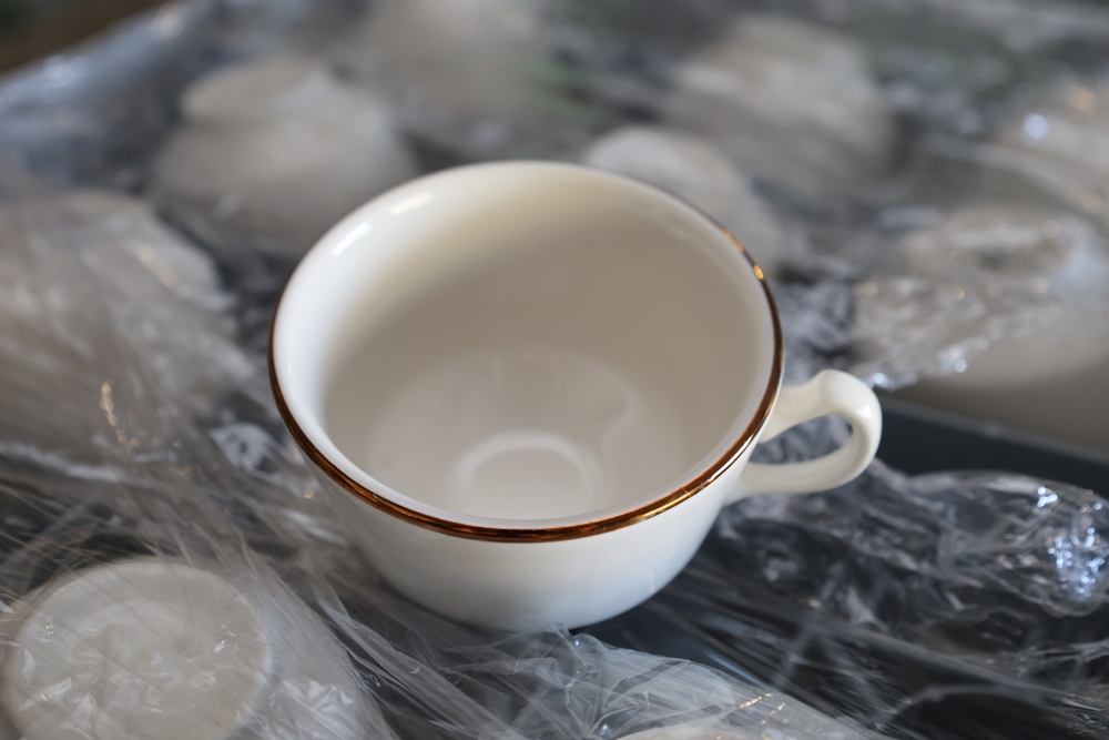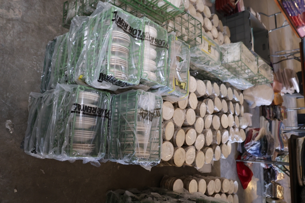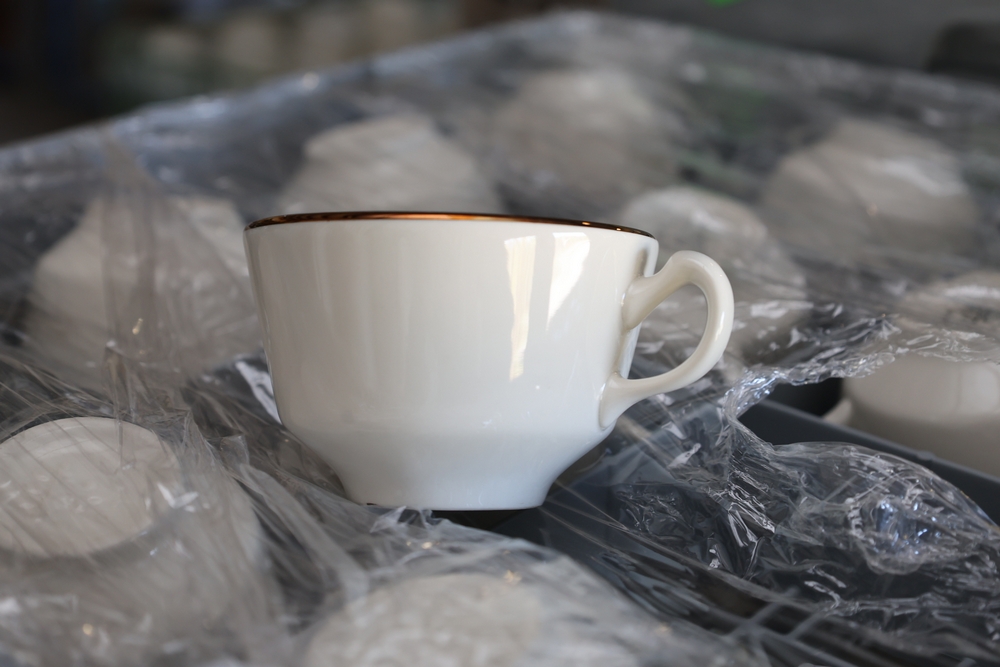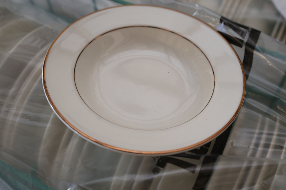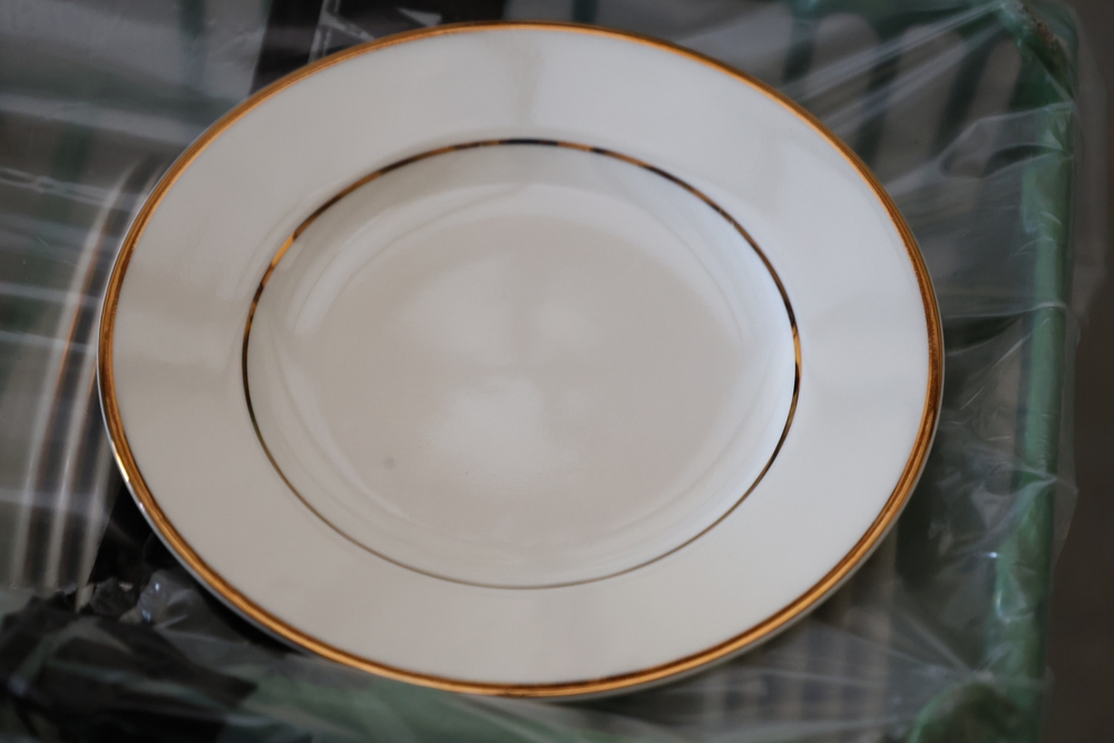 Large quantity of rental company dinnerware including numerous stacks of plates and shallow bowls, along with multiple wire dish racks filled with plates and bowls marked Taylor Rental, and additional stacked commercial plastic dish racks, with visible Homer Laughlin China USA markings on underside of pieces. Approx quantities: 10" dinner plate - 2000, 9" plate - 225, 7" plate - 3600, 5" plate - 1045, 9" bowl - 225, 7" bowl - 320, 5" bowl - 1350, sugar bowl - 50, creamers - 28, saucers - 2700, coffee cups - 1800.