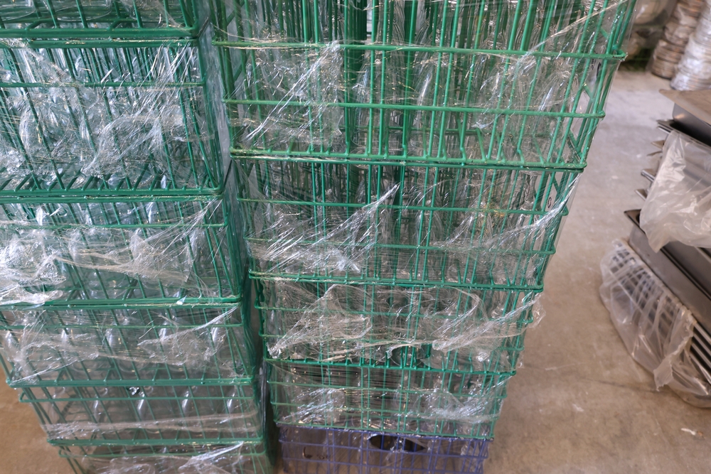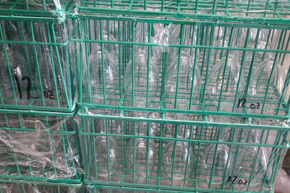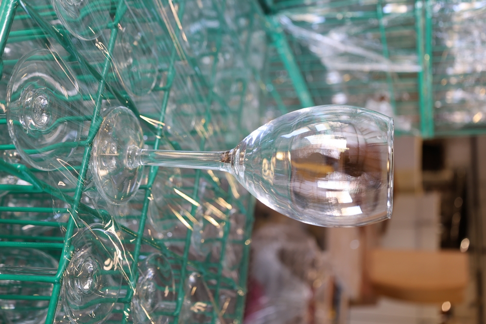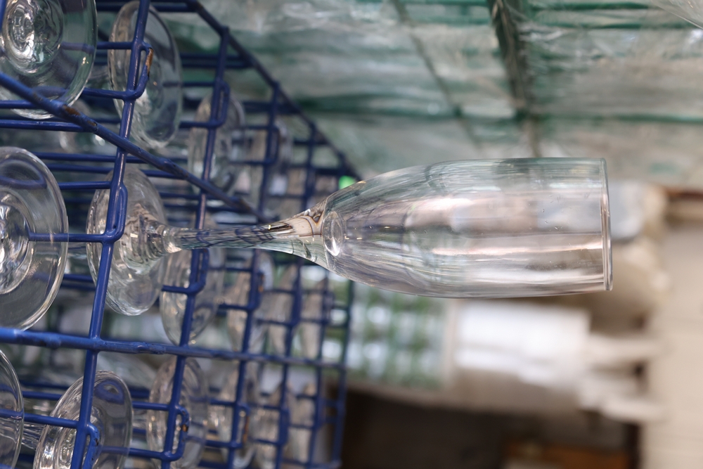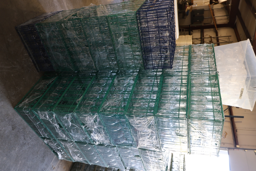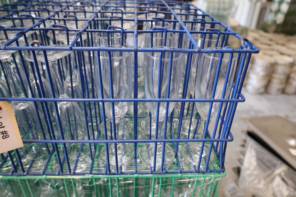 Large quantity of stemware in commercial dish racks, including wine glasses and champagne flutes, with multiple green and blue racks stacked.