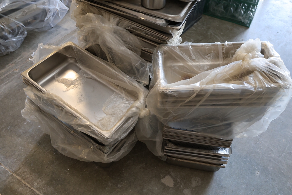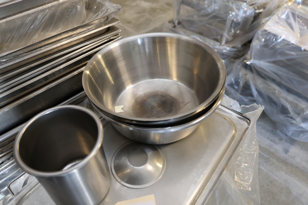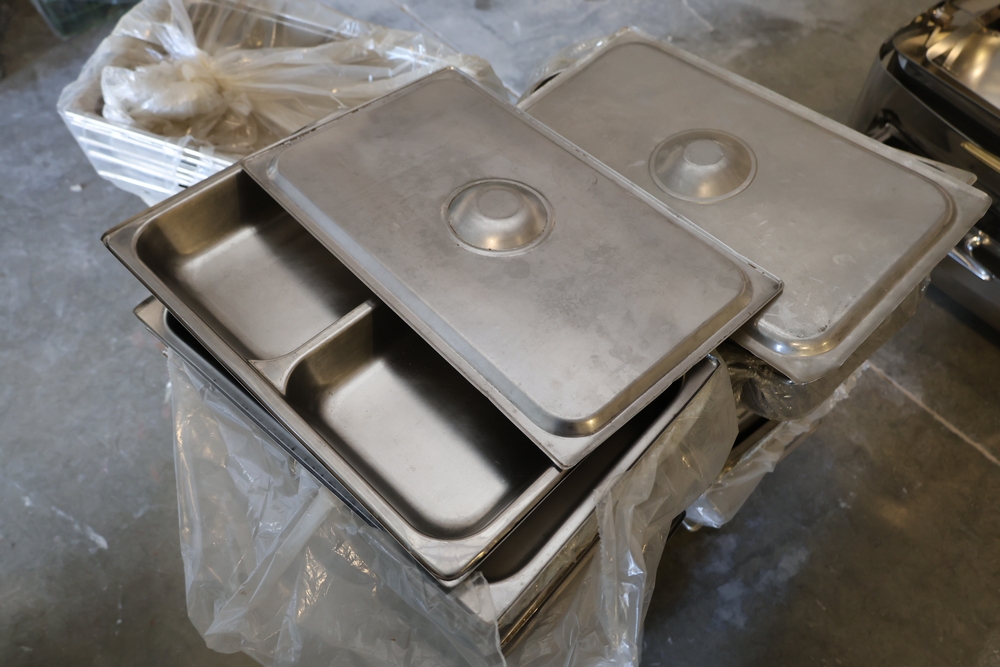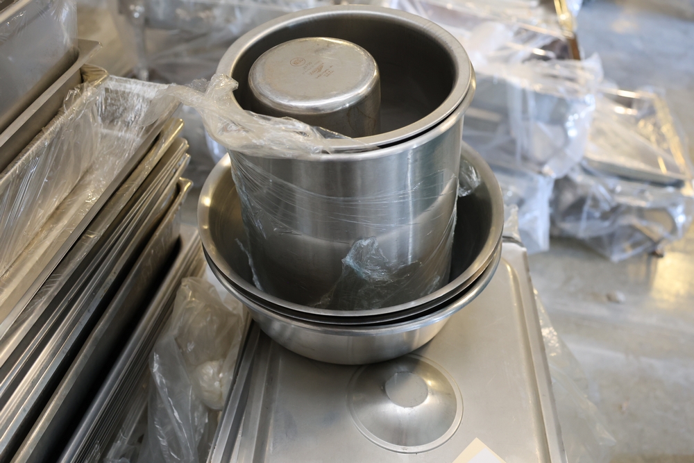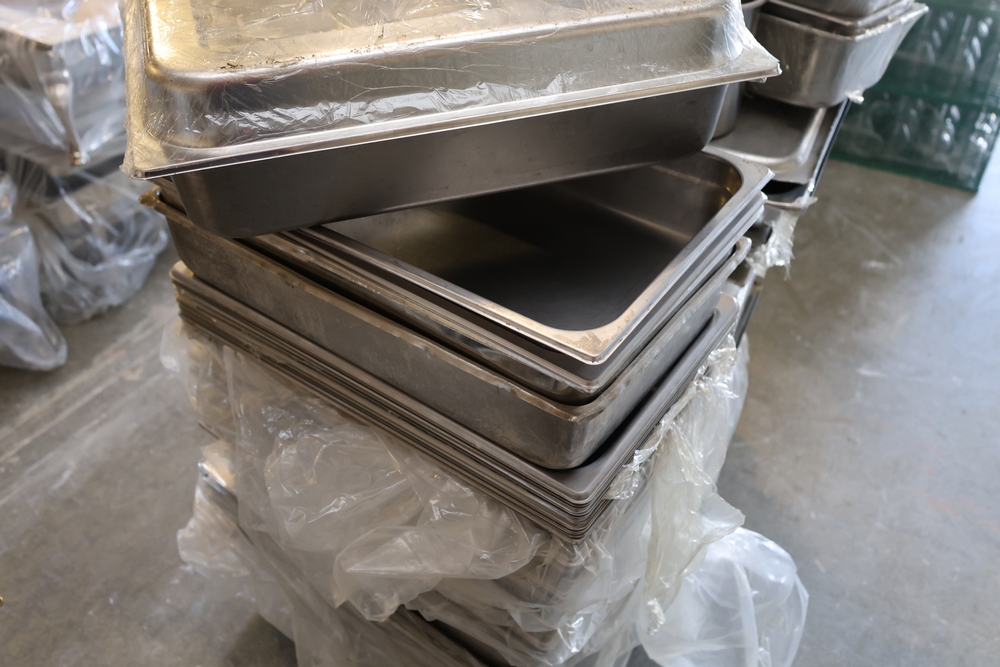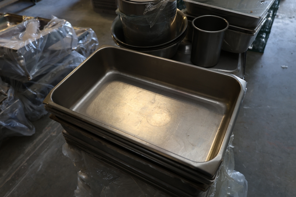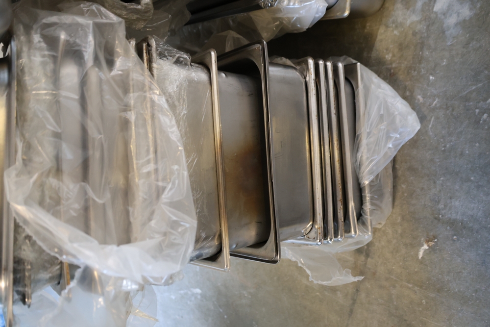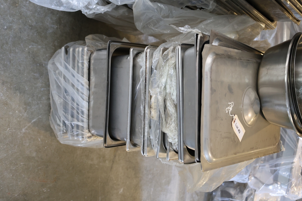 Large quantity of stainless steel hotel pans in various sizes, including perforated pan, solid pans, lids, divided insert pan, mixing bowls, and cylindrical containers.
