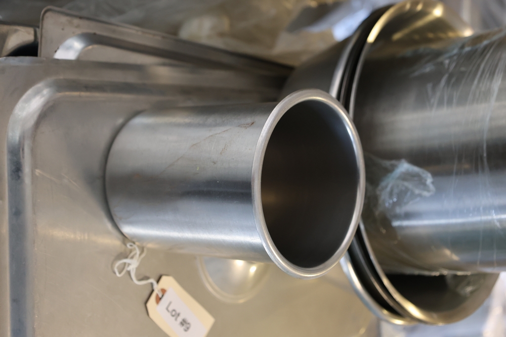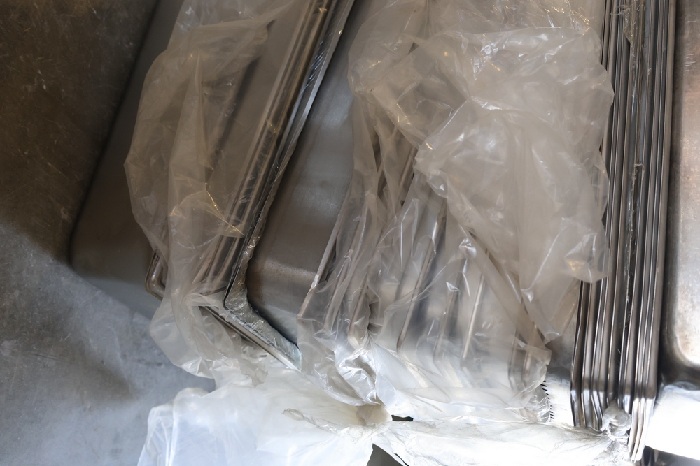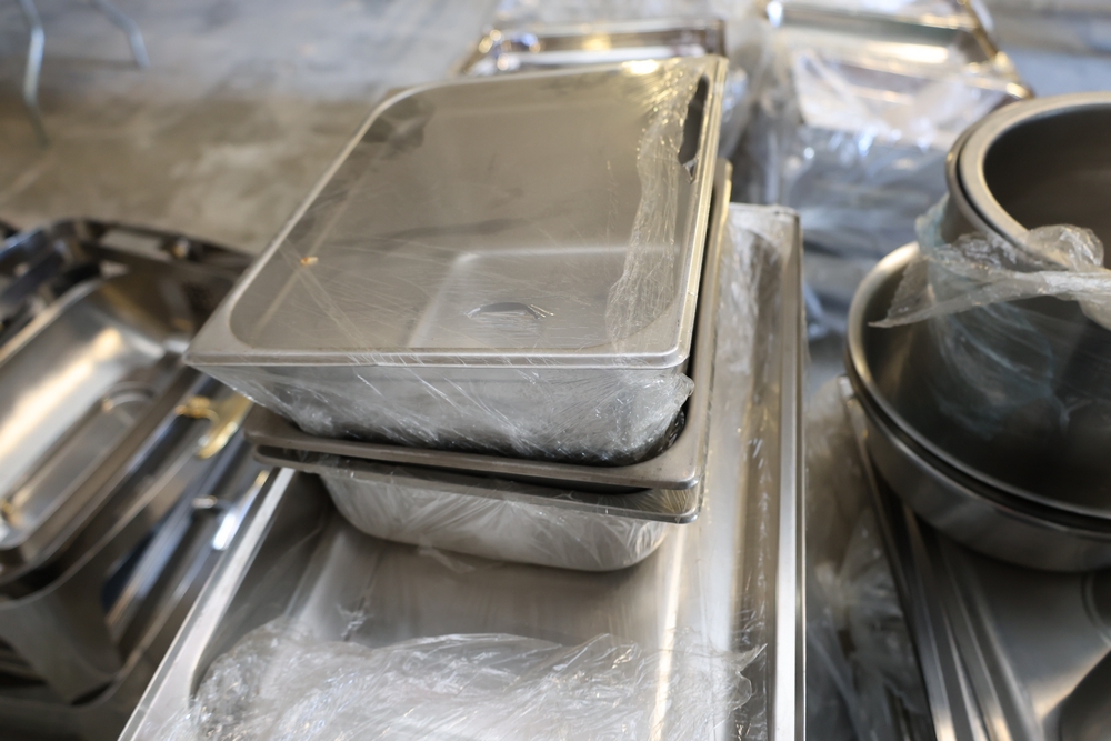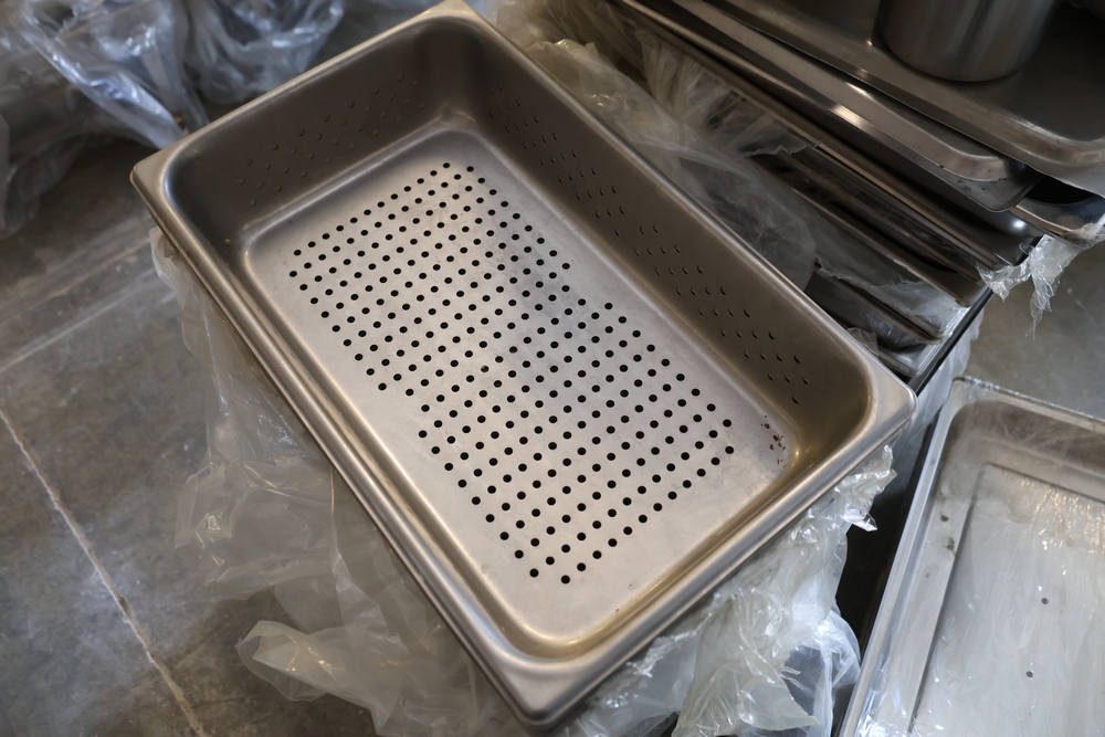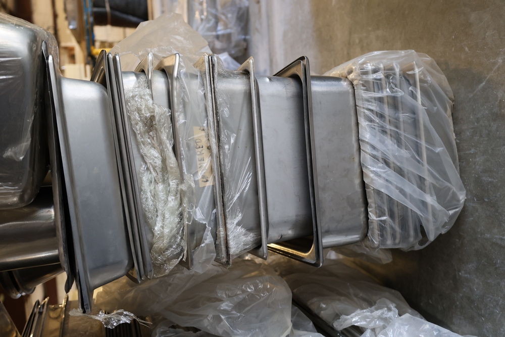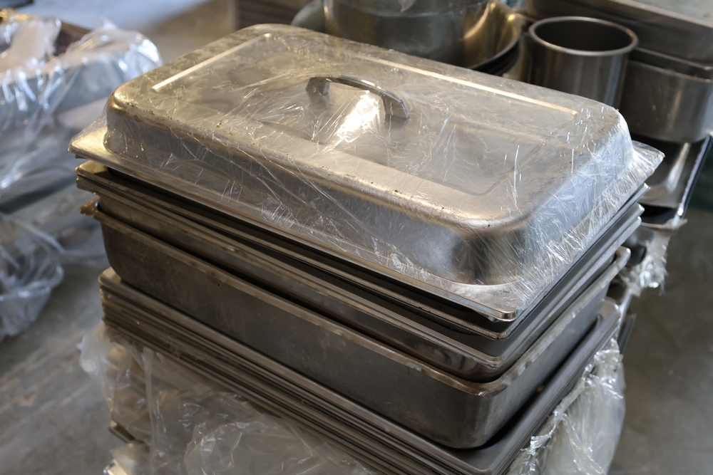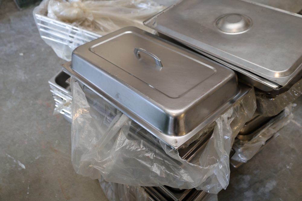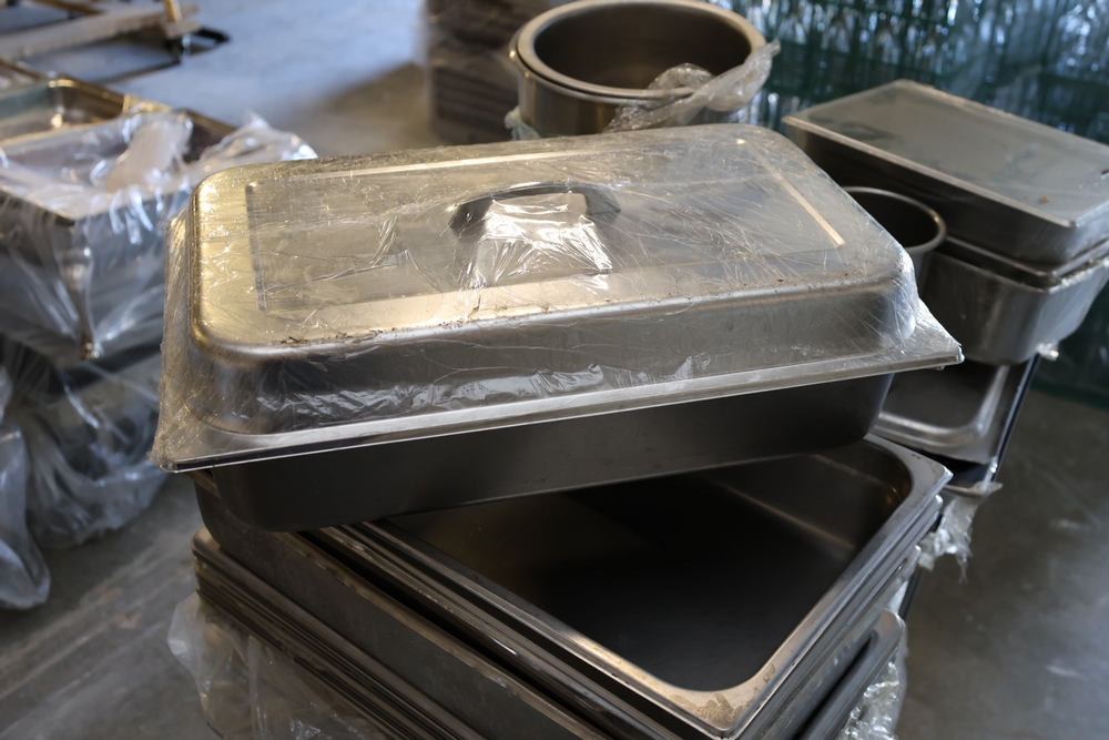 Large quantity of stainless steel hotel pans in various sizes, including perforated pan, solid pans, lids, divided insert pan, mixing bowls, and cylindrical containers.