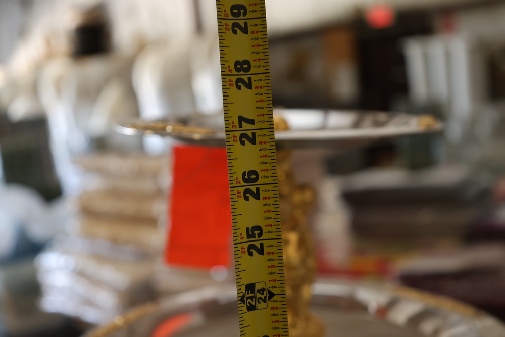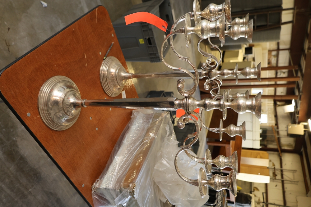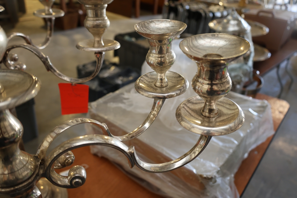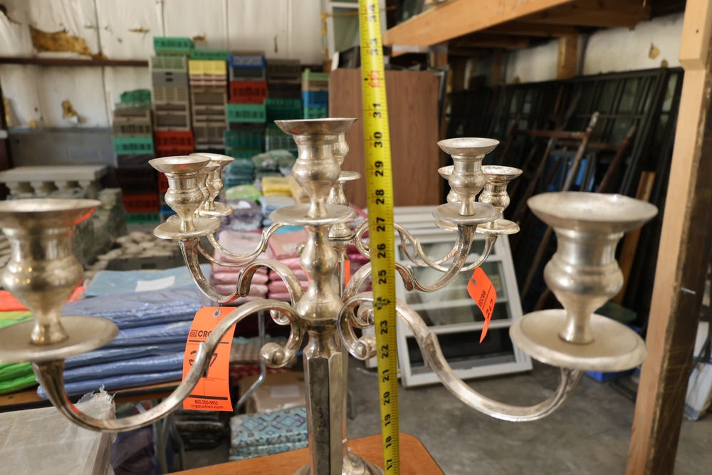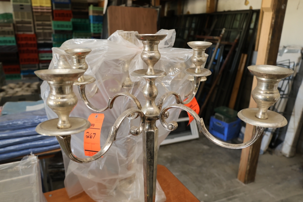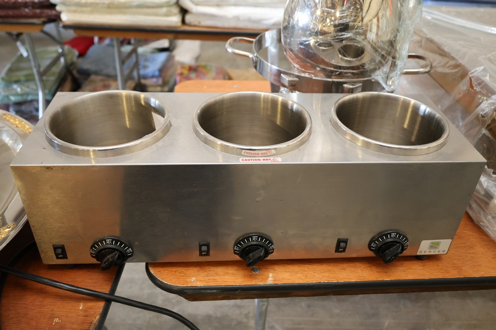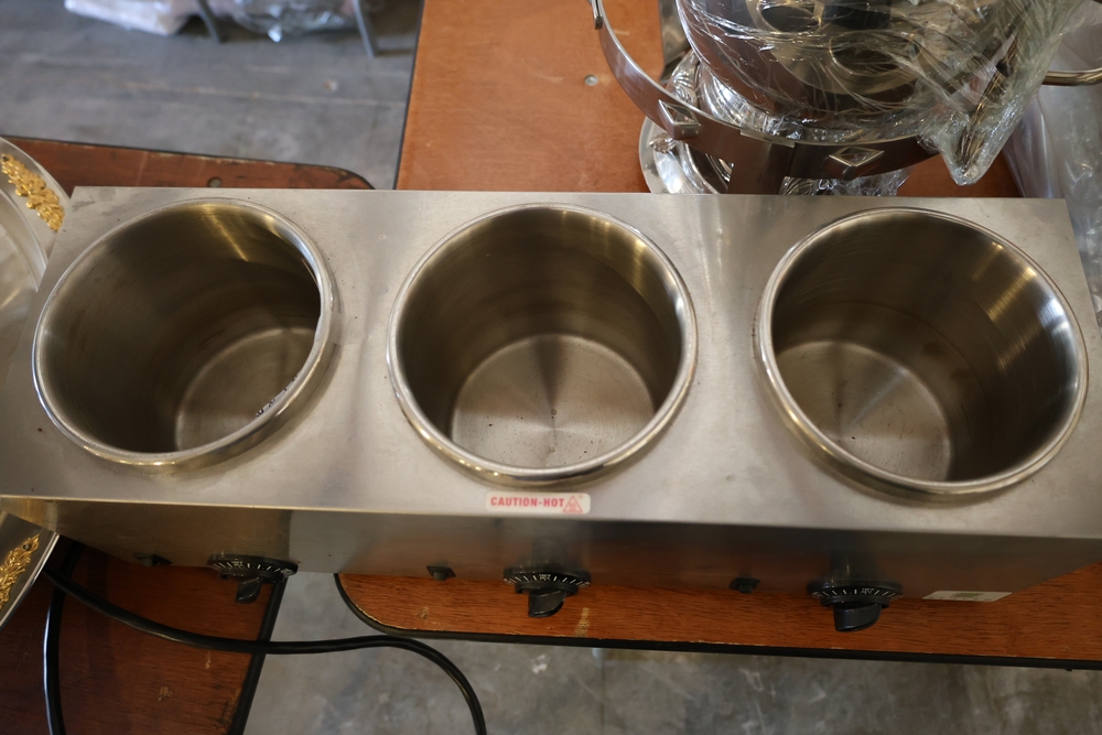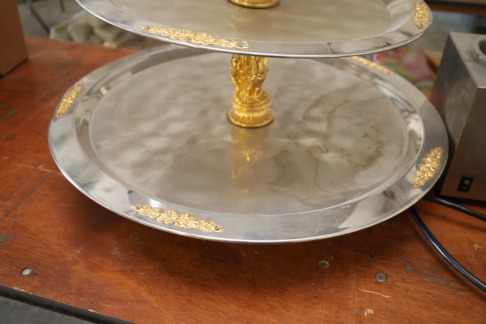Assorted catering and banquet service items including stainless steel three tier serving stand with gold tone accents approximately 23 in diameter, Server triple warmer model FS-4 with three wells, two metal candelabra approximately 30 in tall, beverage urn with stand, and stack of rectangular CAKE STANDS.