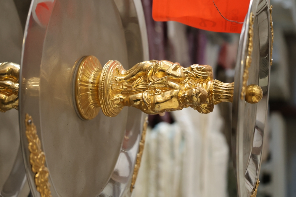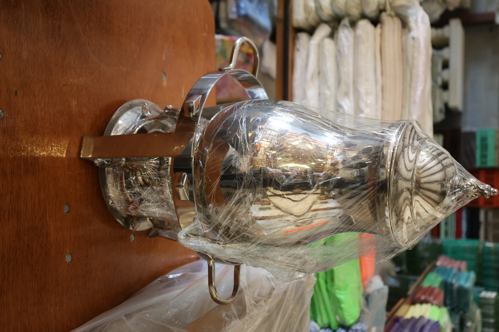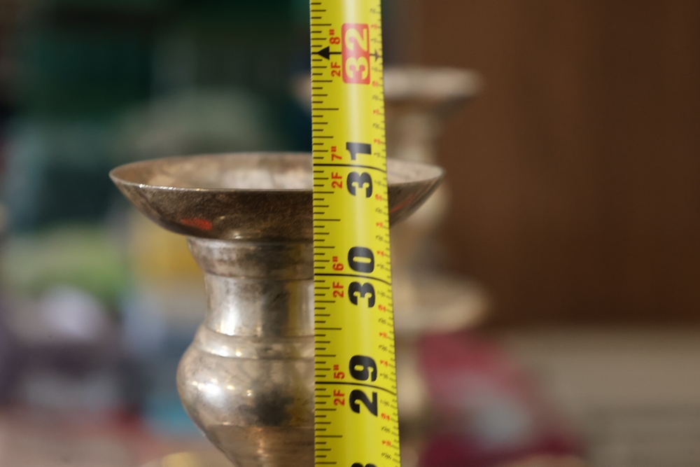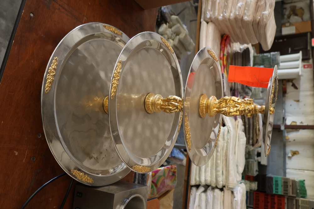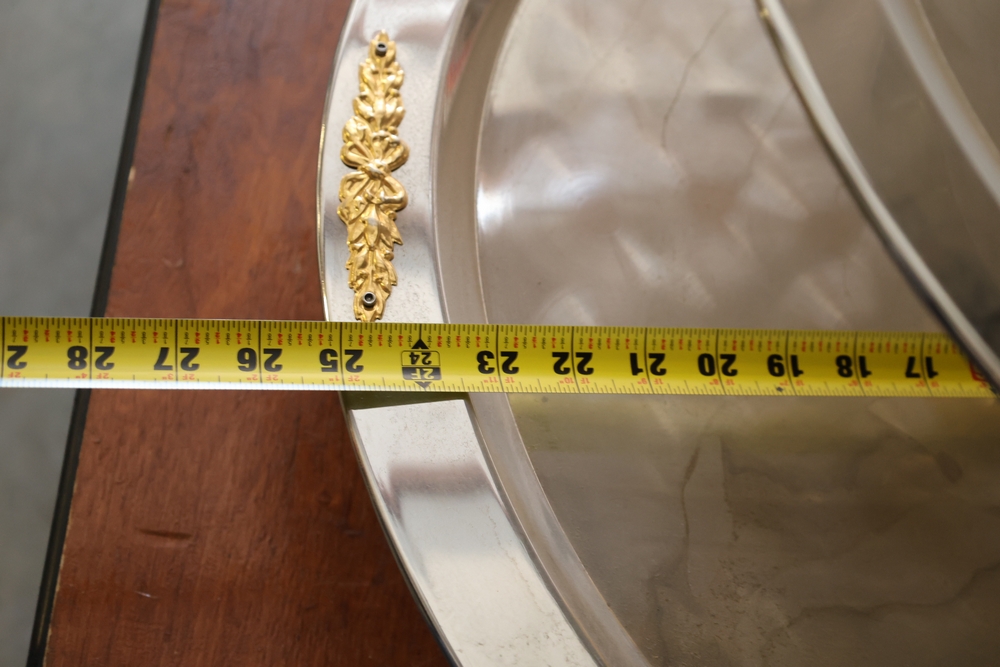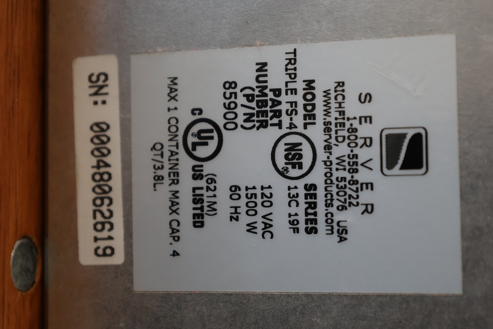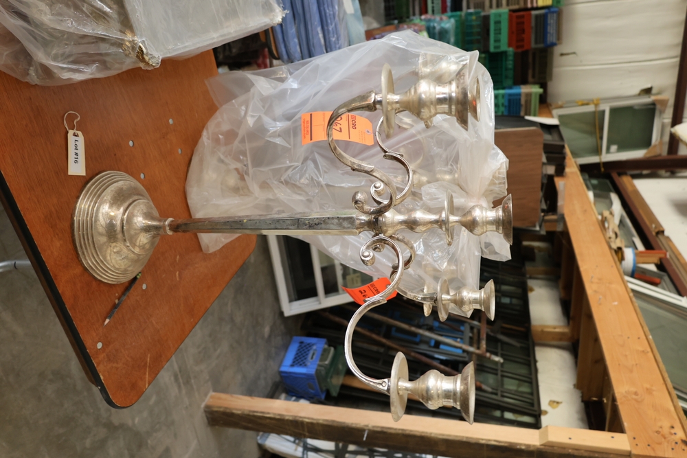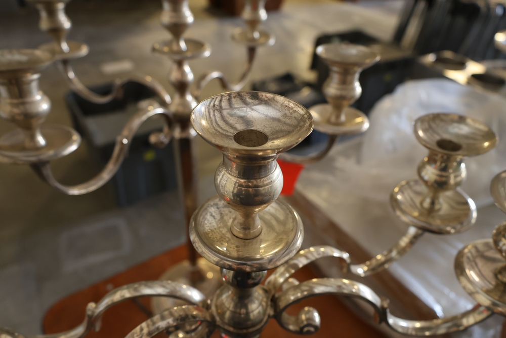 Assorted catering and banquet service items including stainless steel three tier serving stand with gold tone accents approximately 23 in diameter, Server triple warmer model FS-4 with three wells, two metal candelabra approximately 30 in tall, beverage urn with stand, and stack of rectangular CAKE STANDS.