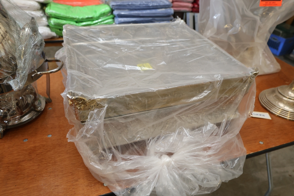 Items include Giffy Barrels used as counterweights; large quantities of commercial dish racks; portable folding server stands; inflatable event items; string light support poles; assorted catering and event service equipment; banquet tables and stacking chairs including large quantity chair lots; shelving, storage, and miscellaneous rental inventory; along with additional fixtures, materials, and equipment from a large-scale rental inventory liquidation. Items are located in Fishkill, NY.