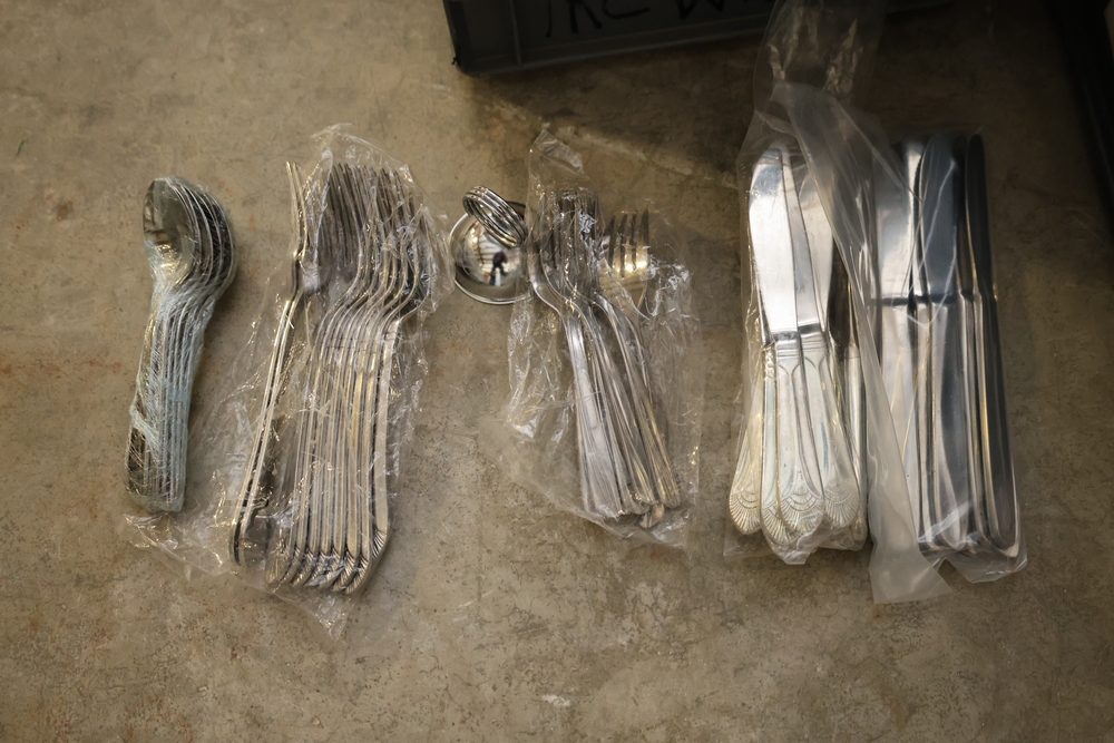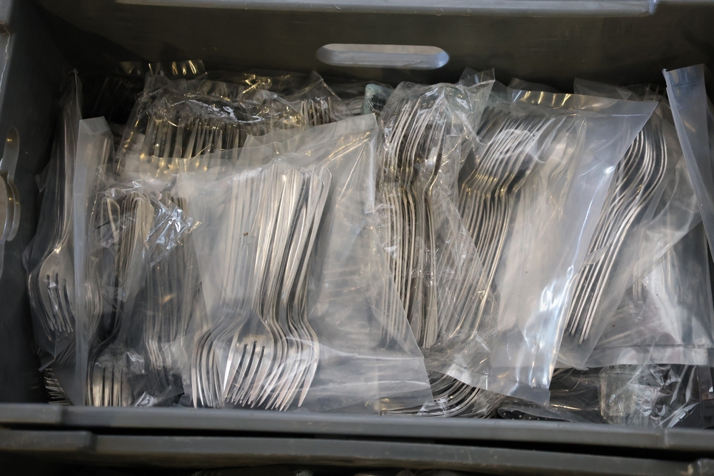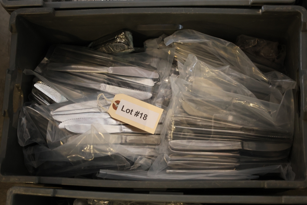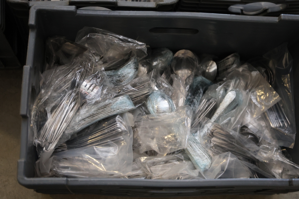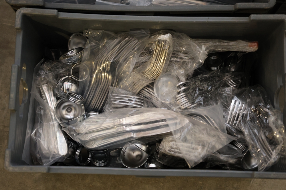 Assorted flatware including forks, knives, spoons, and serving pieces in plastic totes.