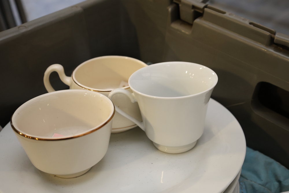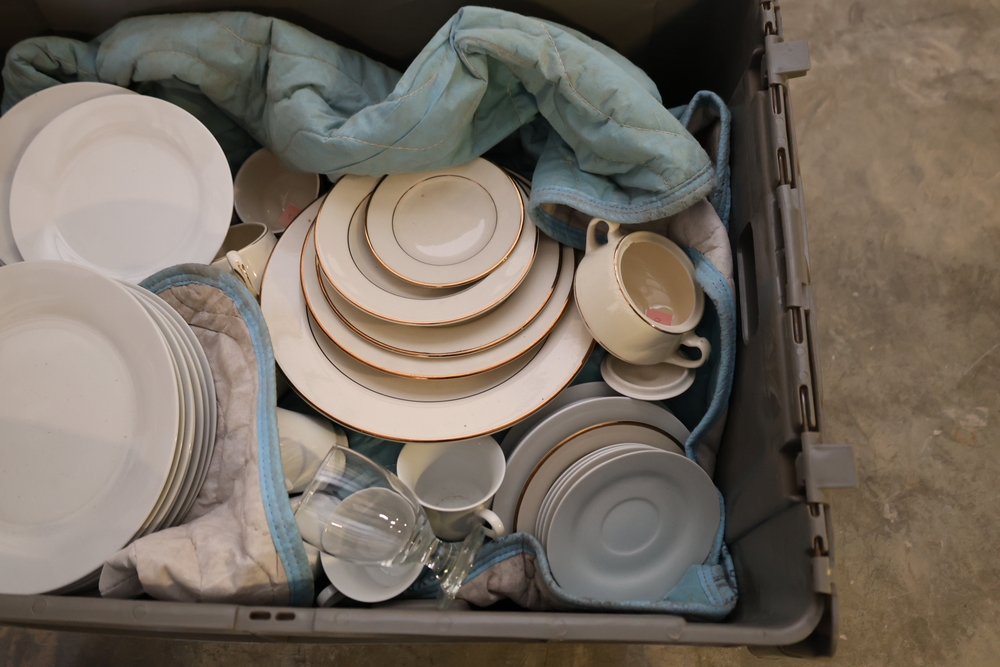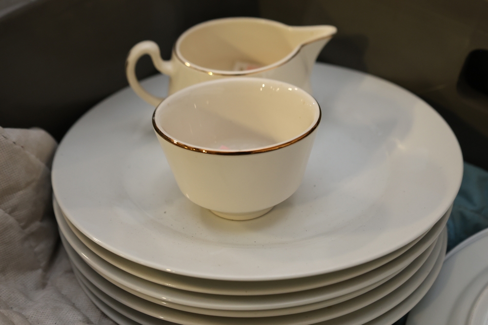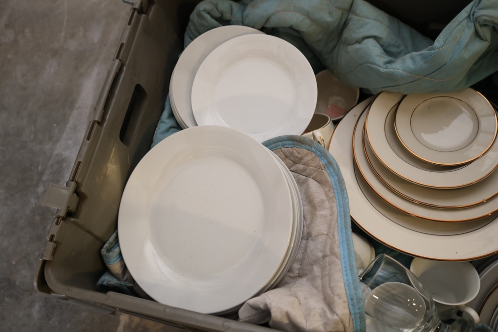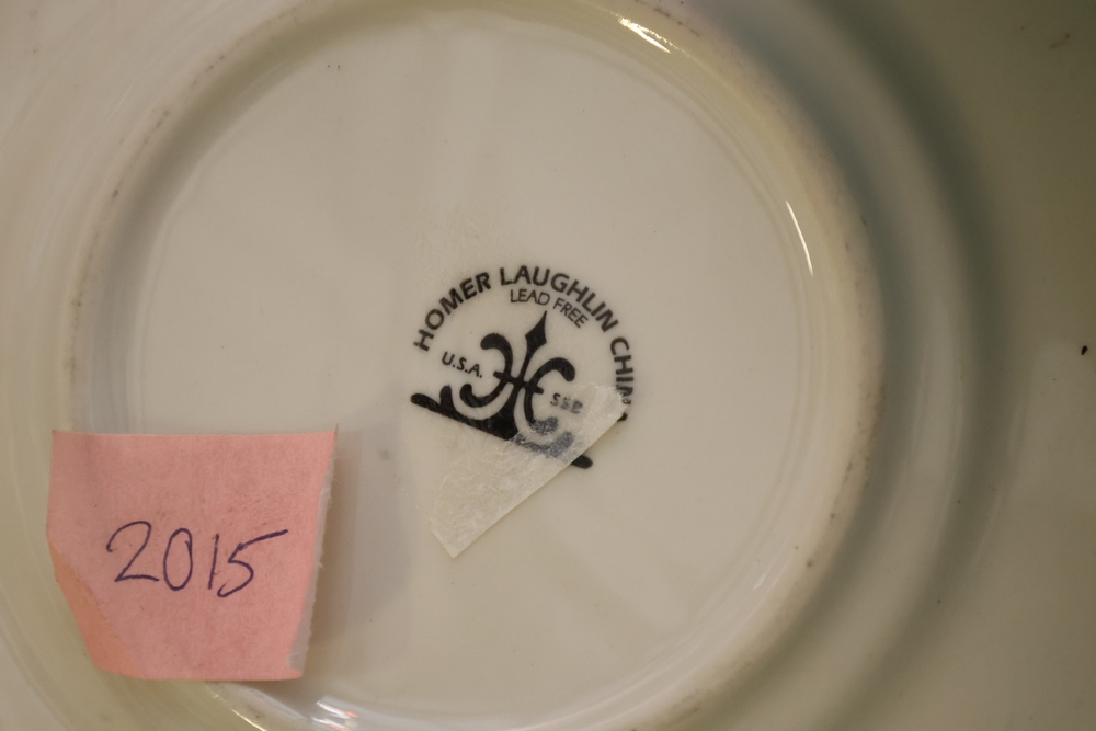Mixed lot of white china dinnerware including plates, cups, saucers, and creamer with some marked Homer Laughlin and other unmarked pieces, in plastic tote.