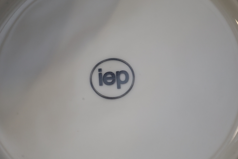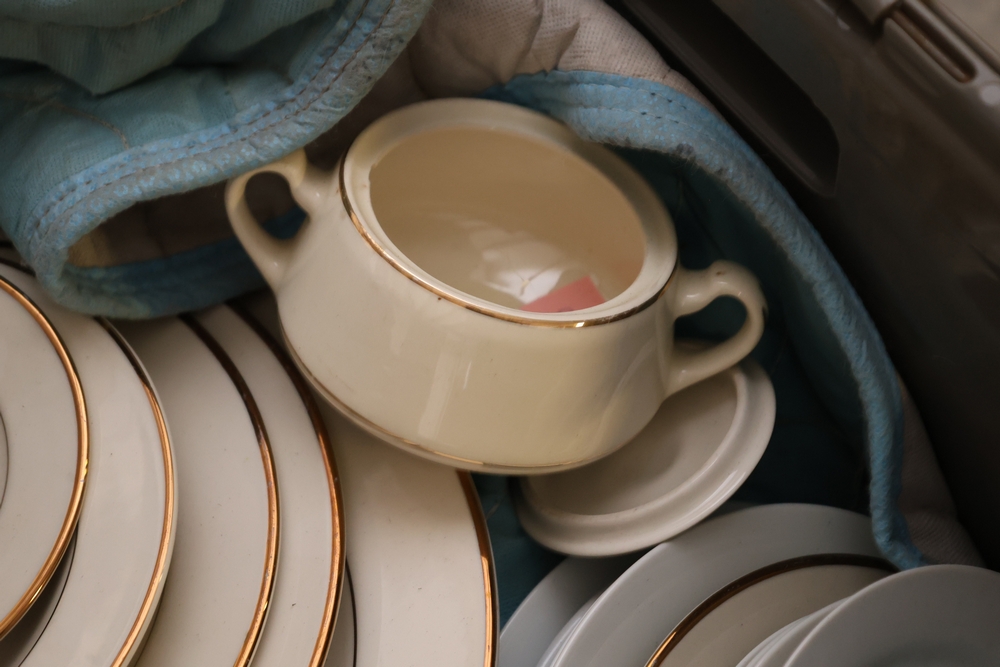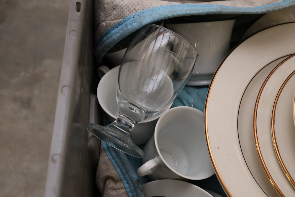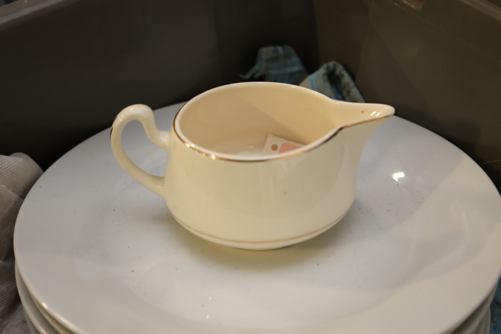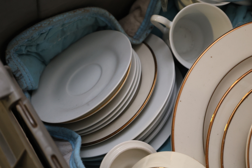 Mixed lot of white china dinnerware including plates, cups, saucers, and creamer with some marked Homer Laughlin and other unmarked pieces, in plastic tote.
