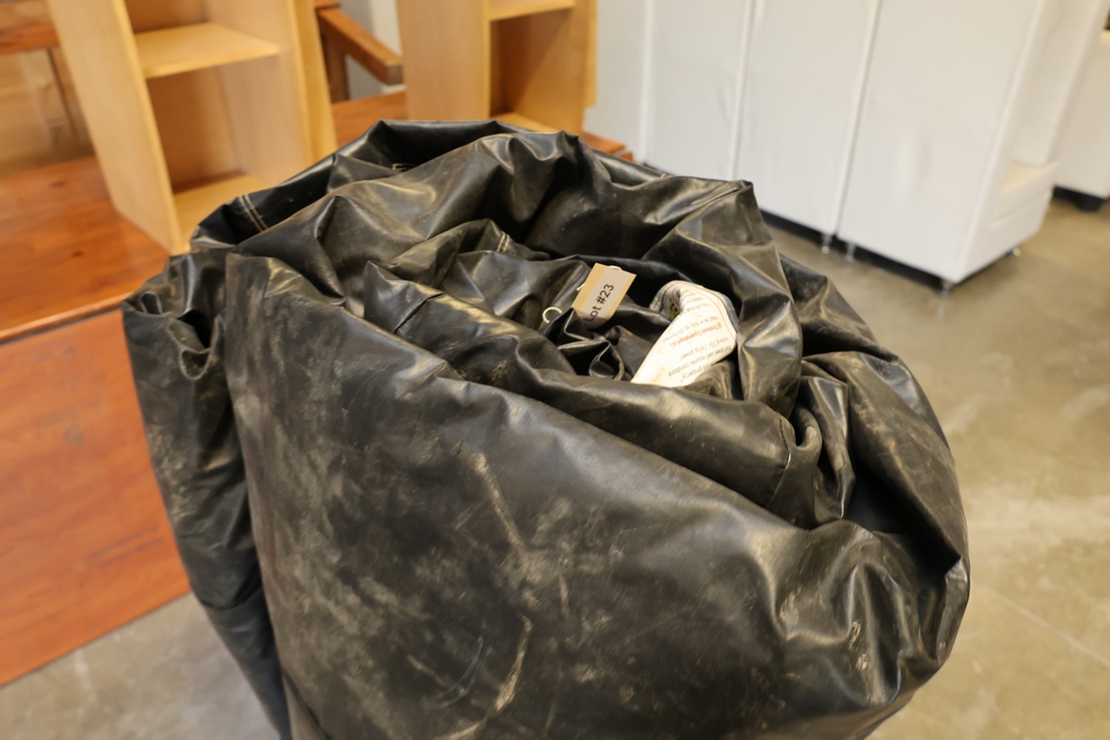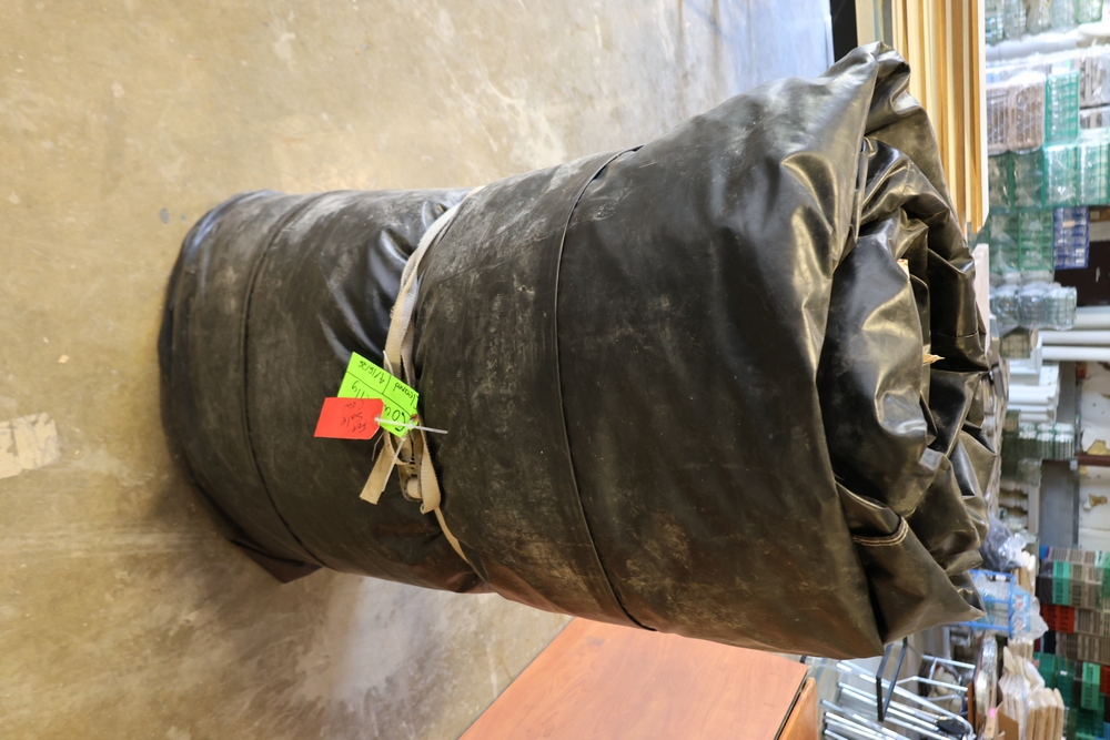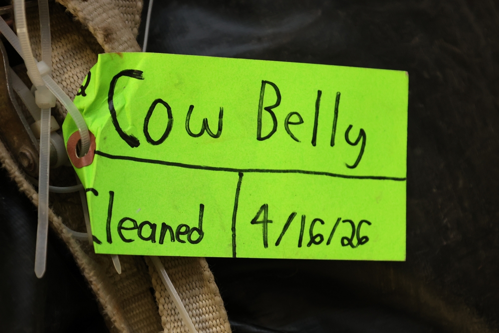 Rolled black & WHITE inflatable cow belly with straps and attached tag marked Cow Belly