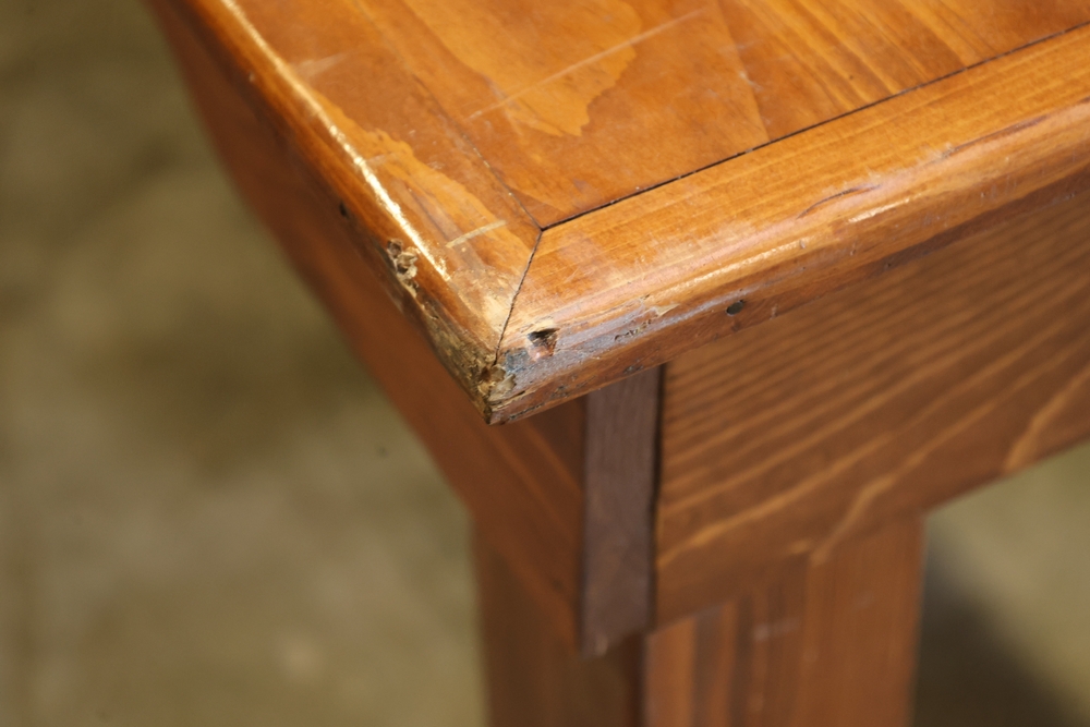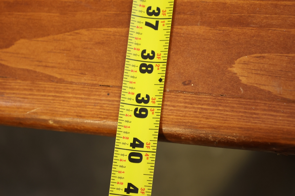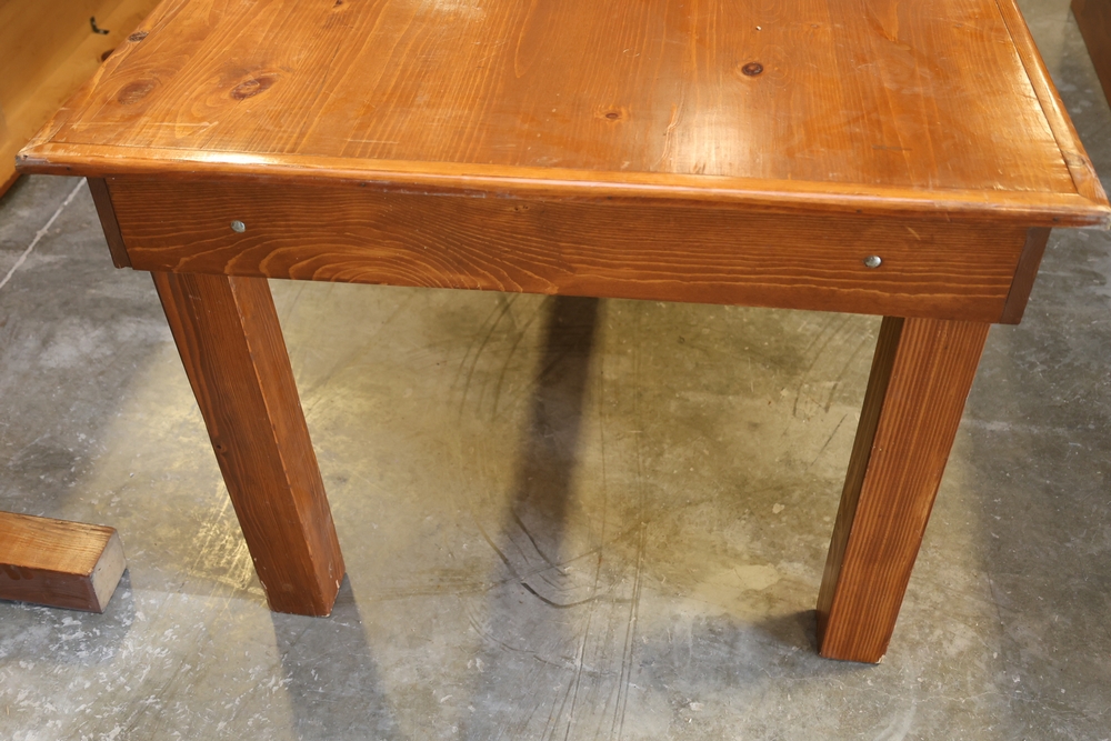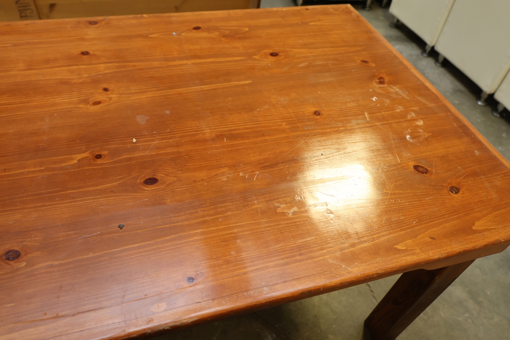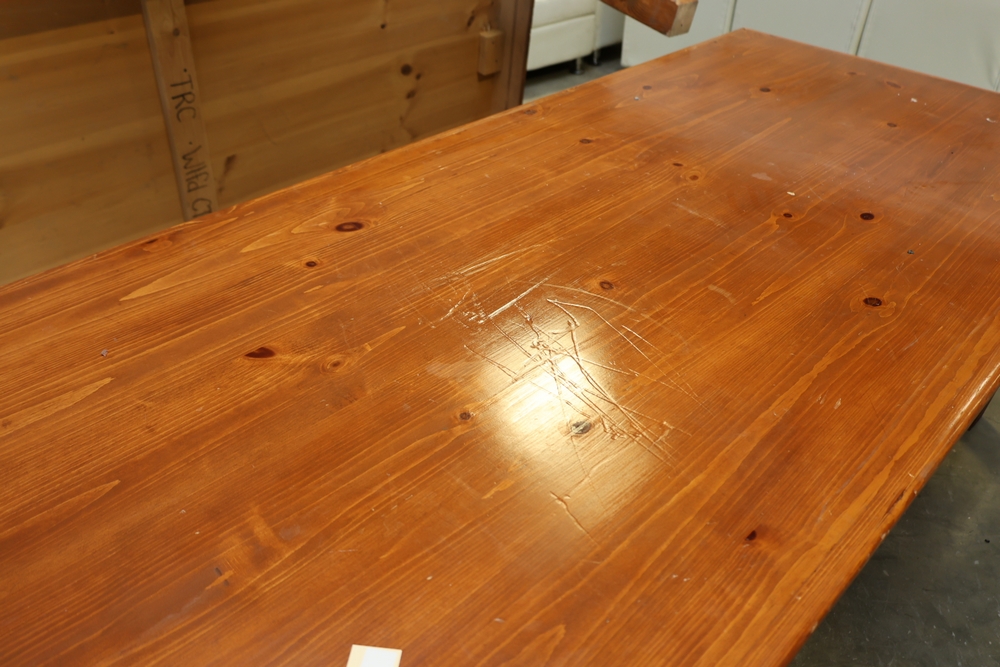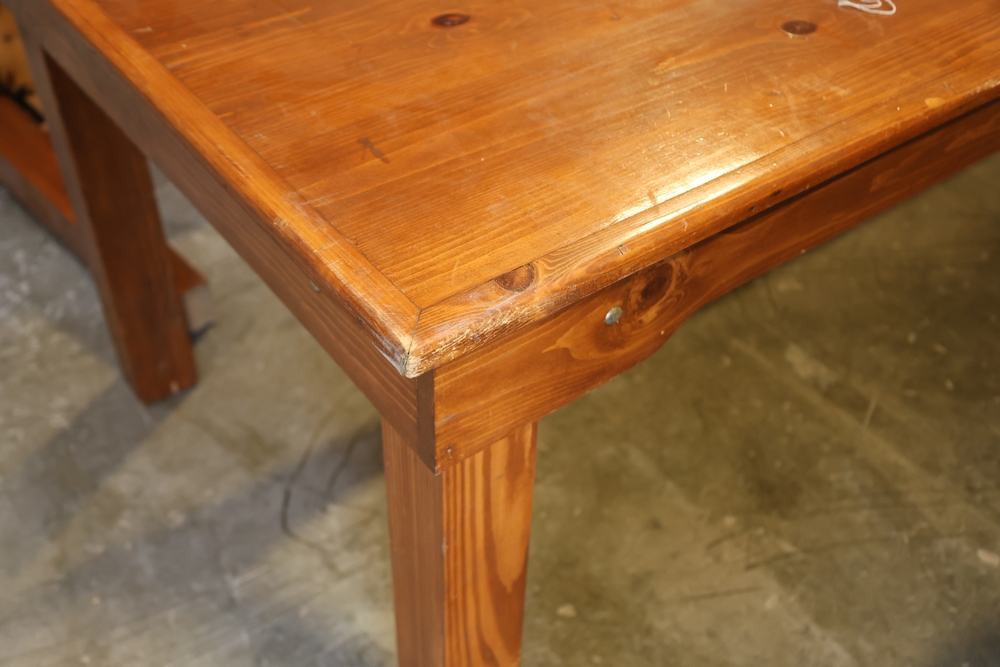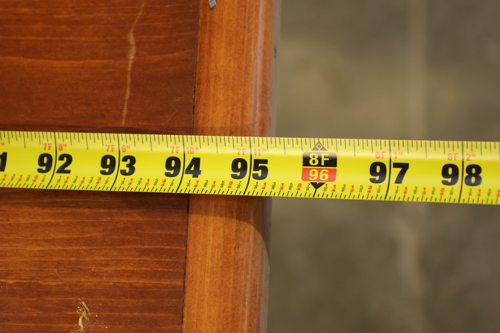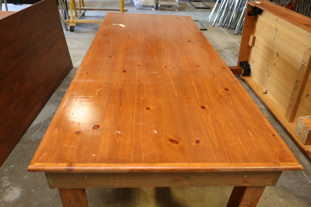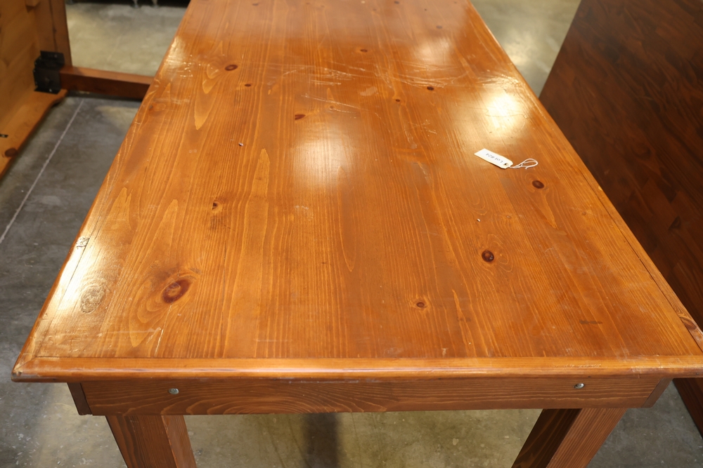 Rectangular wooden farm table with plank style top and straight legs, approximately 95 inches long and about 39.5 inches wide.