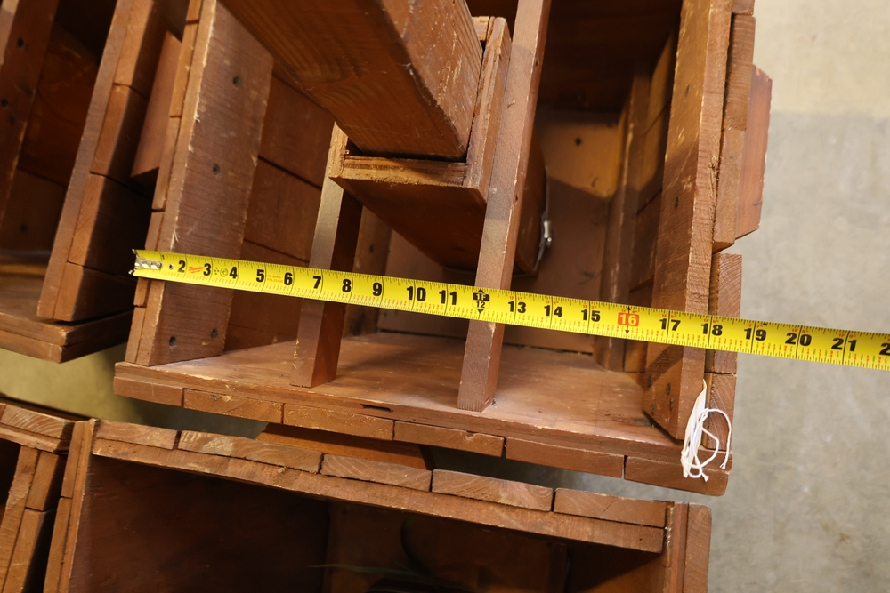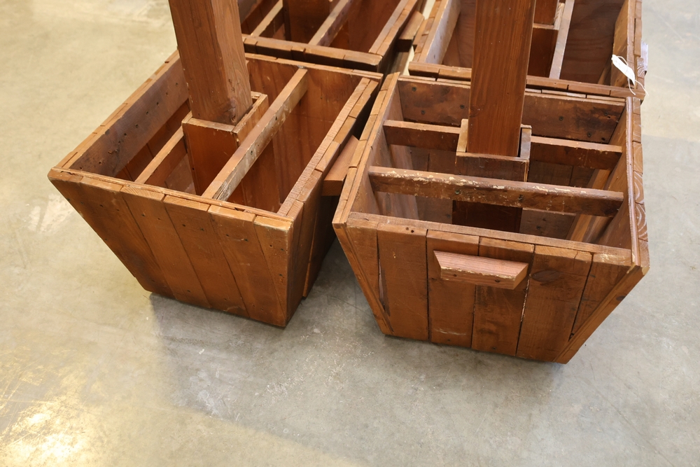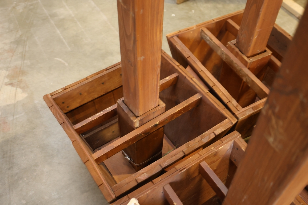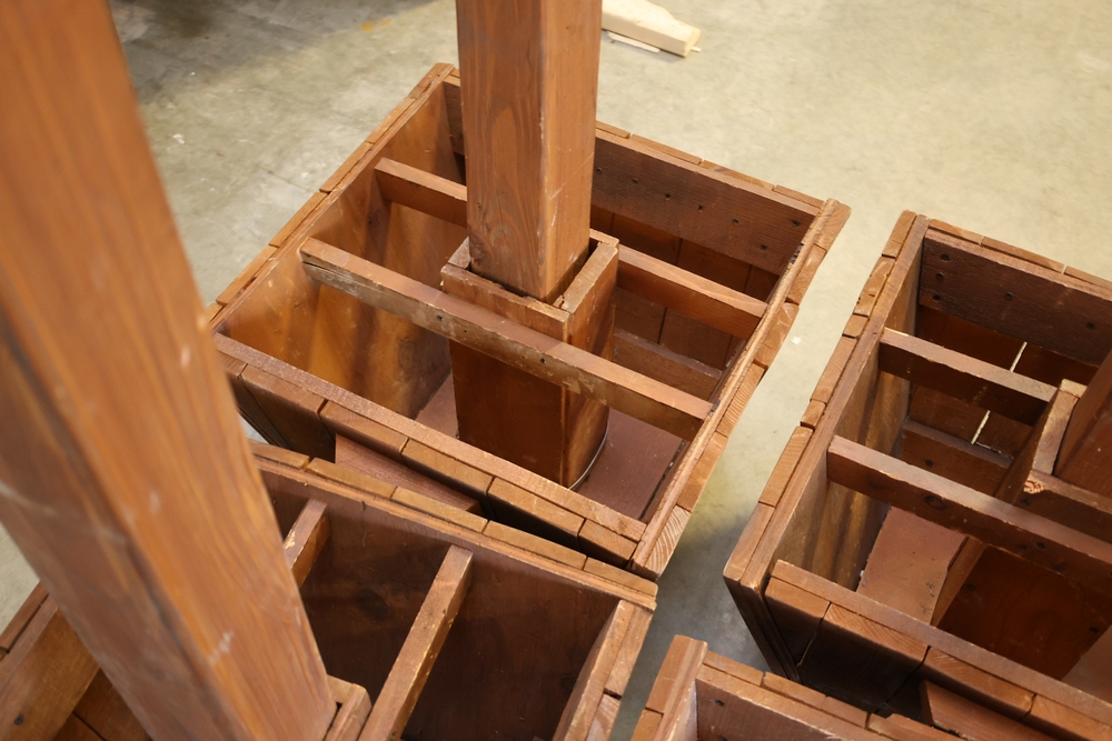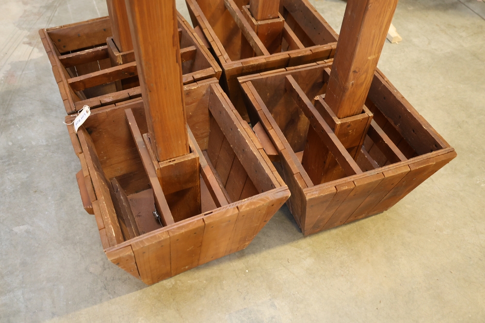 Set of four wood string light stands with square planter-style bases and vertical posts, each approximately 96 inches tall overall; bases approximately 24 inches square.