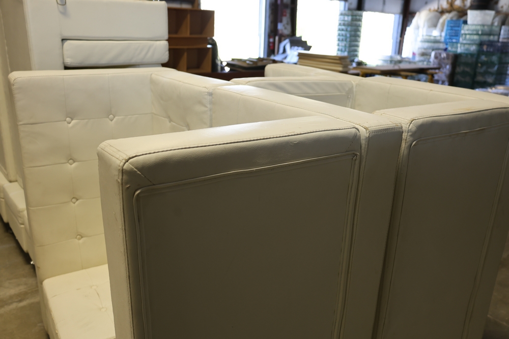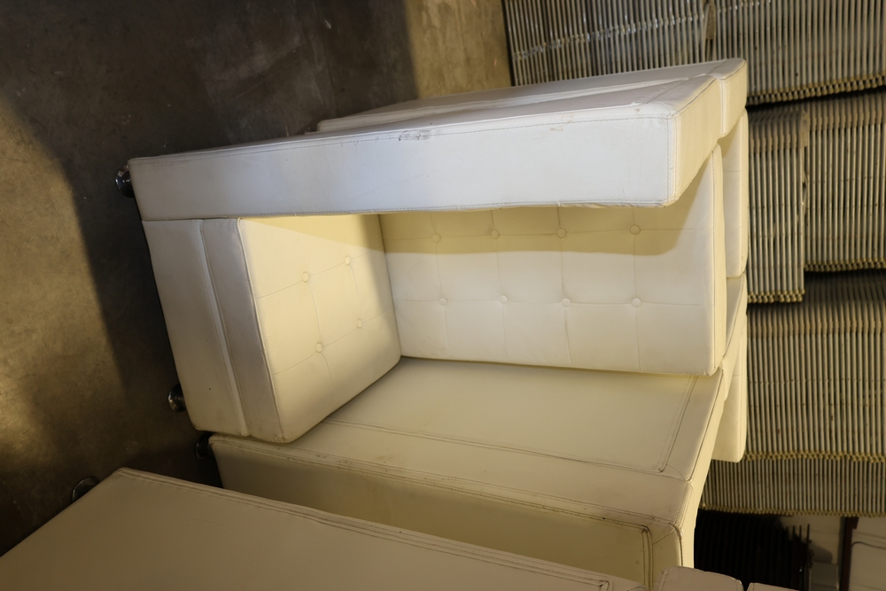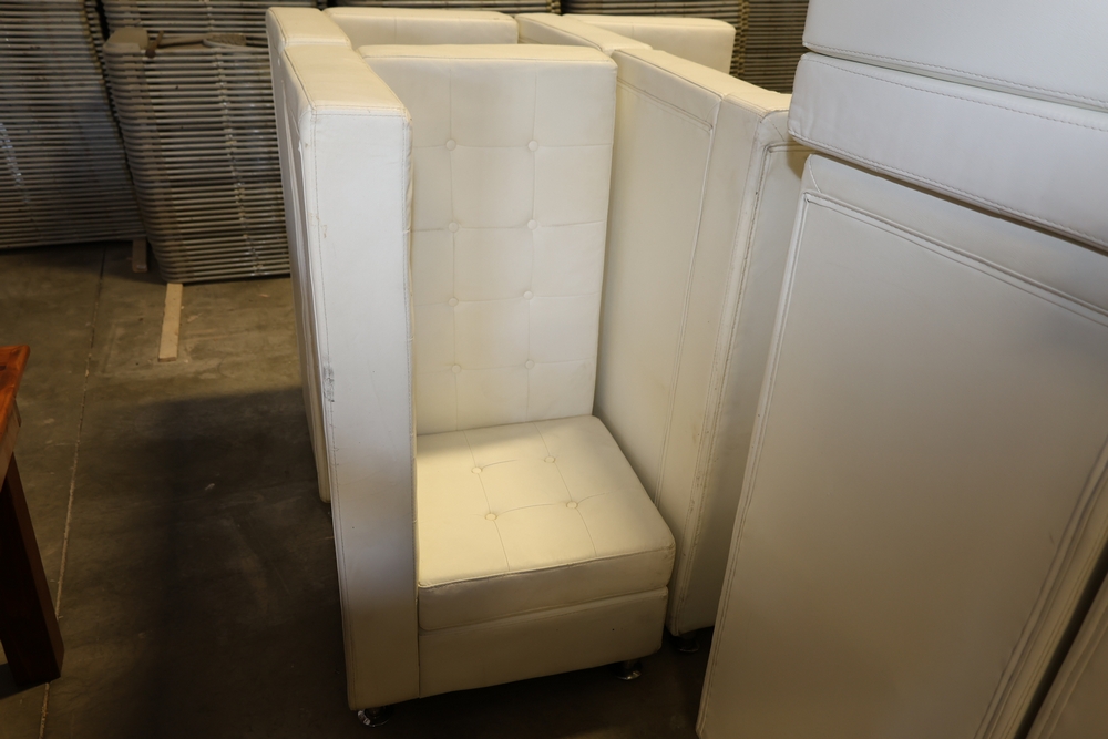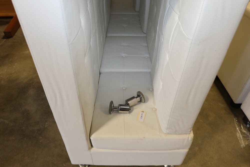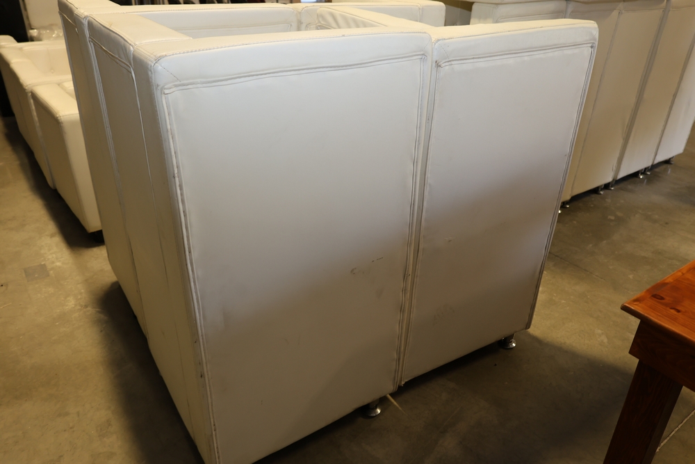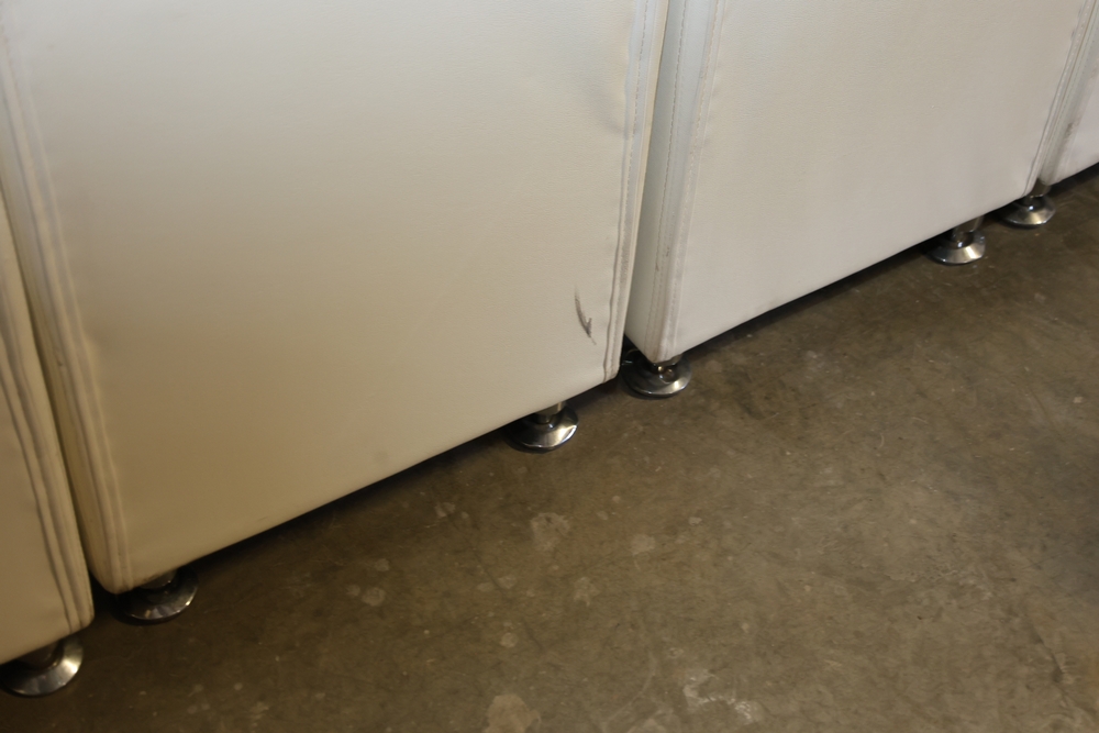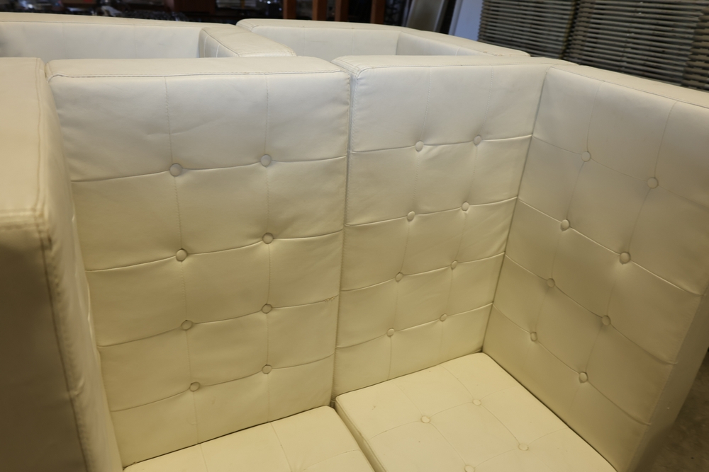 Set of white upholstered modular lounge seating sections with tufted backs and seats, chrome cylindrical legs, approximately 22" x 27" x 52" tall.