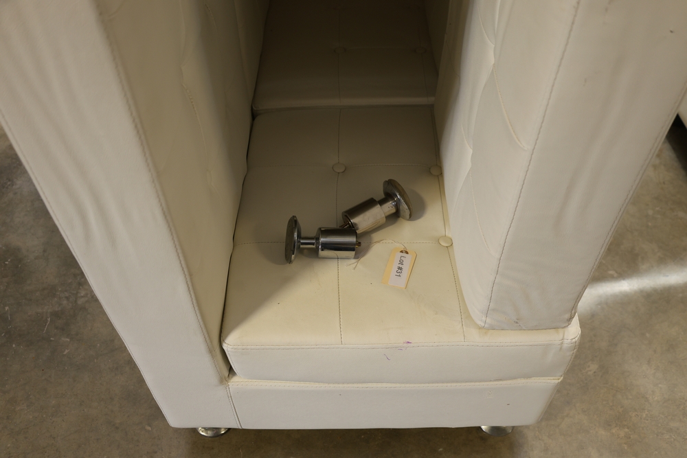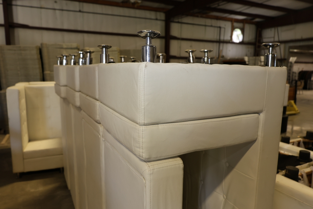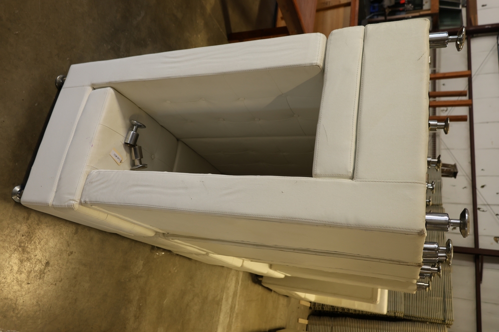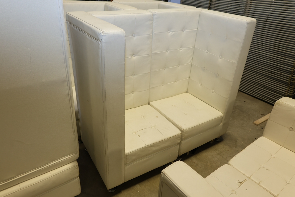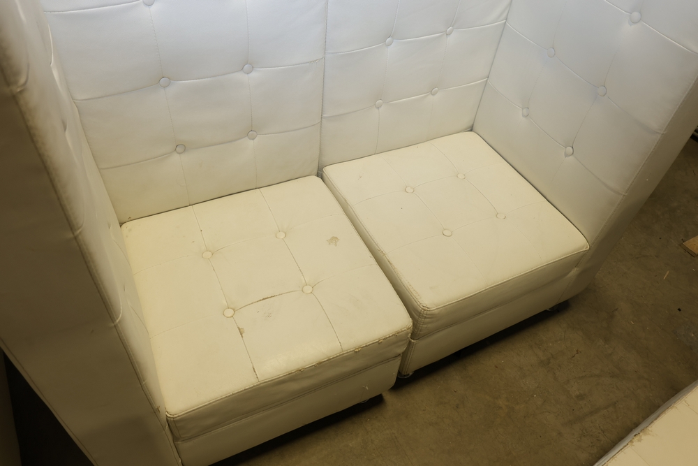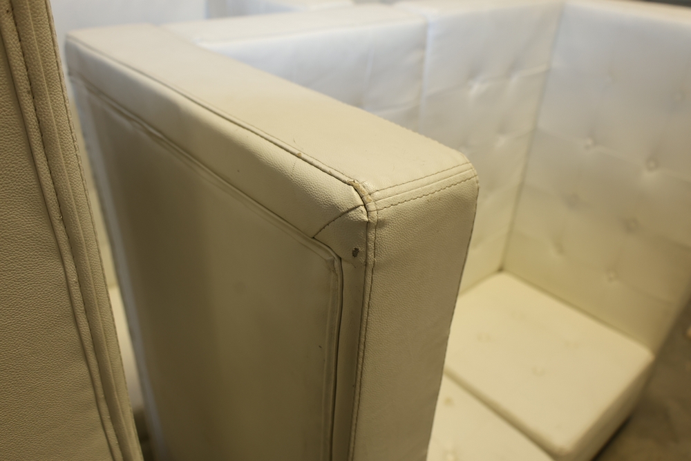 Set of white upholstered modular lounge seating sections with tufted backs and seats, chrome cylindrical legs, approximately 22" x 27" x 52" tall.