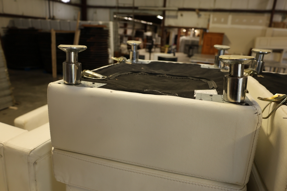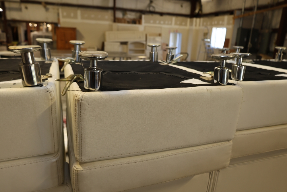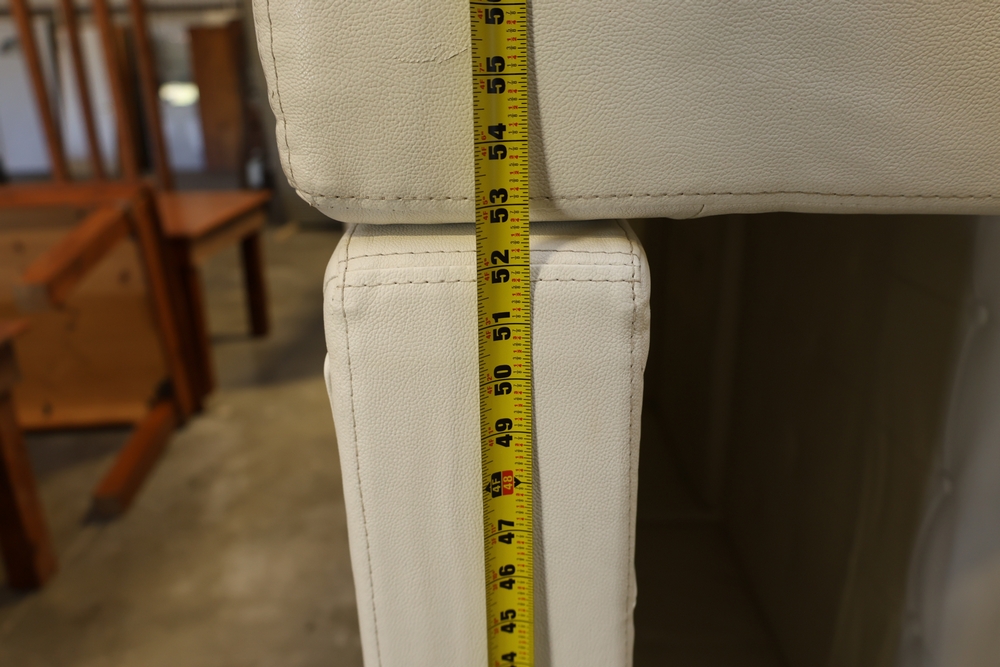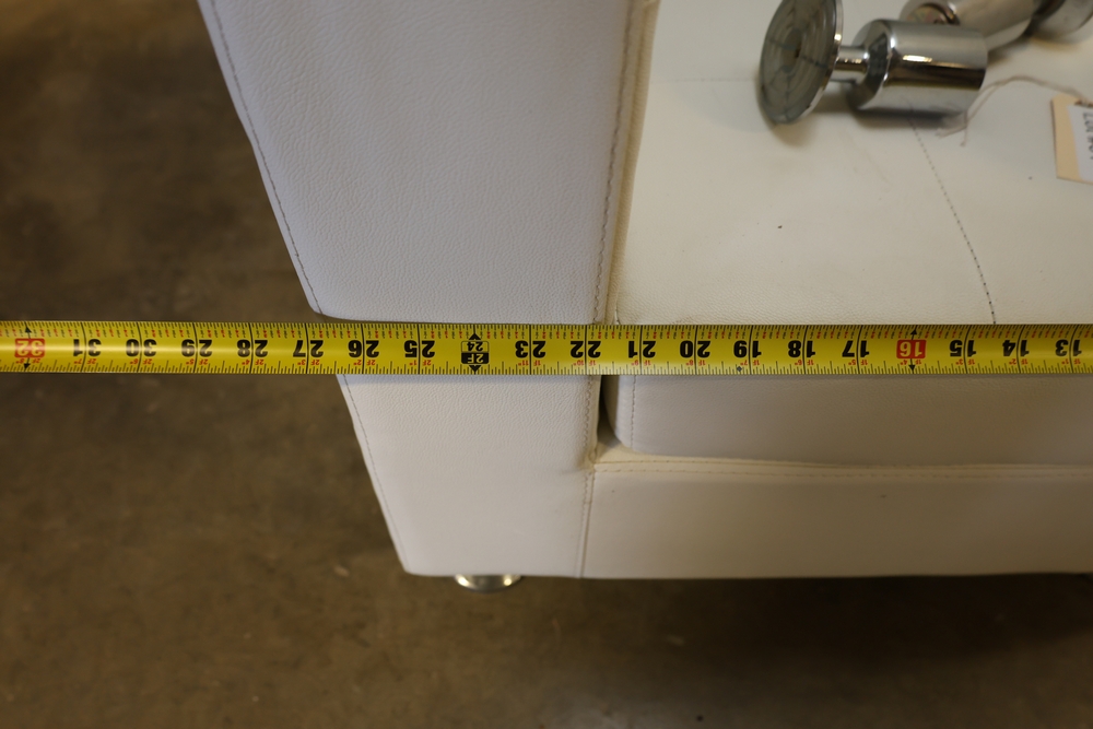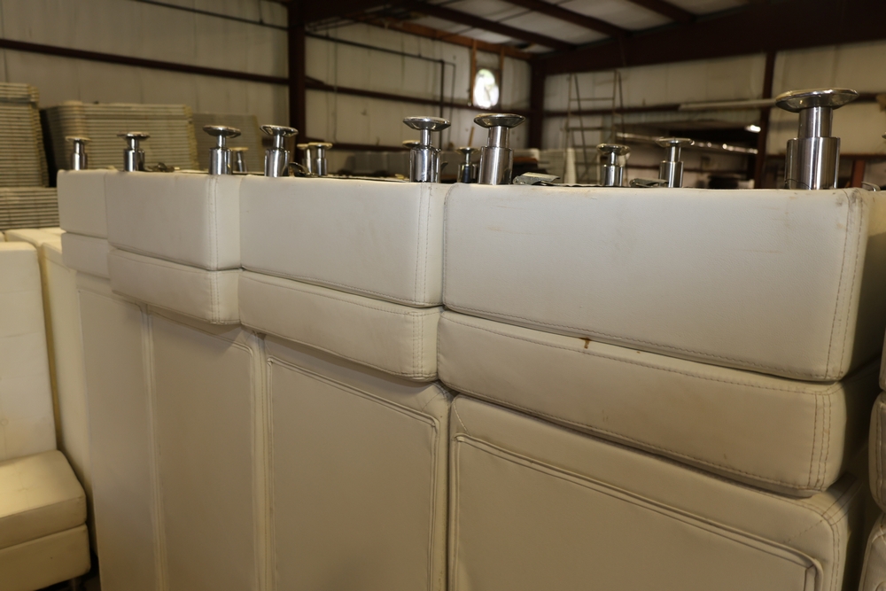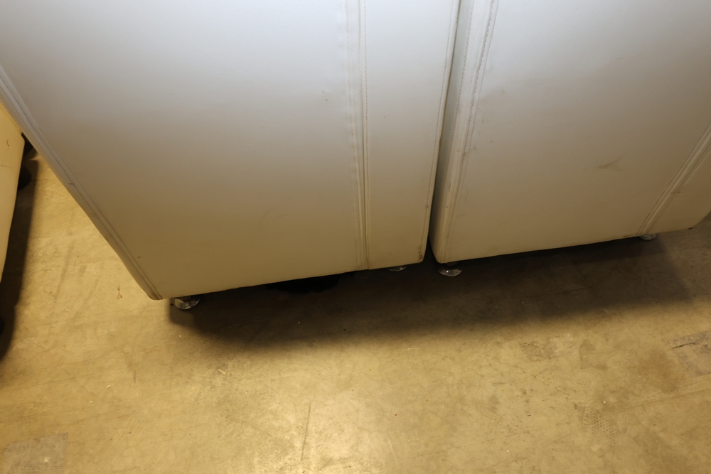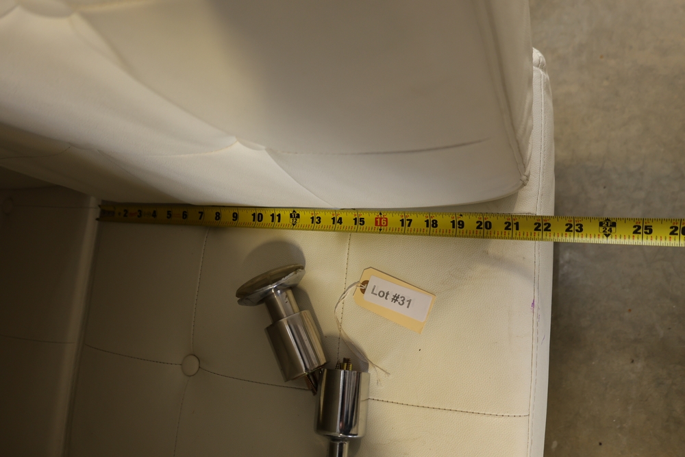 Set of white upholstered modular lounge seating sections with tufted backs and seats, chrome cylindrical legs, approximately 22" x 27" x 52" tall.