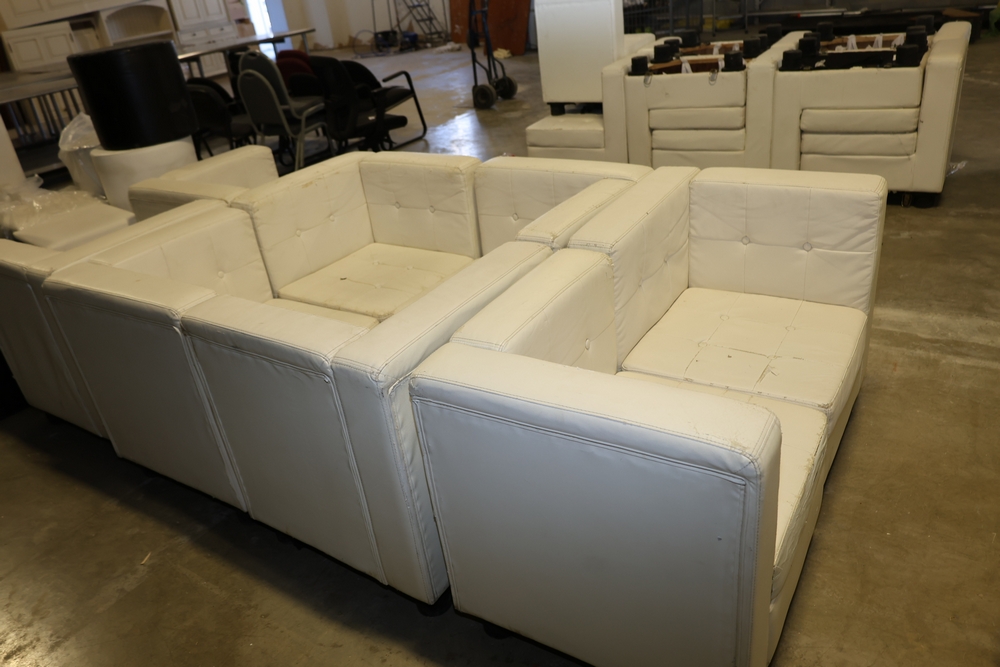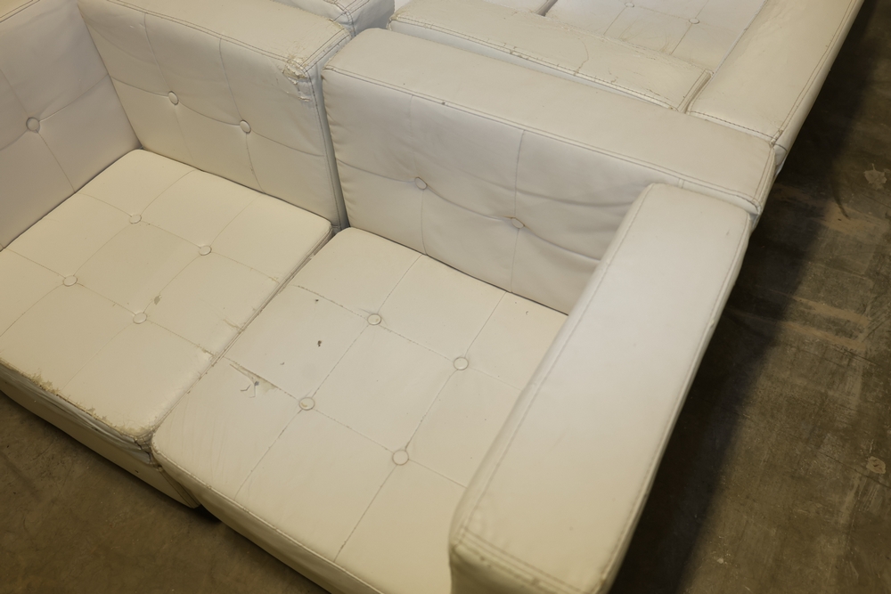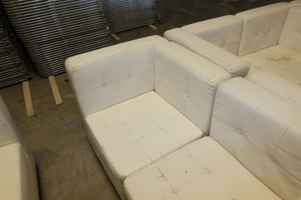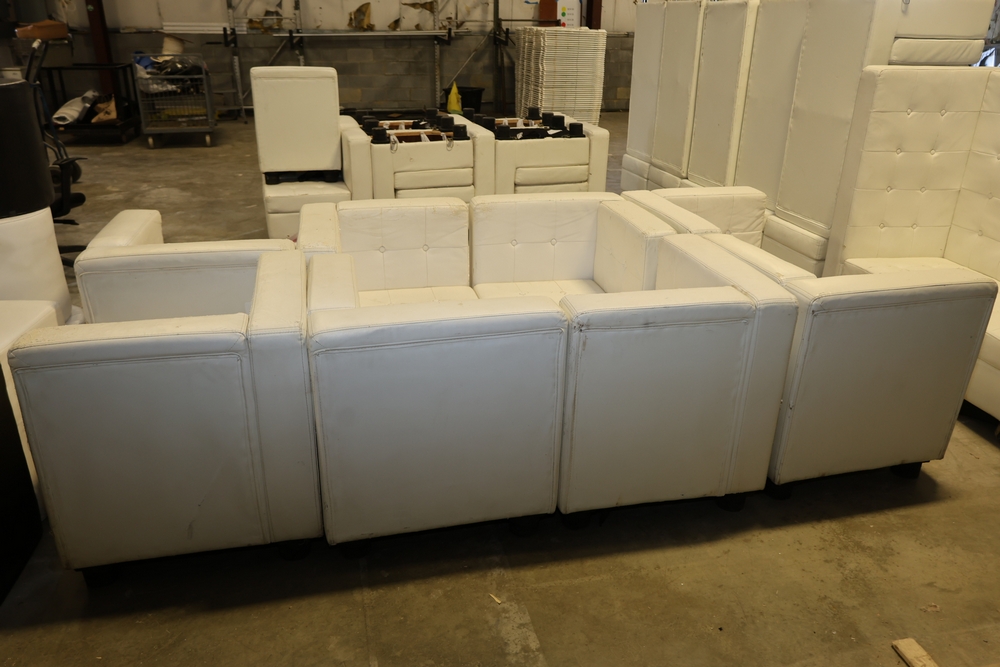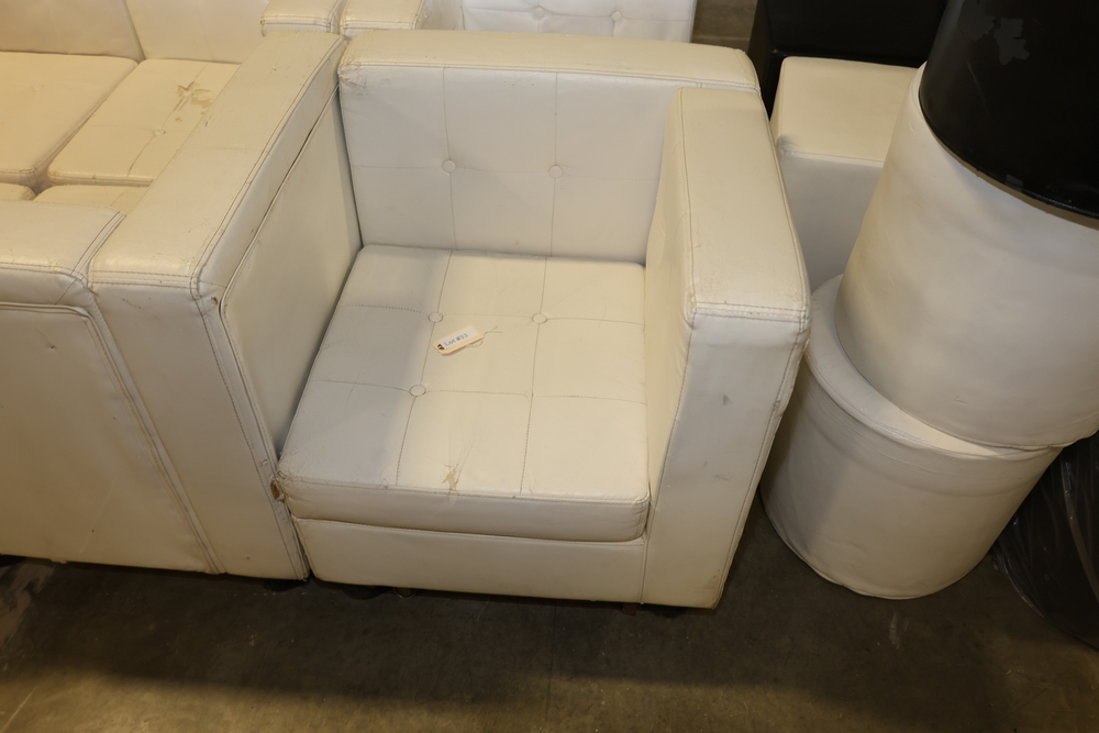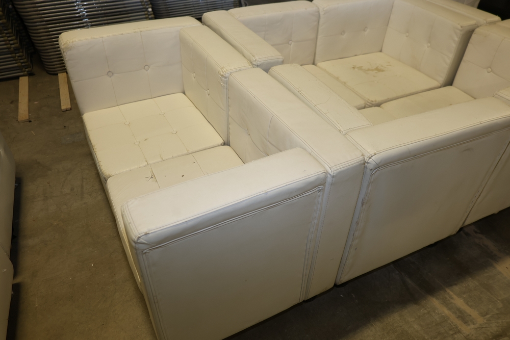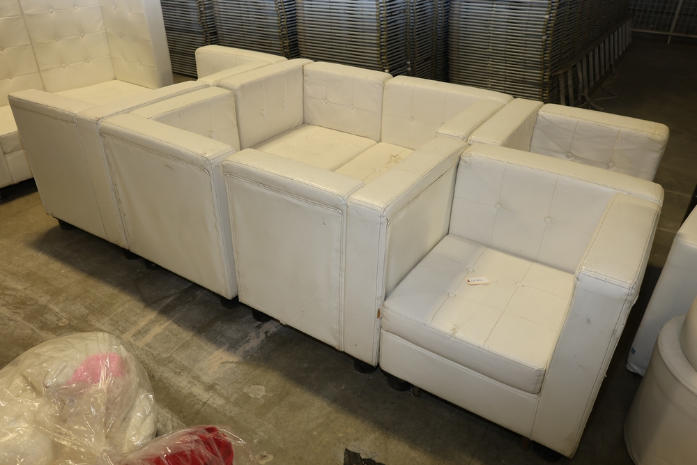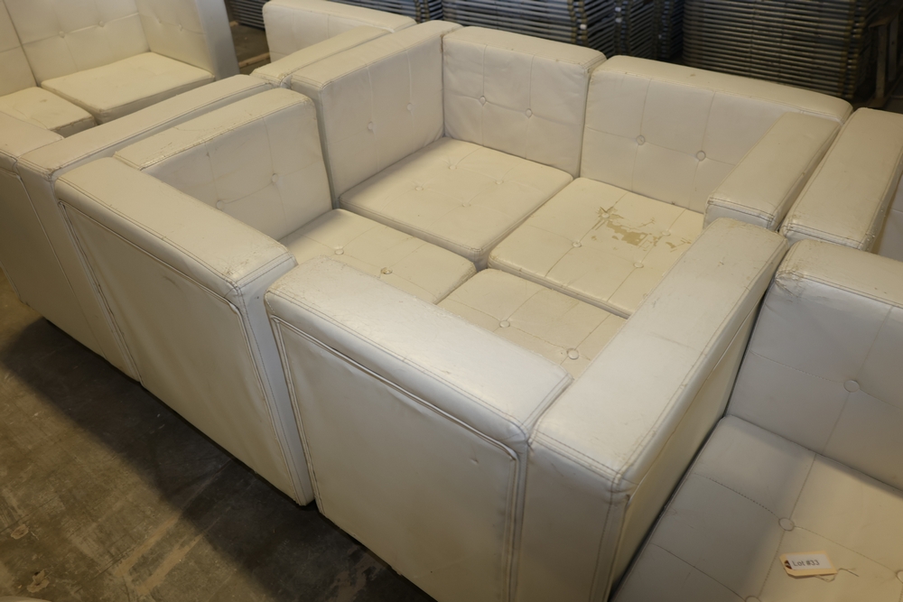 Set of white upholstered modular lounge seating sections with tufted backs and seats, square armrests, approx. 22" x 27" x 31" tall.