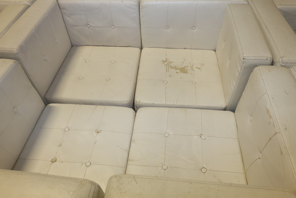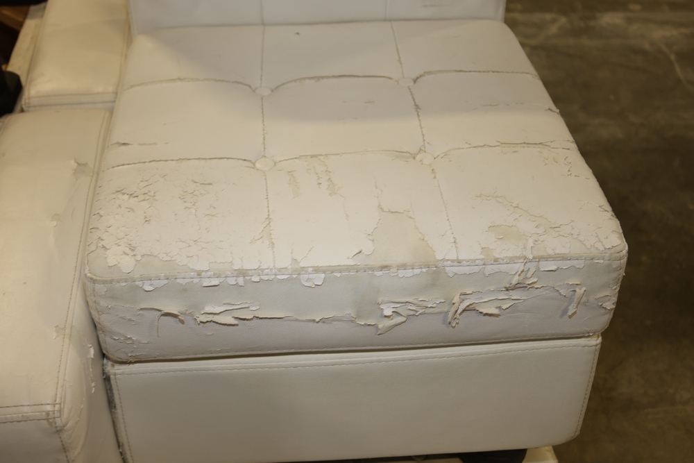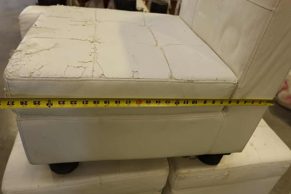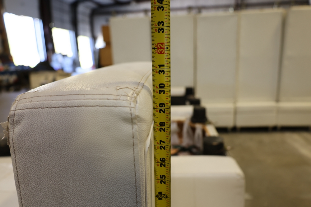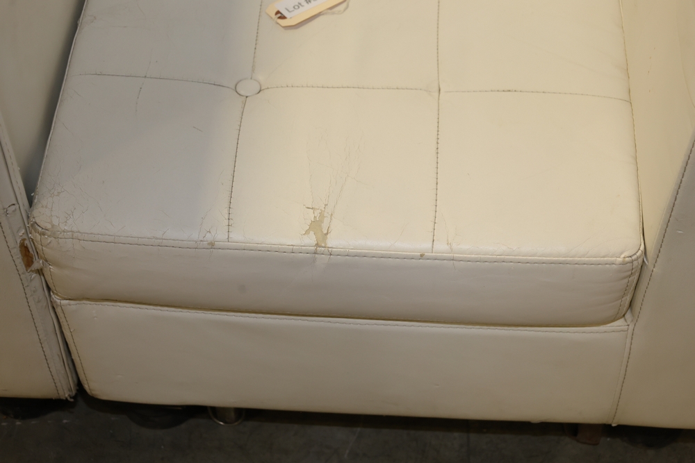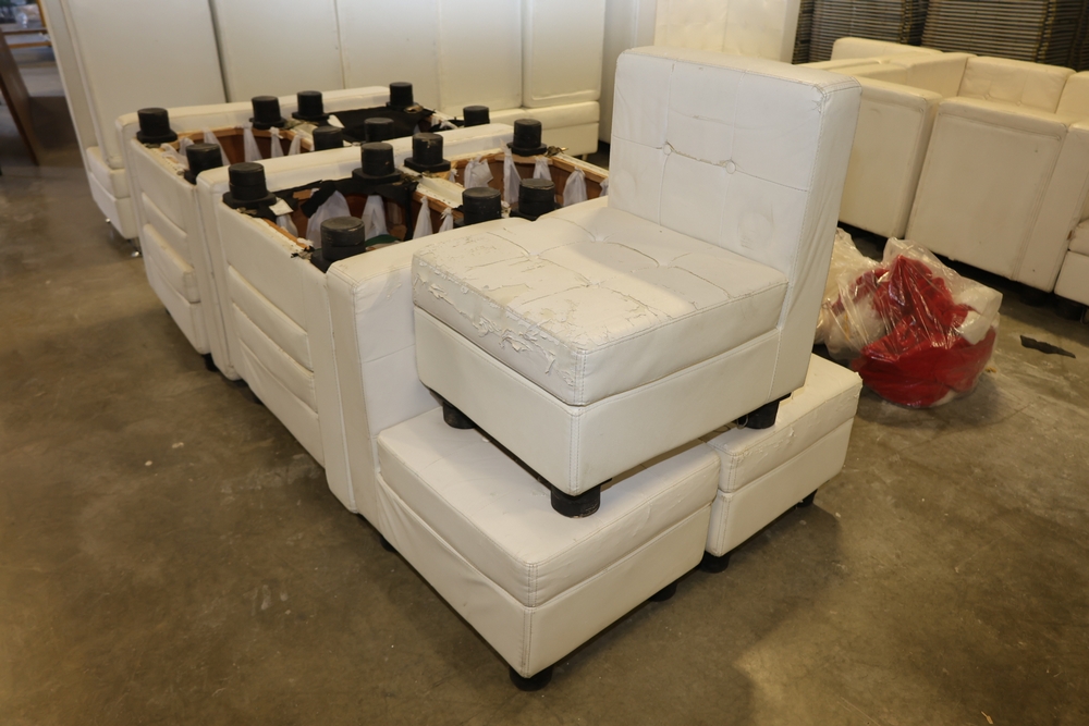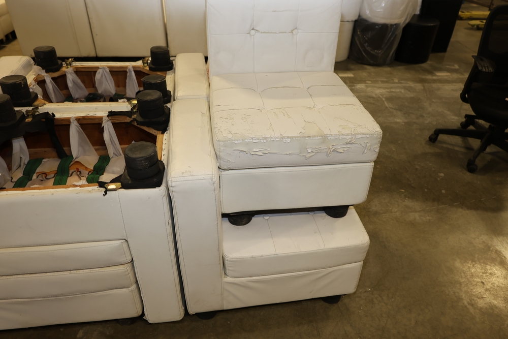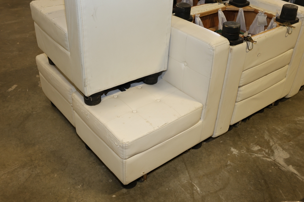Set of white upholstered modular lounge seating sections with tufted backs and seats, square armrests, approx. 22" x 27" x 31" tall.