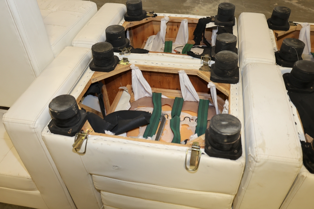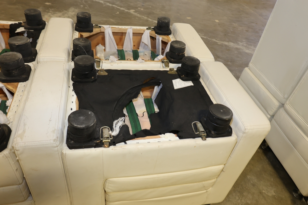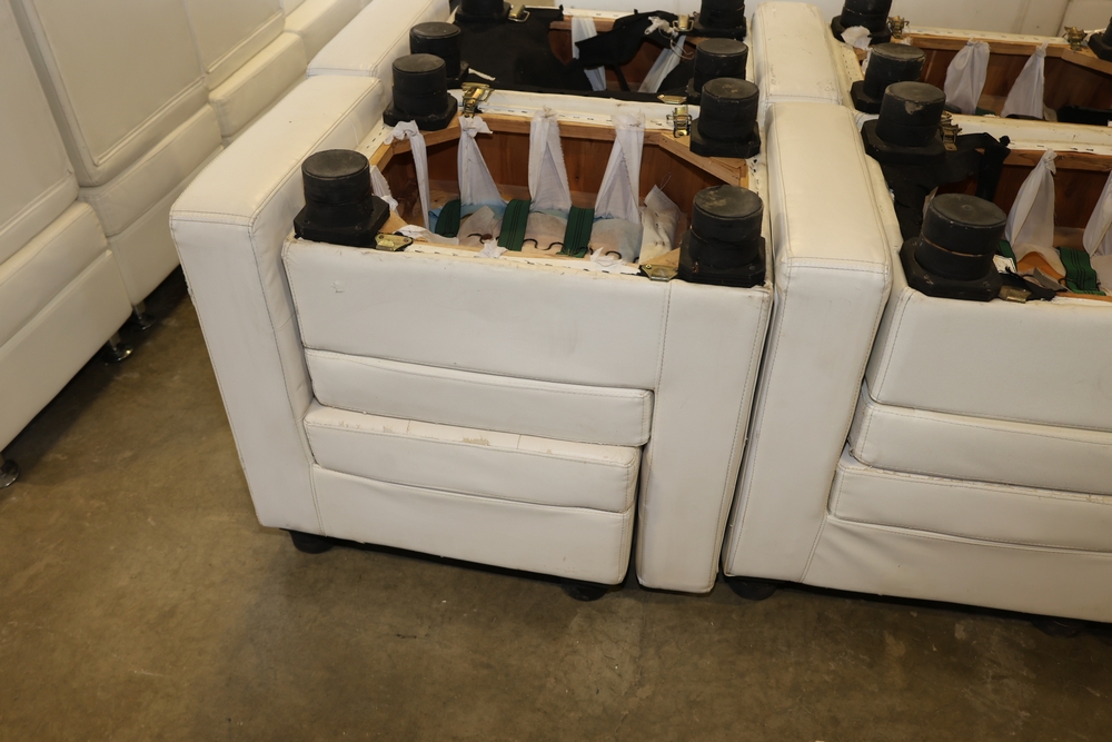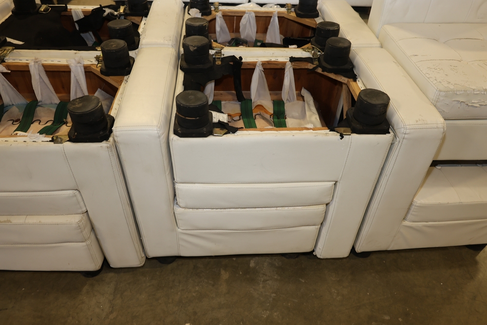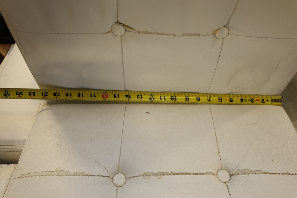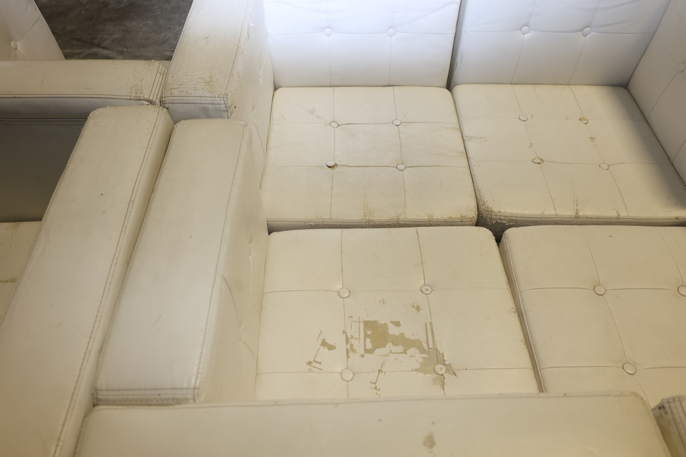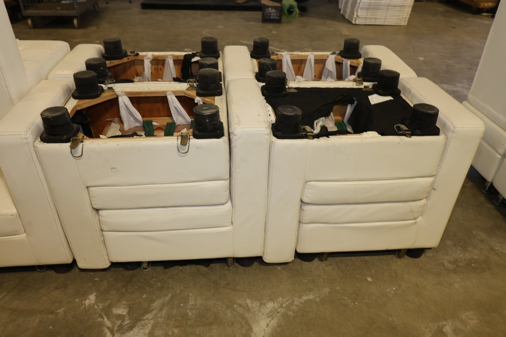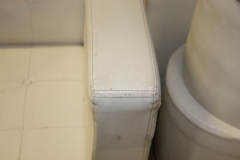 Set of white upholstered modular lounge seating sections with tufted backs and seats, square armrests, approx. 22" x 27" x 31" tall.