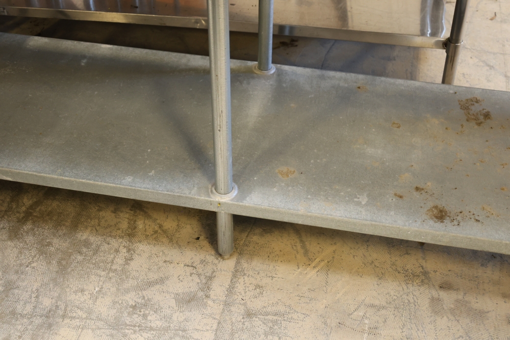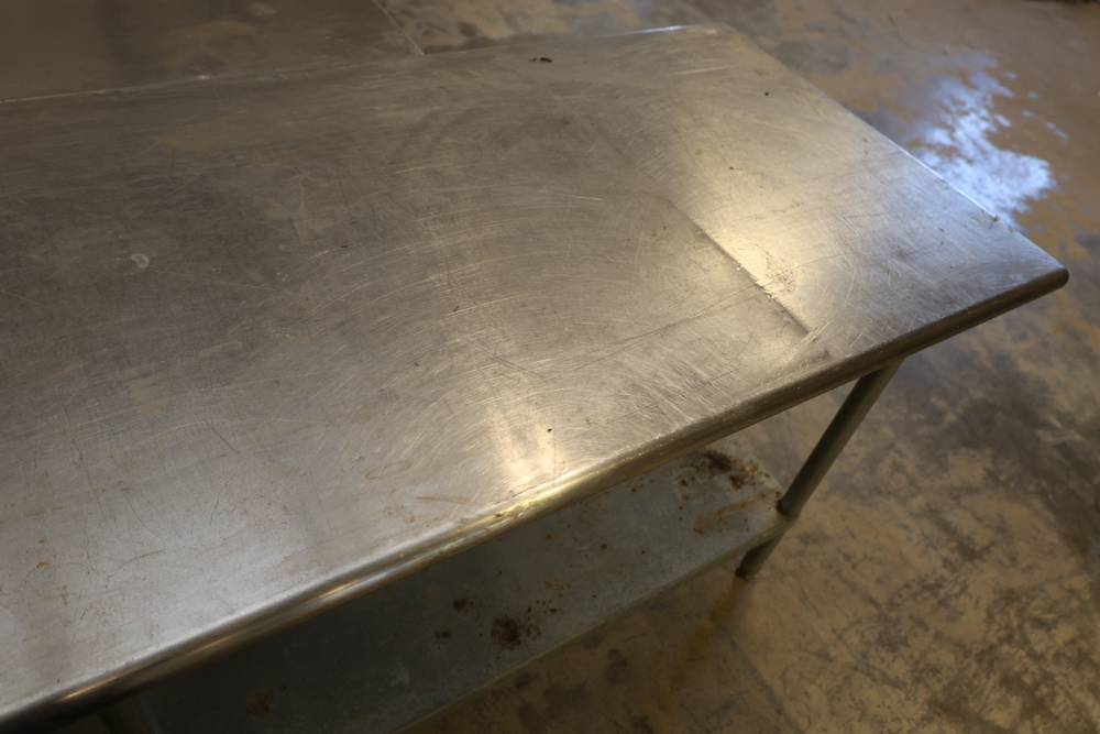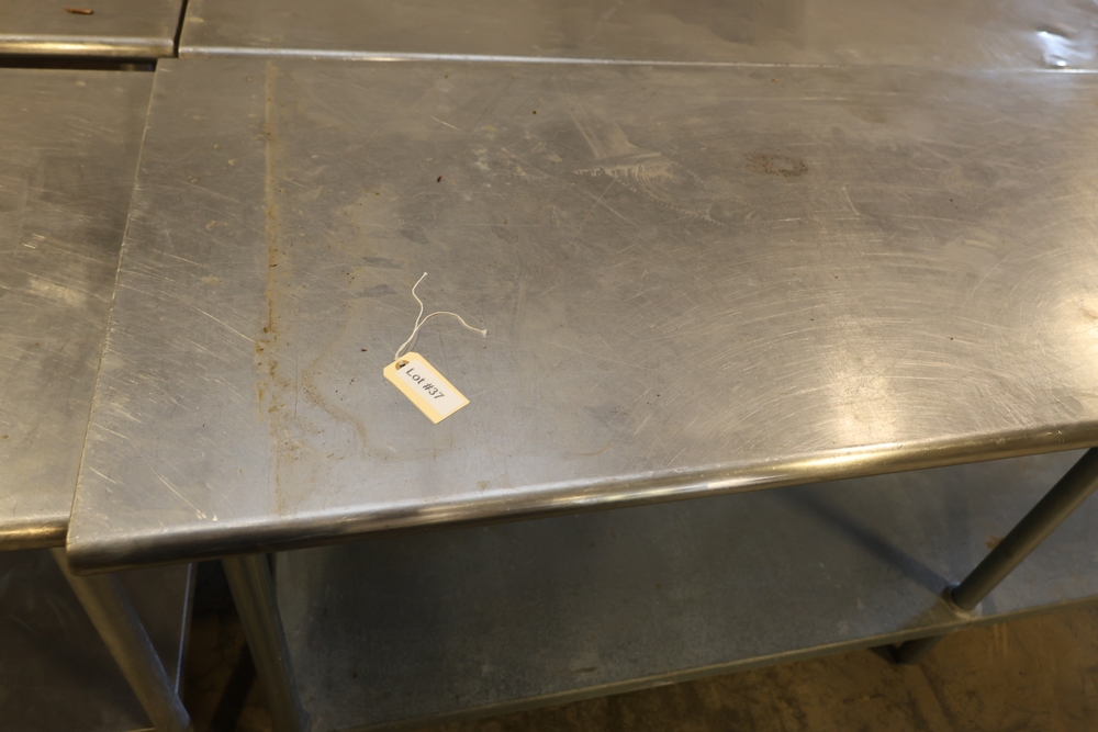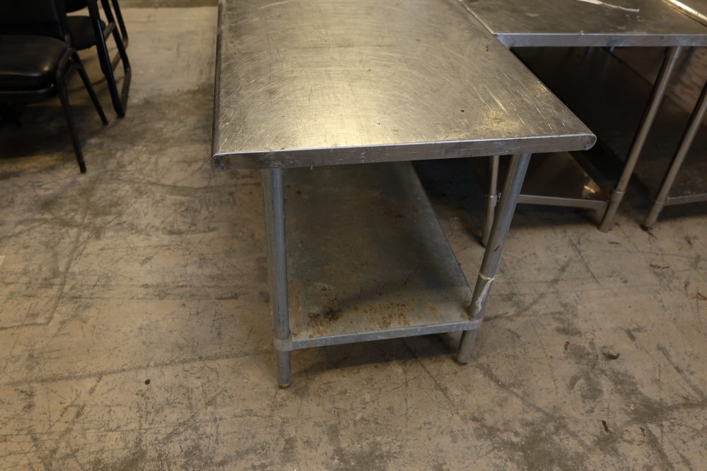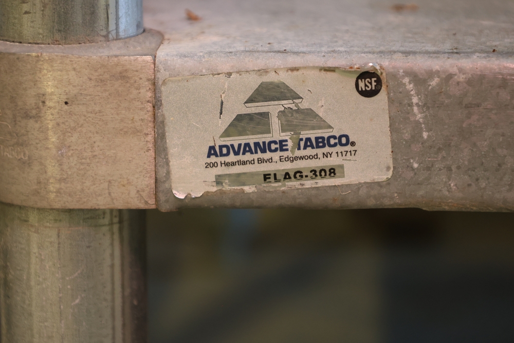 Advance Tabco stainless steel work table with lower shelf, approximately 96 in wide x 30 in deep x 35 in high.