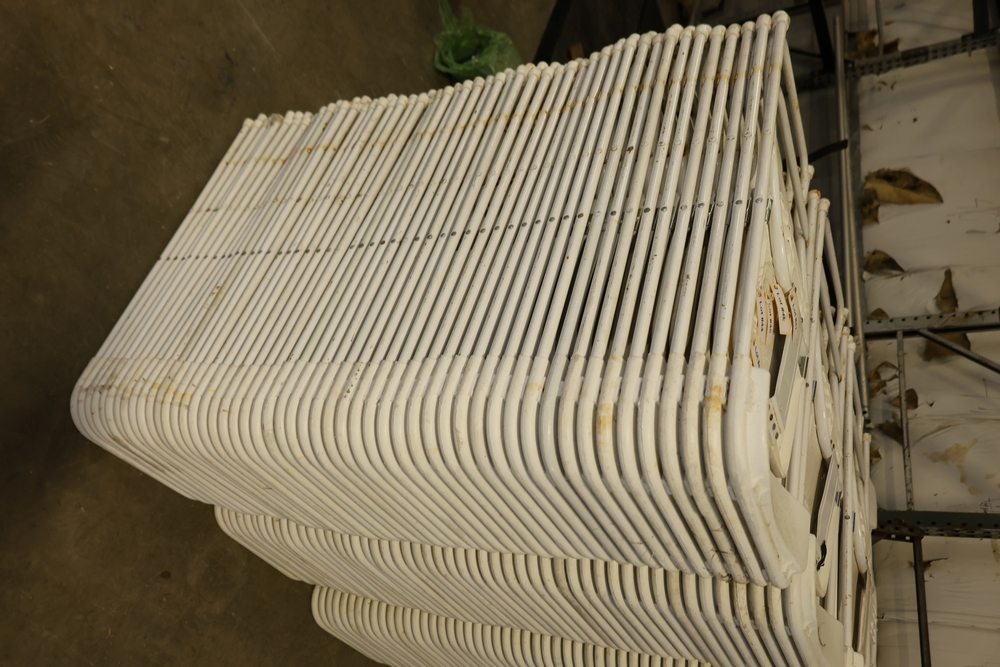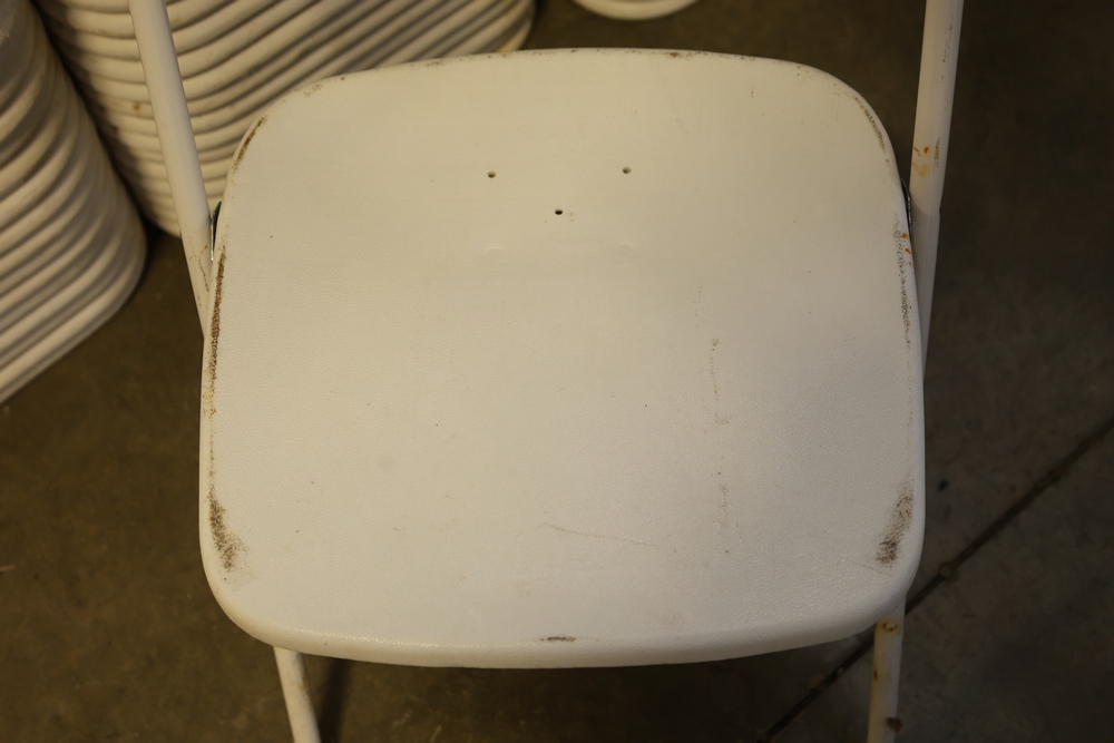 Lot of 200 white metal folding chairs with plastic seats and backs, stackable design; photos are representative, exact condition may vary.