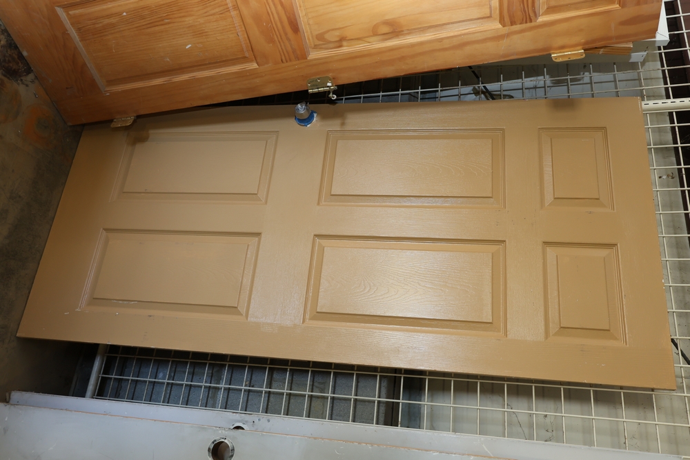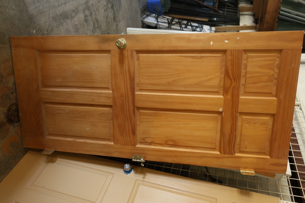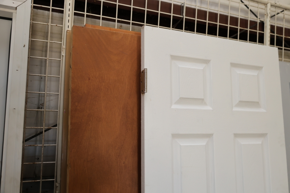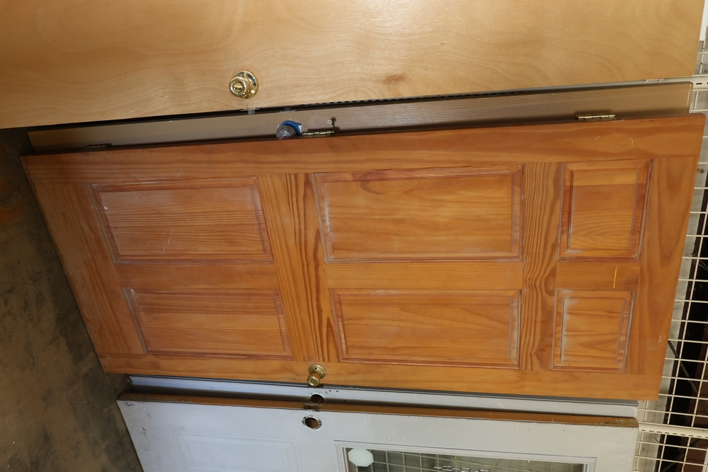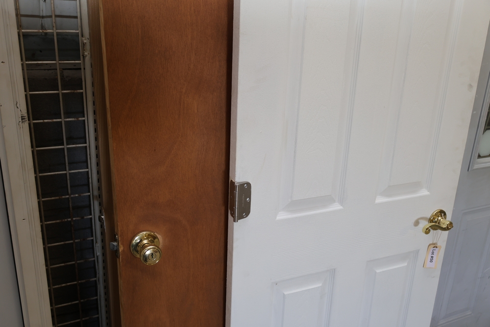 Assorted interior doors including six-panel molded doors and wood veneer slab doors.