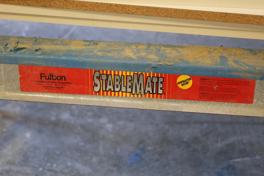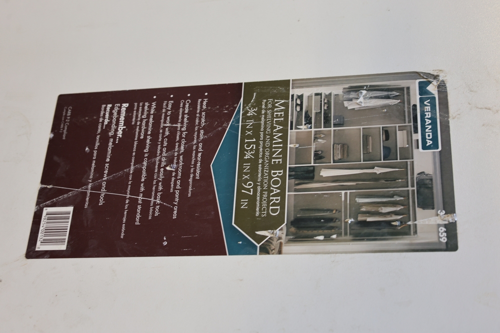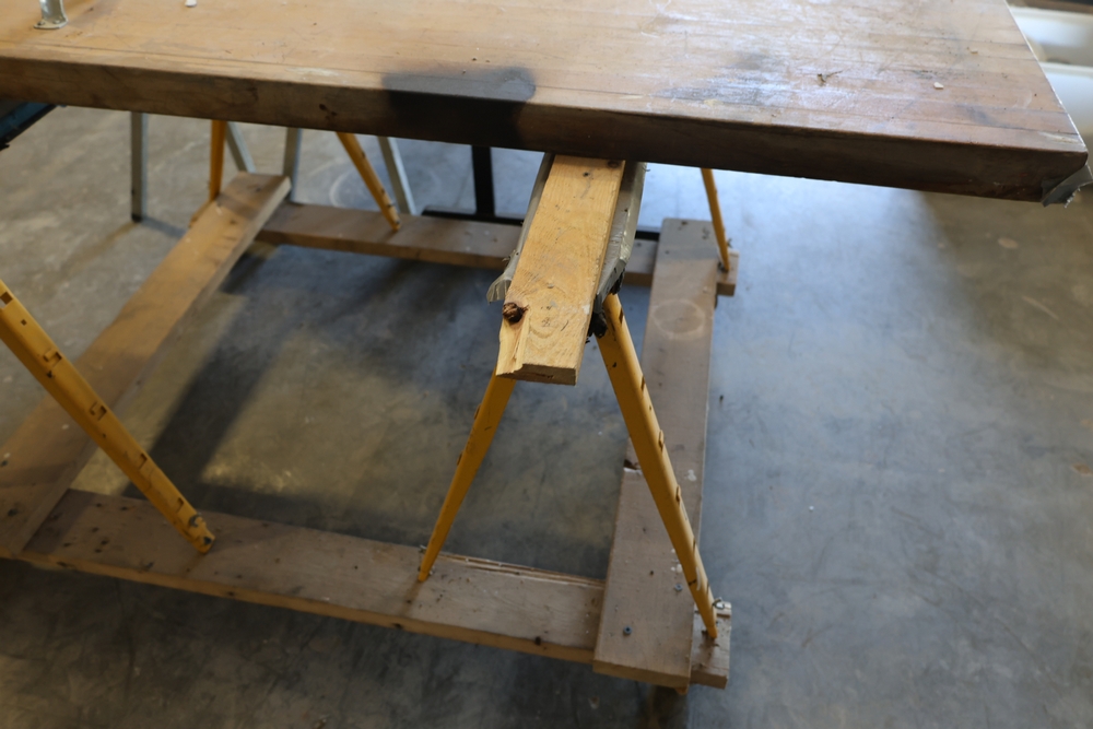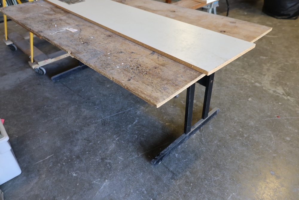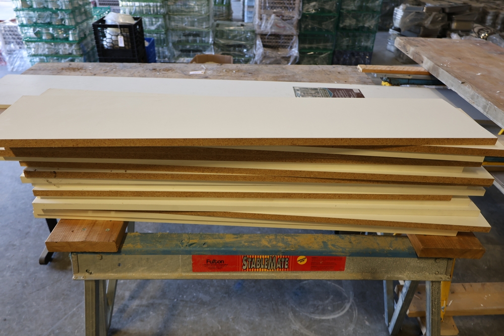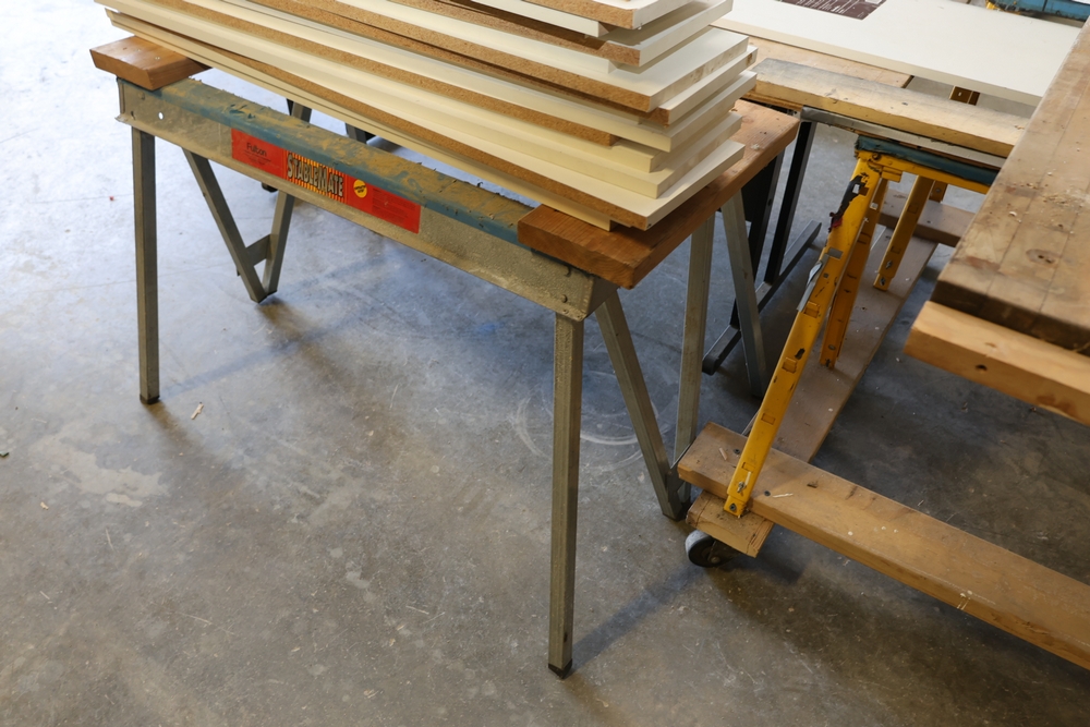 Assorted melamine boards including Veranda shelving boards; includes Fulton StableMate sawhorse and wood work surfaces.