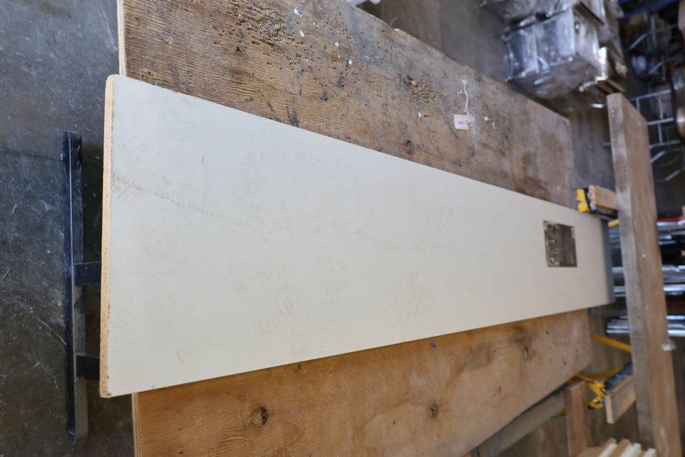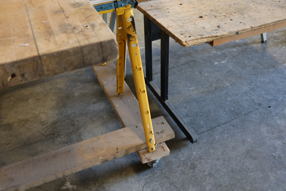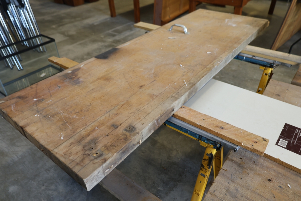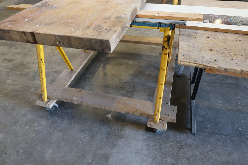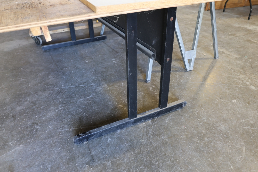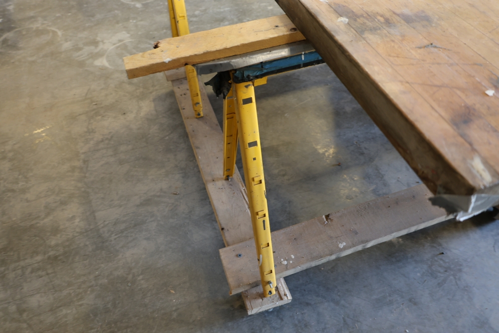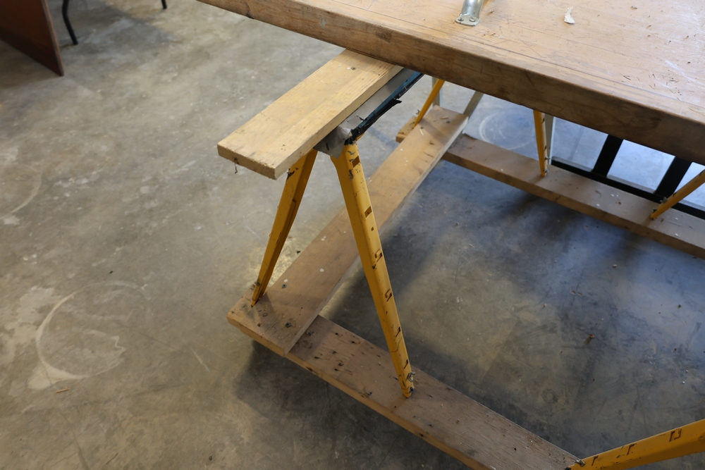 Assorted melamine boards including Veranda shelving boards; includes Fulton StableMate sawhorse and wood work surfaces.