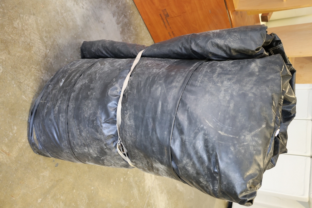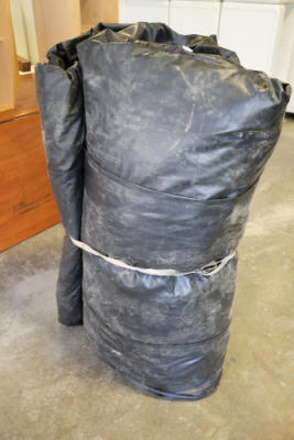 Rolled black & WHITE inflatable cow belly with straps and attached tag marked Cow Belly