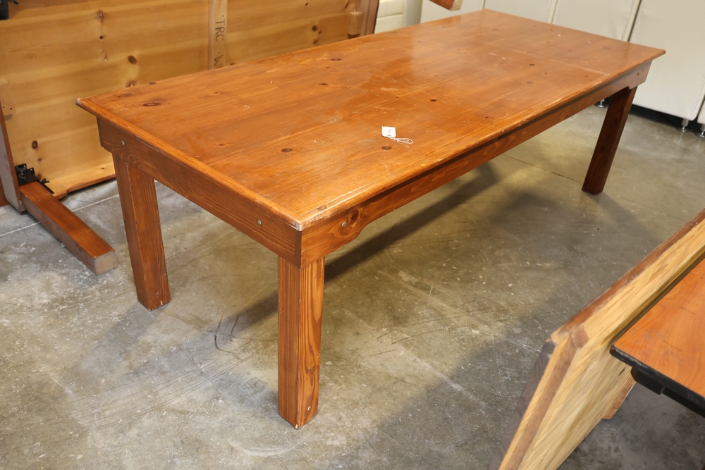Rectangular wooden farm table with plank style top and straight legs, approximately 95 inches long and about 39.5 inches wide.