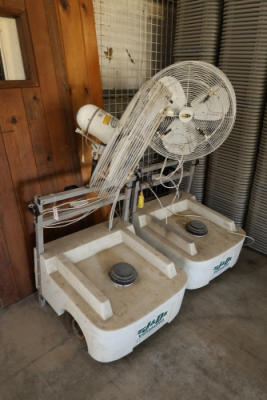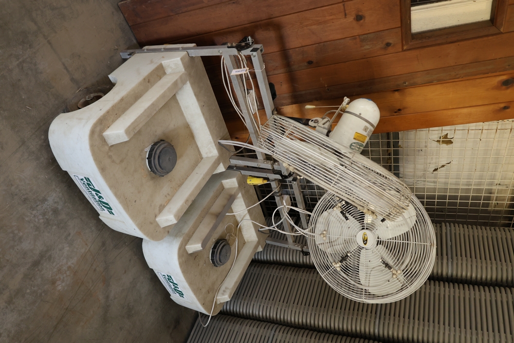 Set of two J&D Manufacturing portable misting fans, model MPC24-POWOSC and OSCW-24H, mounted on wheeled water reservoir bases with adjustable tilt frames and power cords.