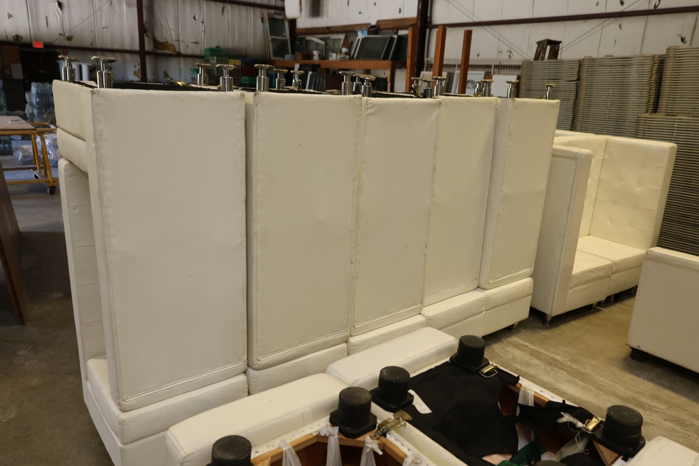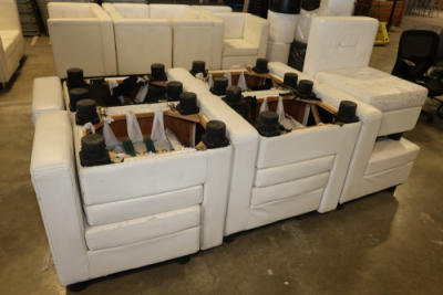 Set of white upholstered modular lounge seating sections with tufted backs and seats, square armrests, approx. 22" x 27" x 31" tall.