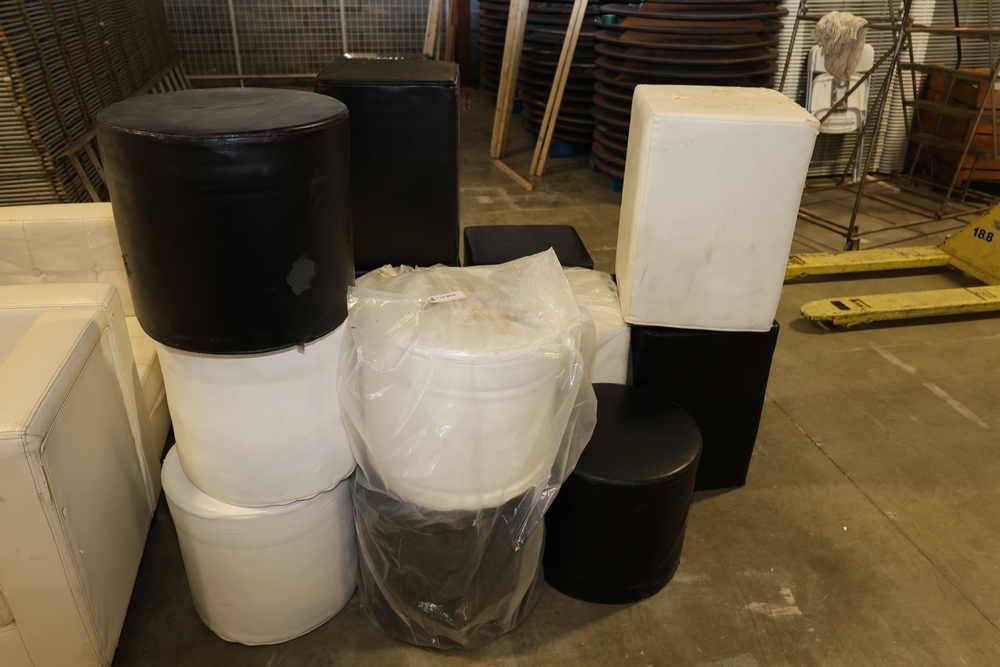 Assortment of upholstered ottomans and stools including round and square forms in black and white finishes, approximately 16 in diameter round units and cube-style pieces.