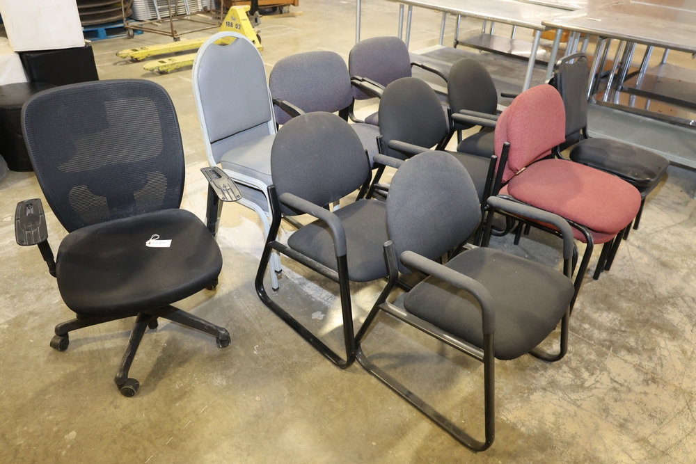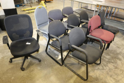 Assorted office chairs including rolling task chairs and stationary guest chairs, with black leather-style executive chairs, mesh-back chairs, and fabric upholstered chairs in black, gray, blue, and red finishes, all with armrests and mixed base styles including casters and sled bases.