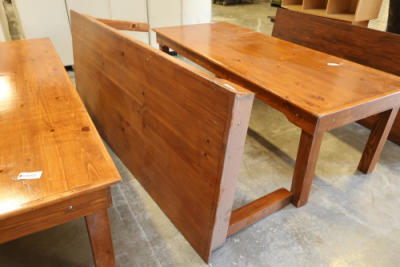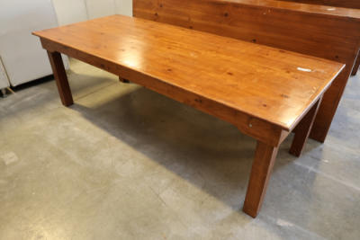 Rectangular wooden farm table with plank style top and straight legs, approximately 95 inches long and about 39.5 inches wide. Missing one leg.