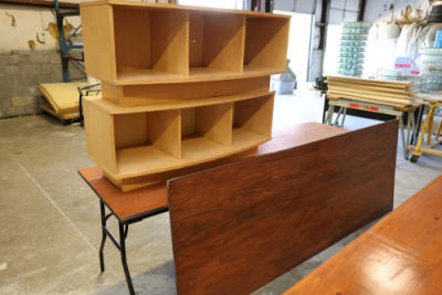 Assorted lot including three 30" square folding tables with metal legs and wood tops, and one 8' folding table. Approximately 30 inches by 20 inches each; two light wood cubby shelf units with multiple compartments approx. 47" x 19" x 19"; and one 8' rectangular wood panel.
