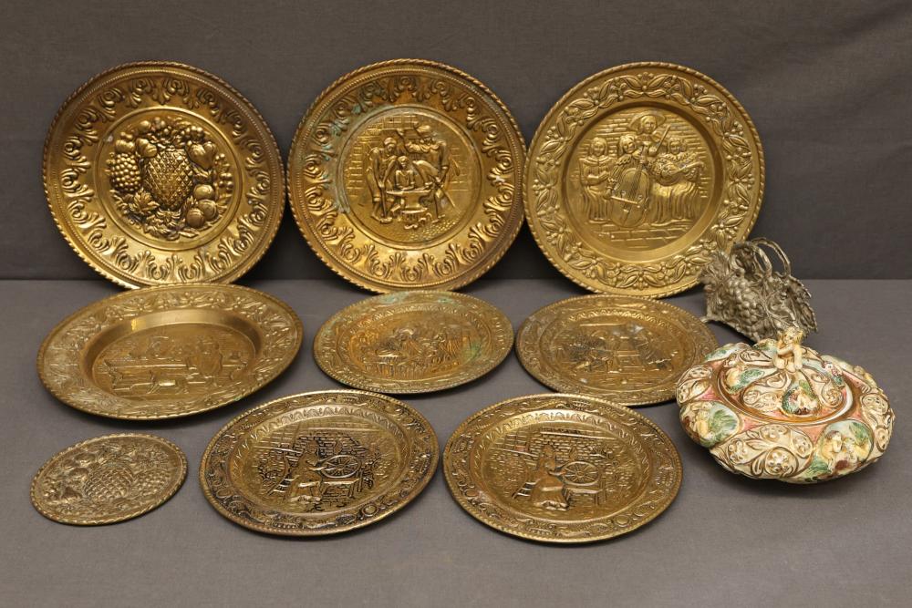 Decorative Brass Plates, Ceramic Lidded Dish with Putti, and Metal Grape-Themed Letter Holder. Set includes embossed brass hanging plates depicting various scenes and motifs, a ceramic lidded dish marked 'Bassano,' featuring painted floral and figure designs accentuated with a putti, and a cast metal letter holder with grape cluster and leaf designs, marked 'Godinger Silver.' Pickup only.