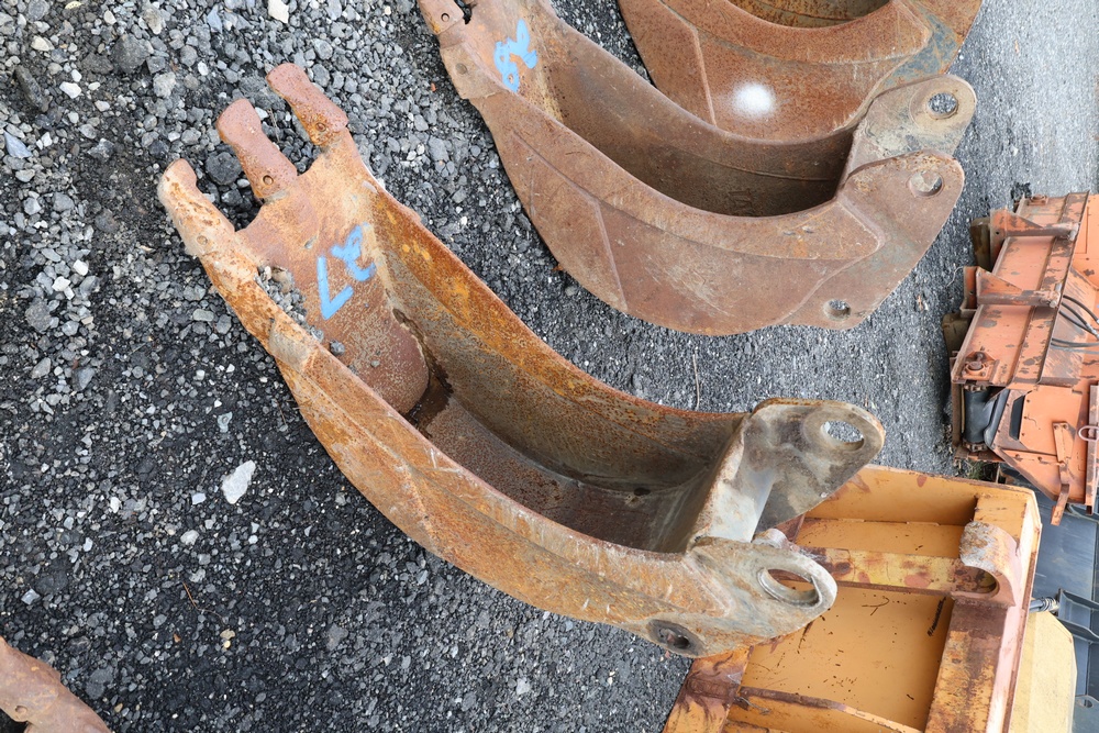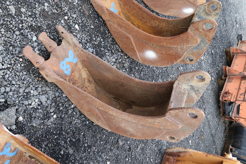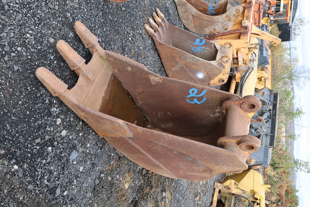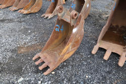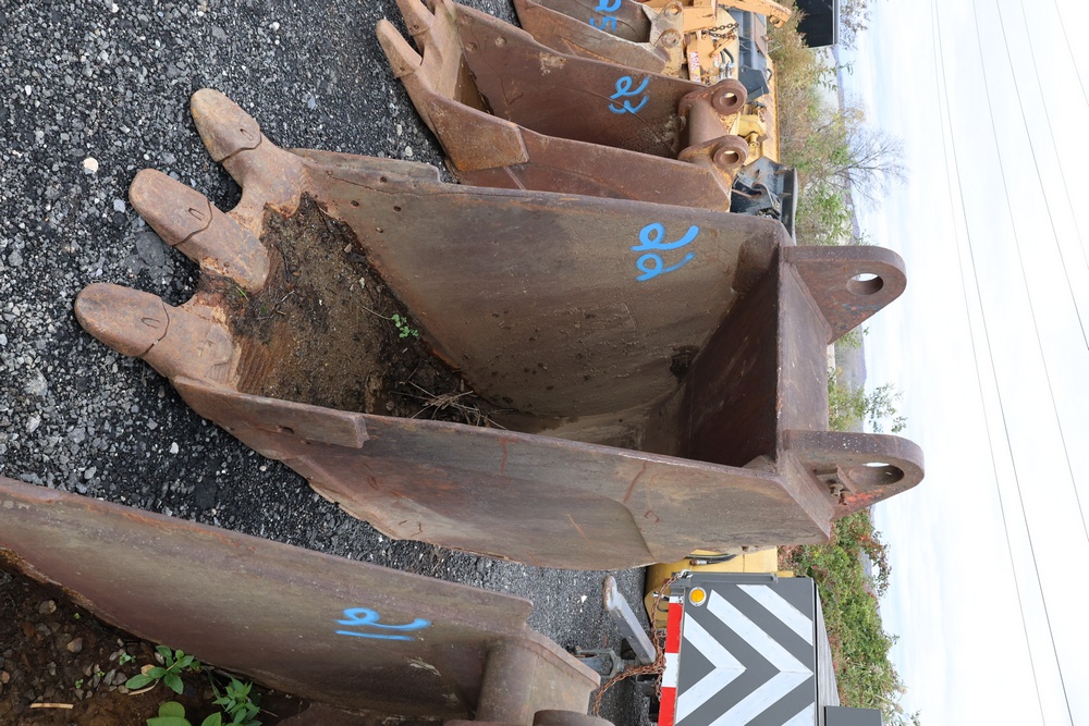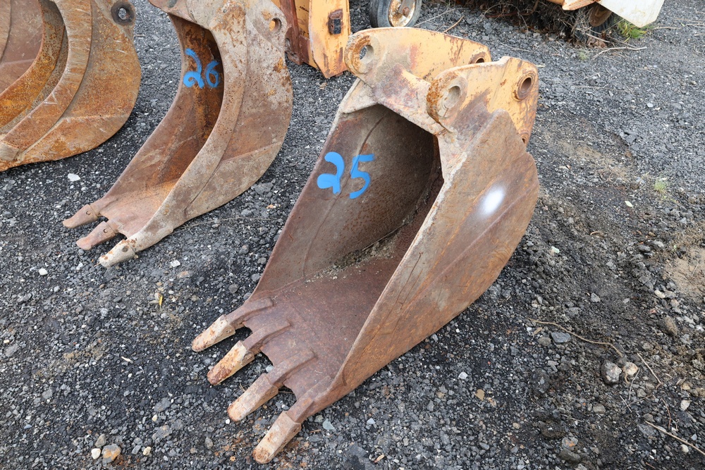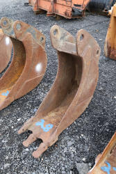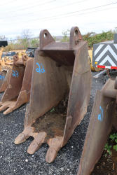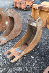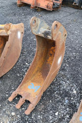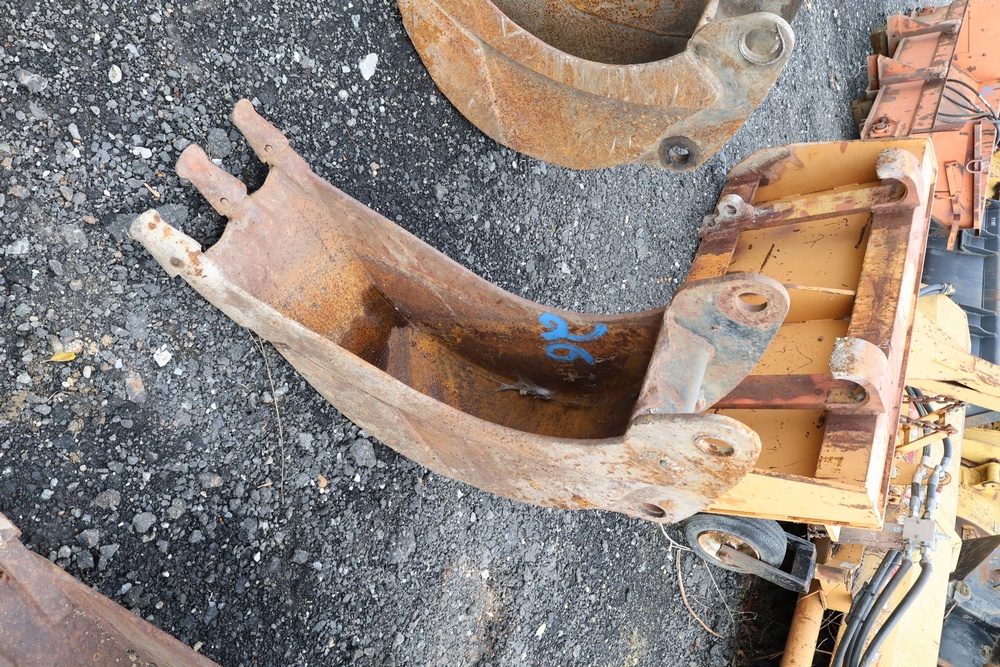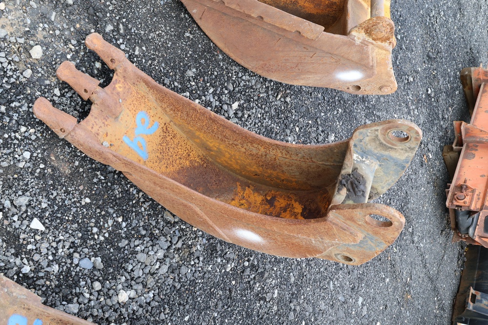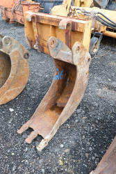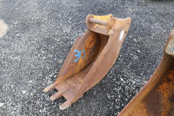Trenching bucket constructed of steel, featuring a narrow width and an angled profile suited for utility and cable installation work. The front cutting edge is fitted with three teeth, and the top mounting structure utilizes a pin-on style bracket complete with connecting pins. The attached identification plate specifies compatibility with CAT 416C, 426C, 436C, 428C, and 438C model machines, indicating a width of 305 mm or 12 inches and a capacity of 0.07 or 0.09 yd
