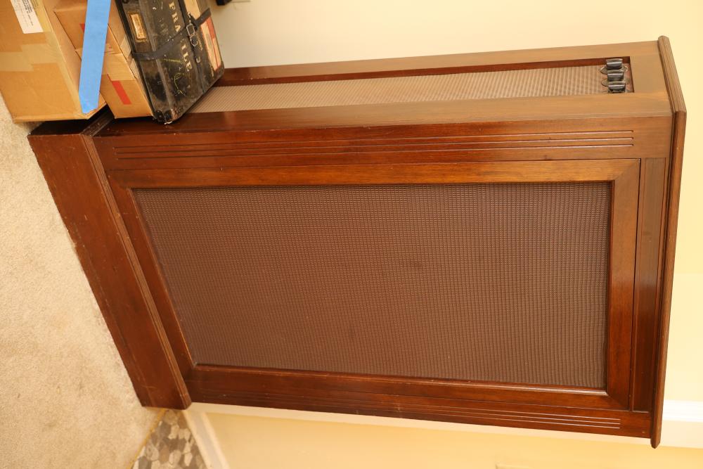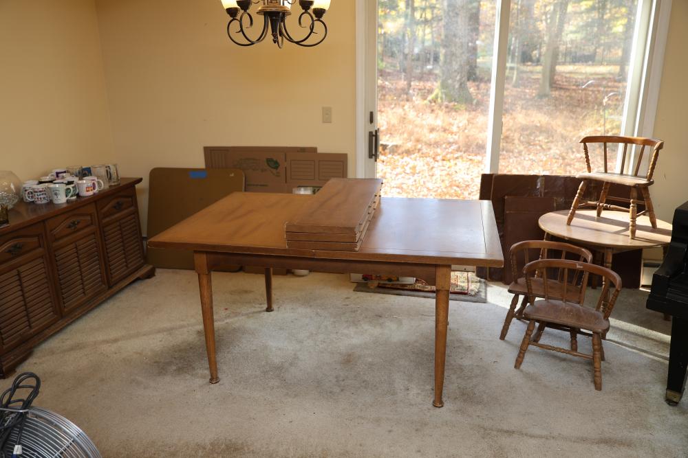 Dining Table with Insert Leaves, Round Table, Spindle-Back Chairs, and Three-Door Buffet Table. Includes an expandable rectangular dining table with three insert leaves 60in 40in x 30in, a round wooden table with spindle legs 30in x 23in, three spindle-back wooden chairs, a three-drawer wooden utility cabinet with hinged doors, and a three-door wooden buffet table with slatted front doors and interior shelving 50in x 17in x 30in. Buyer is responsible for all help and materials necessary for safe and proper removal. Buyer must take all. Pickup only.