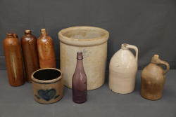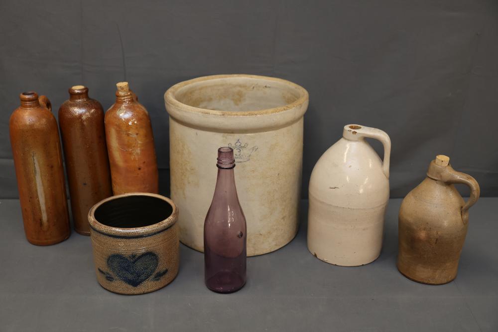 Stoneware Jugs, Crocks, and Bottles. Includes a large cream-colored crock, three brown stoneware bottles with corks, one small crock with cobalt heart design, two stoneware jugs including one with a white glaze and the other with a natural finish, and one slender amethyst-colored glass bottle. Pickup only.