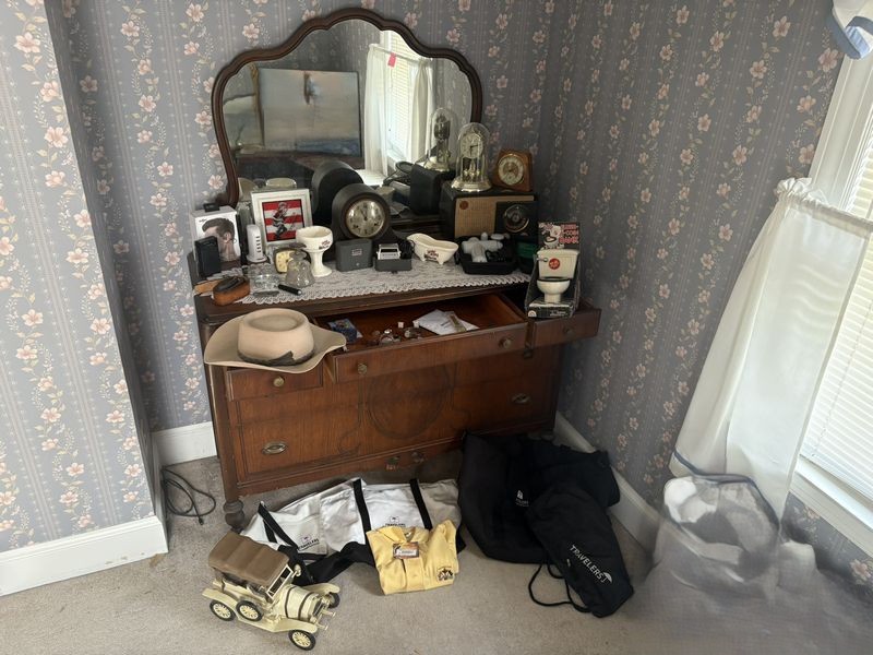 Antique Dresser, Collectibles. Man's antique dresser, 4'Wx21"Dx3'H with dovetailed drawers; attach mirror, 3'Wx31"H; many collectibles, incl: The New Haven Clock Co. mantle clock, 19.5" base x 10"H; other items on dresser. Loc on 2nd fl.