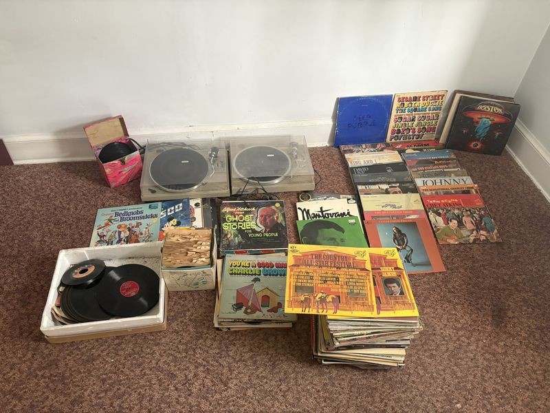 Vintage Electronics. Two turntables; assorted albums (all genres, many classics); 45's (records); other related items. Loc on 2nd fl.