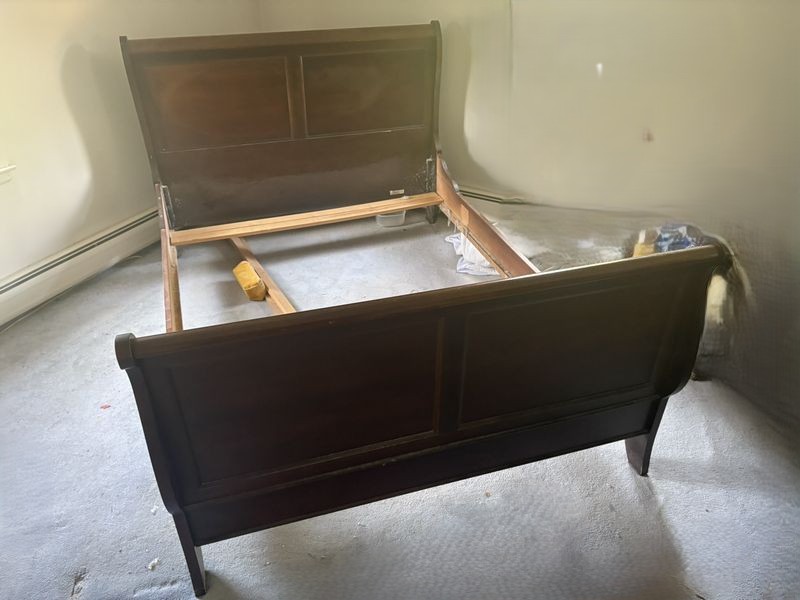 Modern Sleigh Bed, US Made. Bedframe only: headboard, 62"Wx46"H & footboard 38"H. Made in USA. Requires dusting. Loc on 2nd fl.