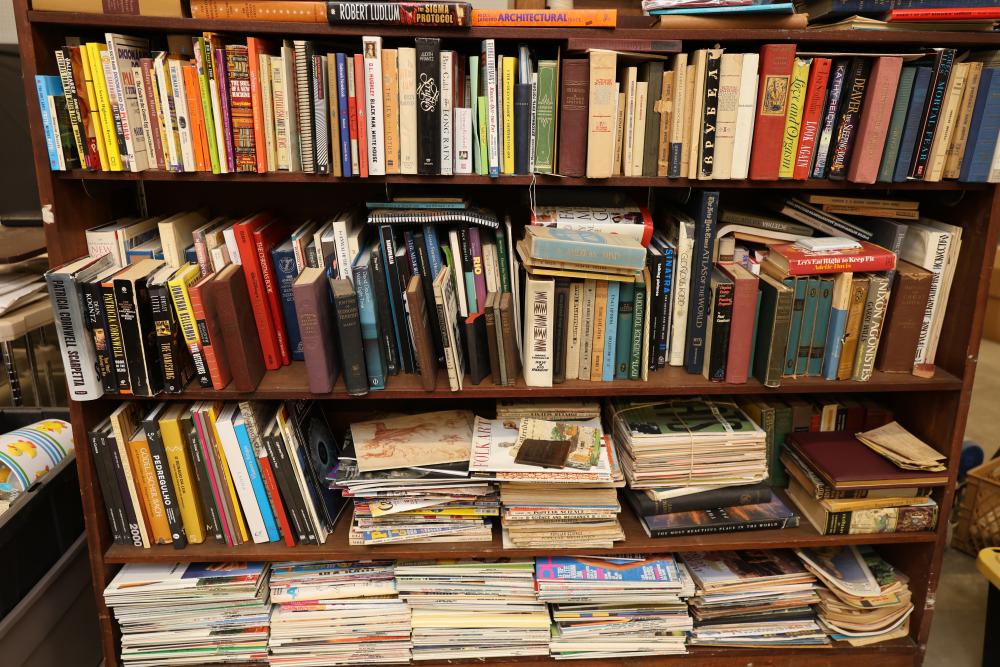 Books and Magazines Featuring Topics Including Art, Mystery, History, Architecture, and Fitness. A mix of hardcovers, paperbacks, and bound periodicals displayed on shelves. Includes titles from various genres and subjects, featuring fiction, non-fiction, and specialized topics. Pickup only.
