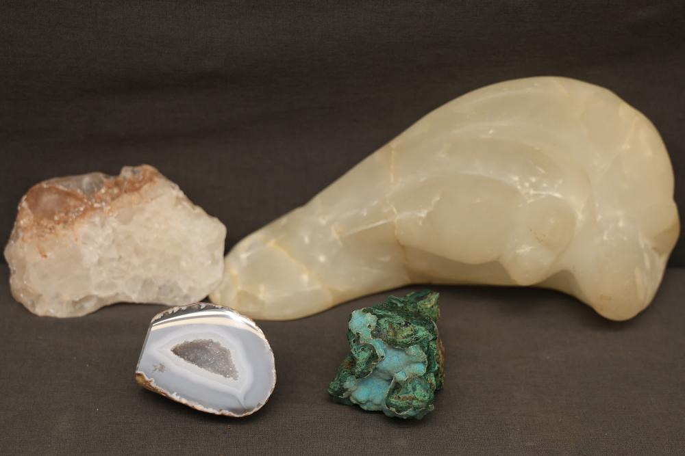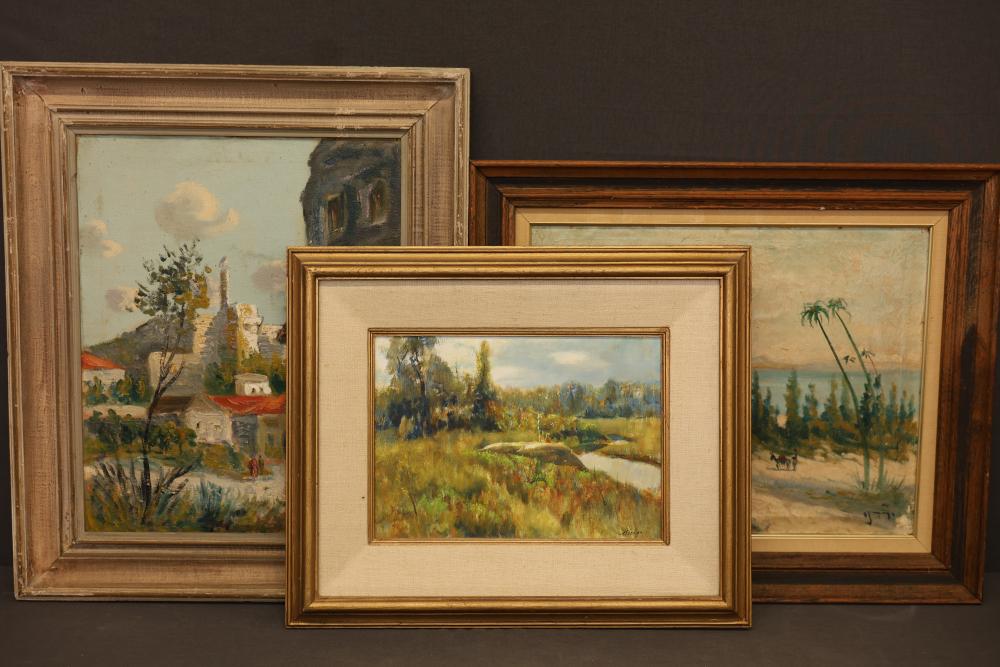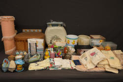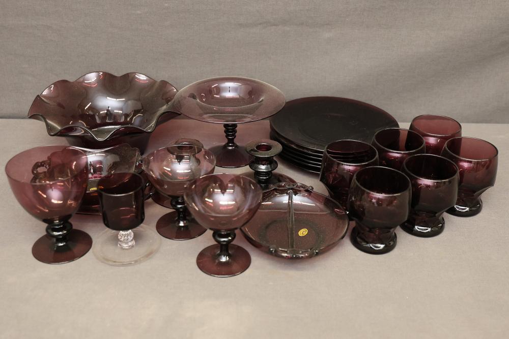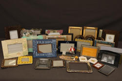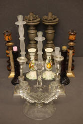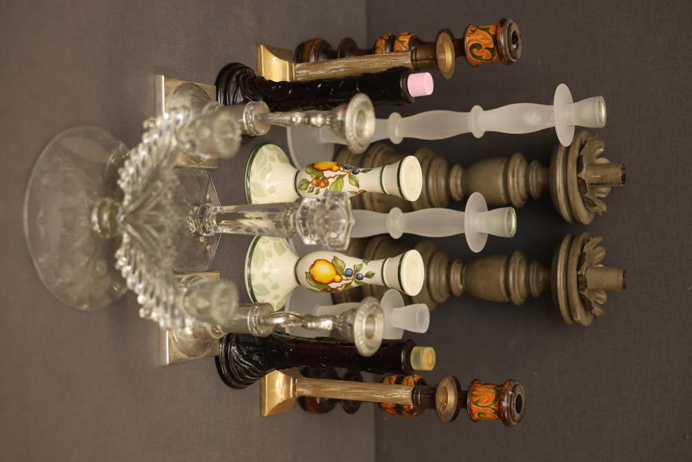 Candle holders in glass, metal, ceramic, and wood. Includes various designs and finishes, including frosted glass, silver-tone metal, hand-painted ceramic with fruit motifs, carved wood, and pressed glass. Several single holders and one double-light pressed glass holder. Pickup only.