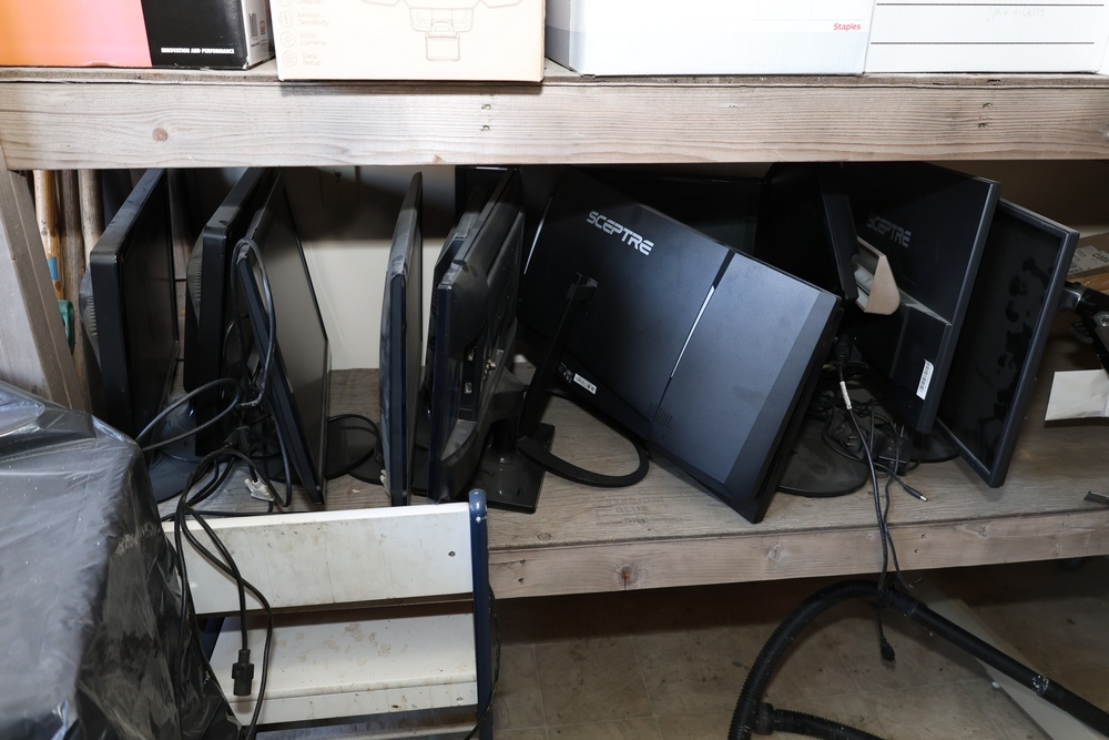 This lot includes a group of computer monitors from various manufacturers, including Sceptre, ASUS, HP, and Samsung. The collection contains several models such as the Sceptre B30 and F27, ASUS VS248H-P, HP S2031, and a Samsung unit manufactured in 2014. These monitors vary in size and design, with most featuring standard HDMI, VGA, or DVI connections. The units are stored together on shelving, with power cords and stands visible. Overall, the lot represents a mix of functional and potentially usable display equipment suitable for desktop computer setups or general office use.
