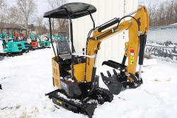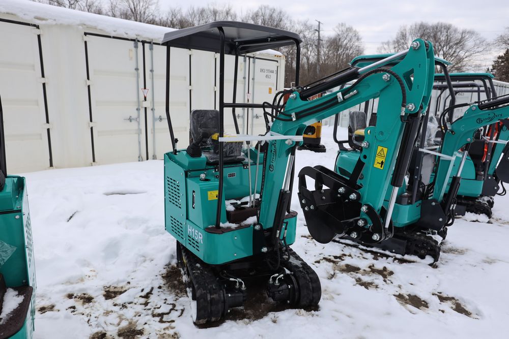 New 2026 CFG Industrial gas powered mini Excavator model H15R with 420cc gasoline engine, bucket, 4' long tracks, 38.5" wide base, 6" wide tracks, canopy, hydraulic boom & bucket controls, pilot system, thumb, dozer blade. Hours reading less than 1 hour.