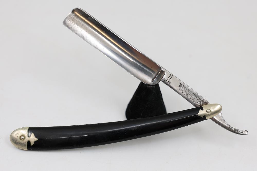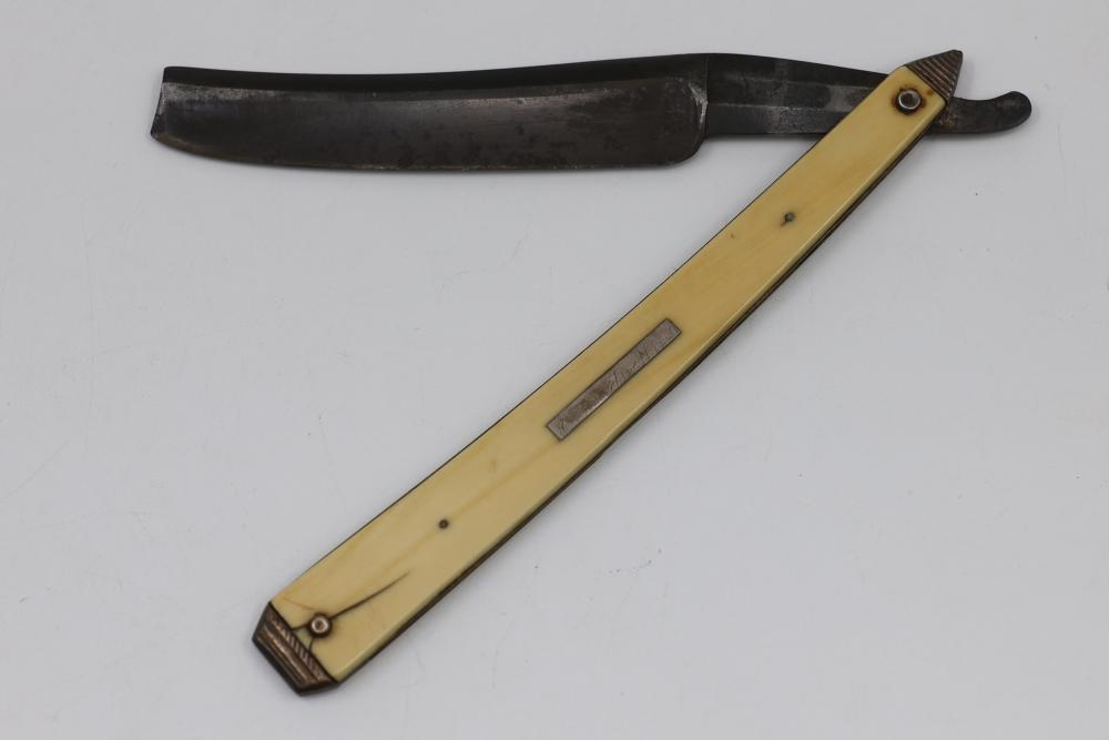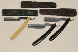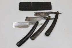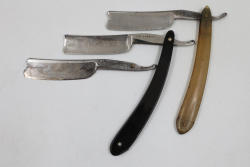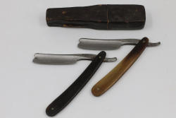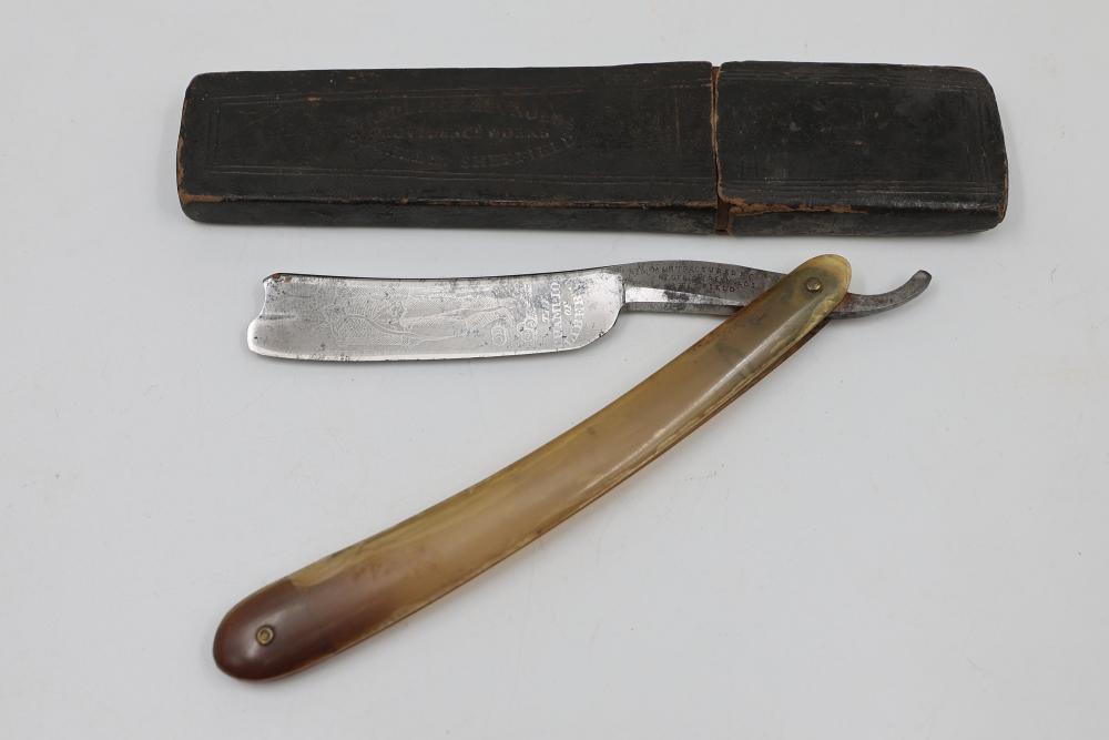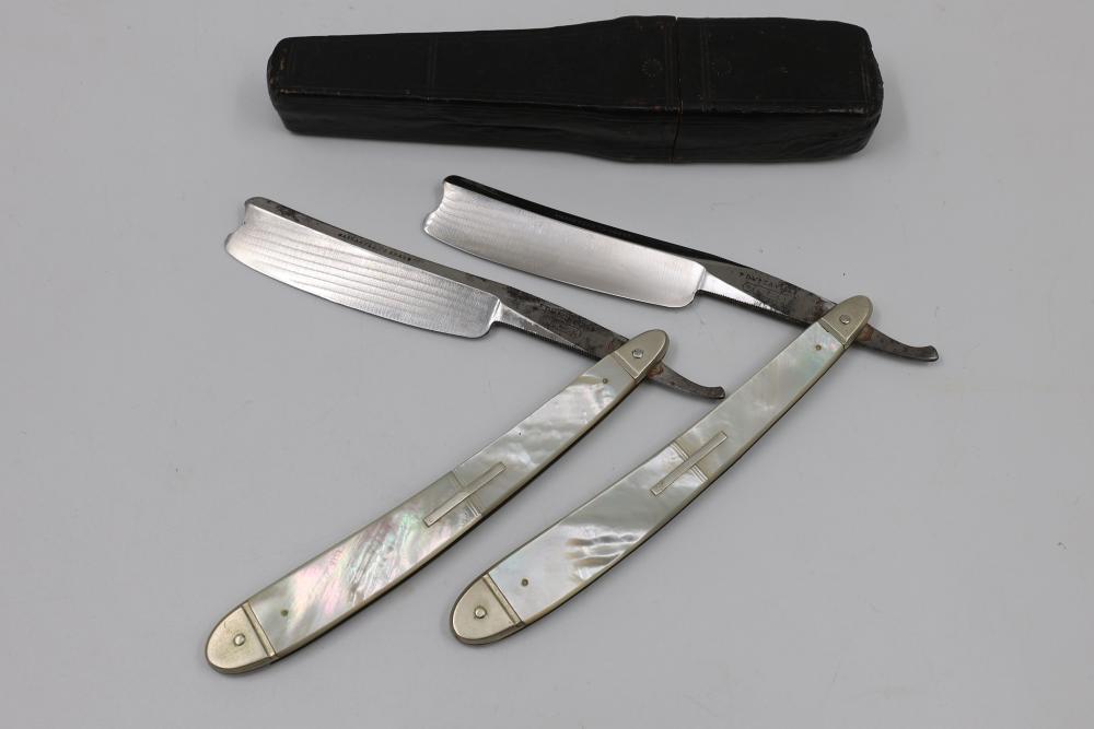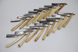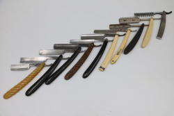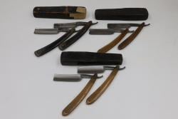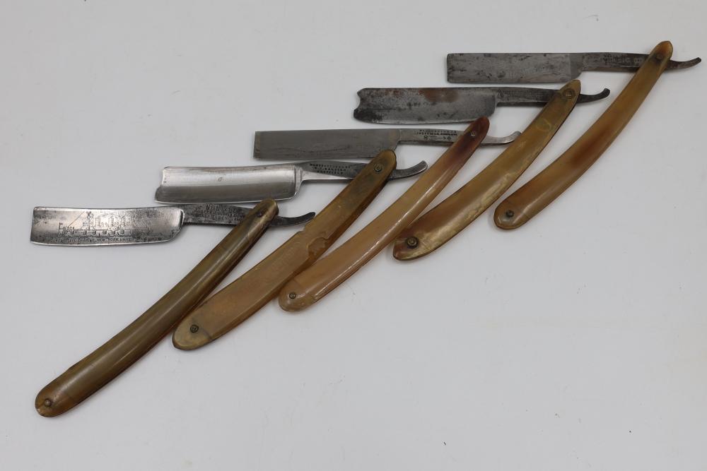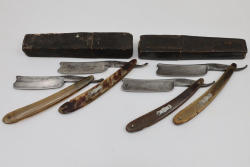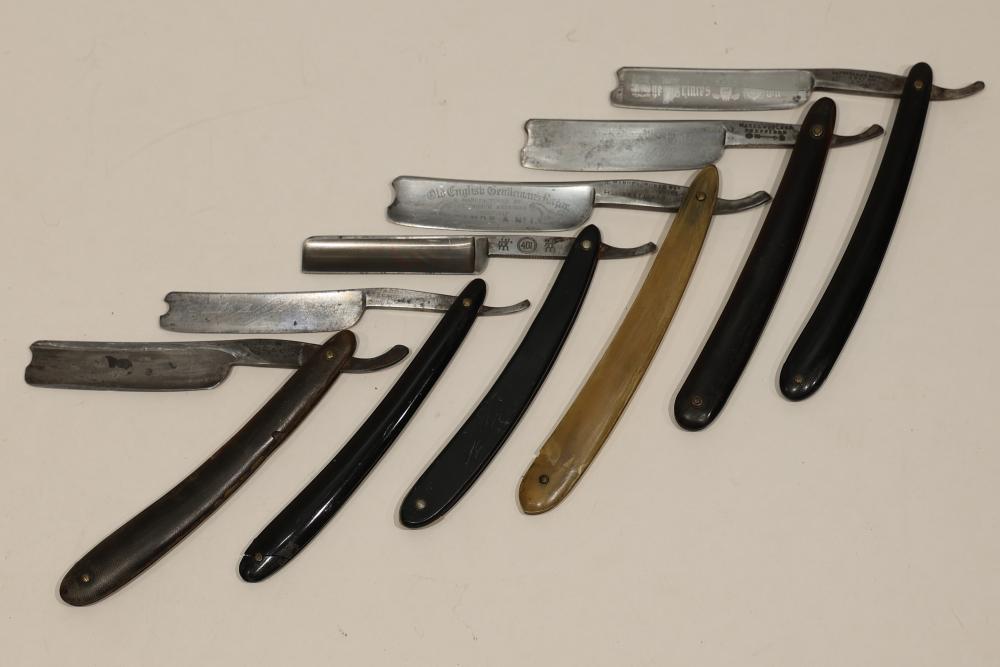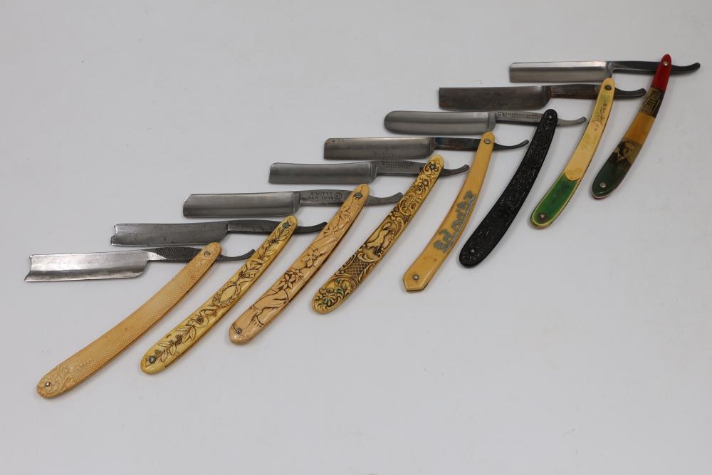 Eight Straight Razors and Two Hair Shapers, some with makers marks Sterling Silver Arrow, Tennis Solingen, J. Wiss & Sons, and George Wostenholm, featuring mixed celluloid scales, hollow-ground and full-hollow blades. Included are Weck and Durham hair shapers, additional blades, and various cases and boxes. Pickup only.