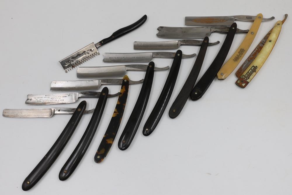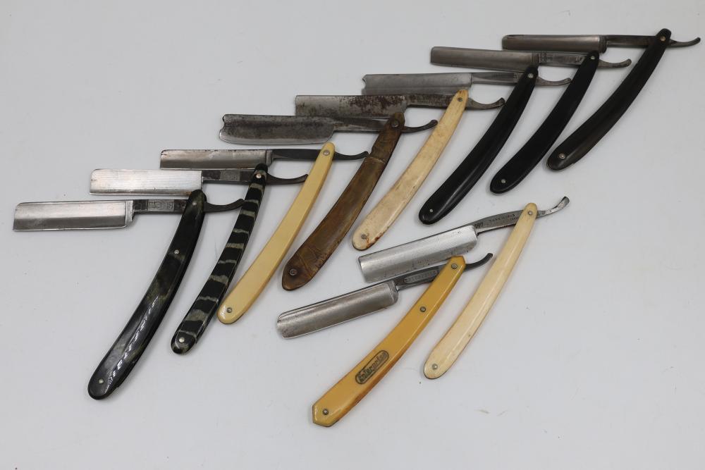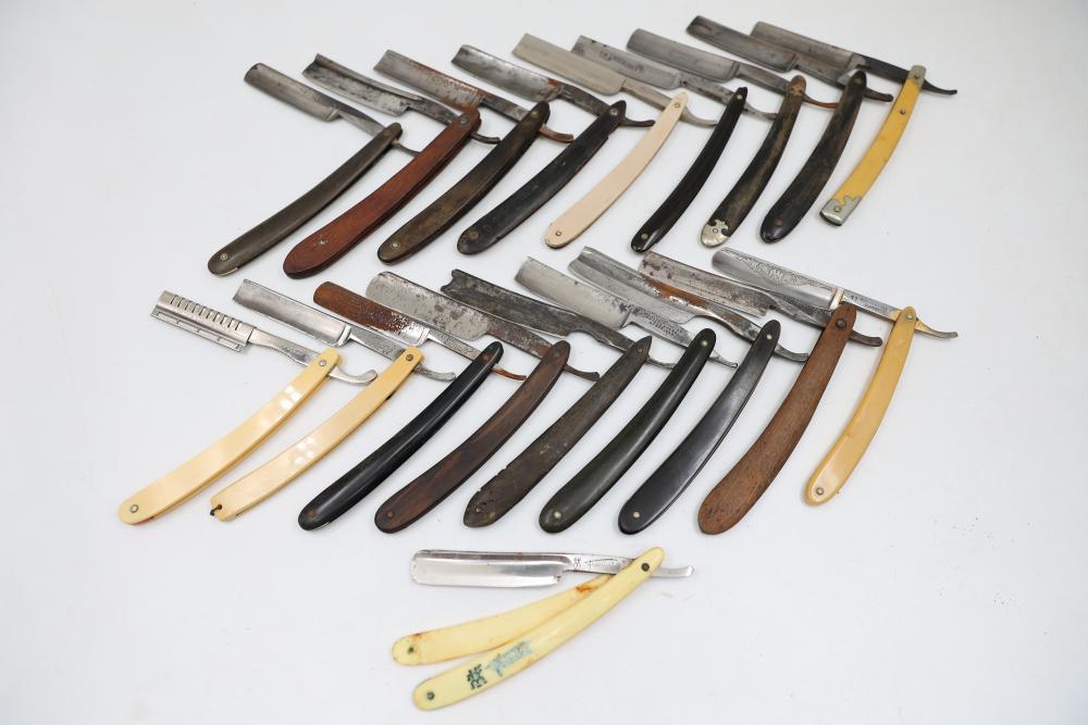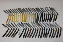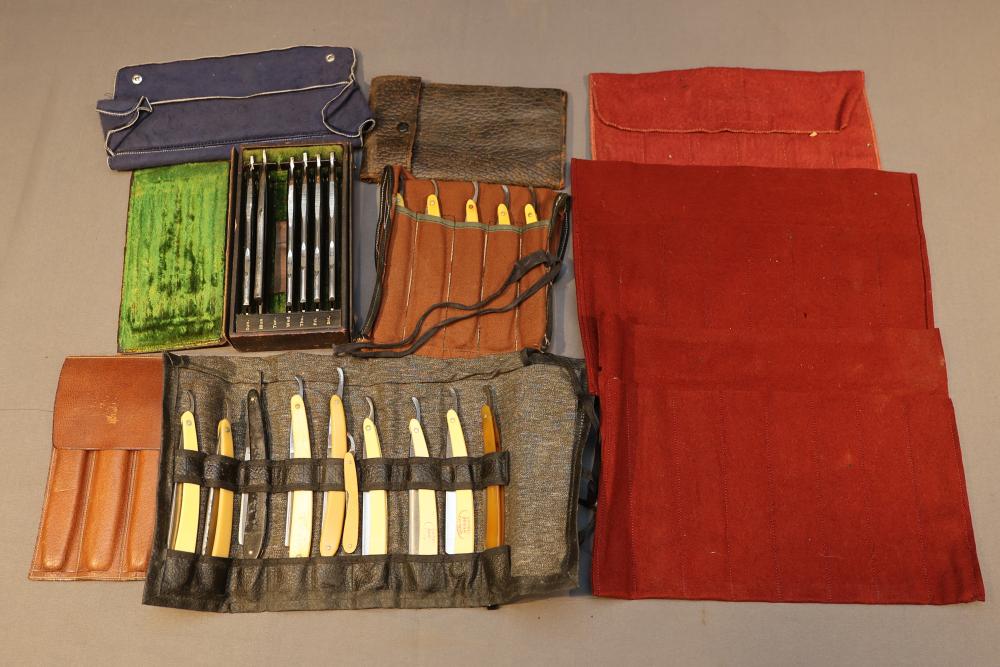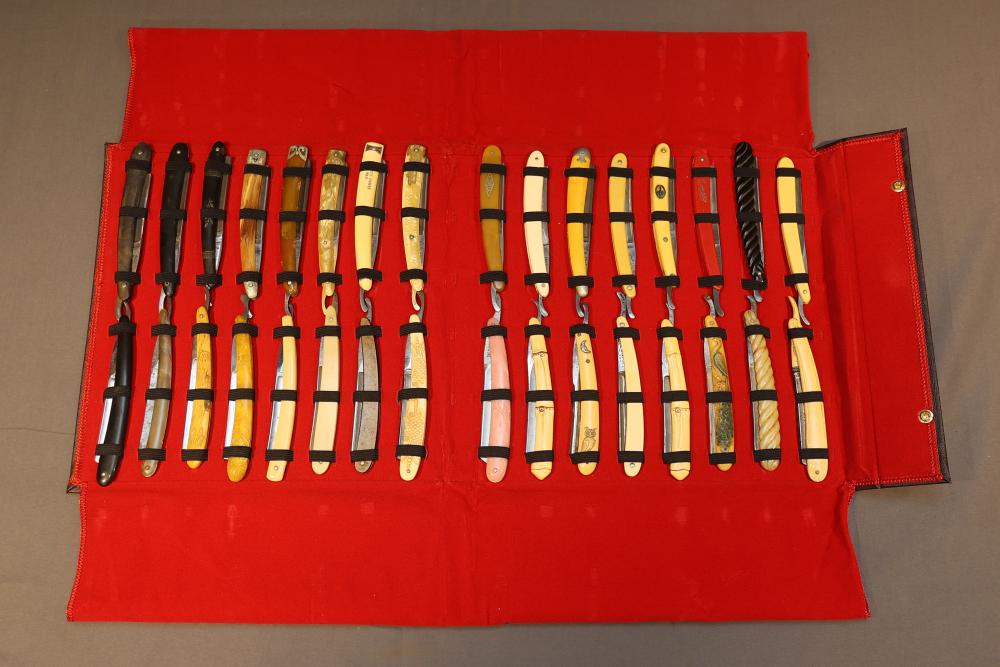 51 Straight Razors from many different makers such as M. Wolkin, Cattaraugus, and L. West, featuring celluloid, wood, and horn scales, with hollow and wedge style blades. Includes a leather rollup case with a blue softcloth interior and external handle with belt straps for storage. Pickup only.