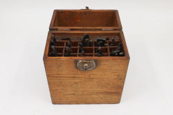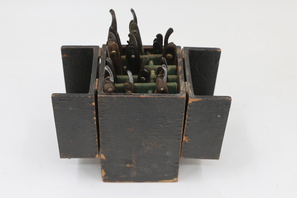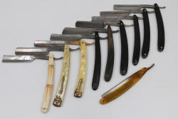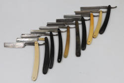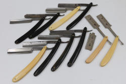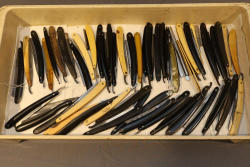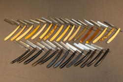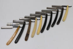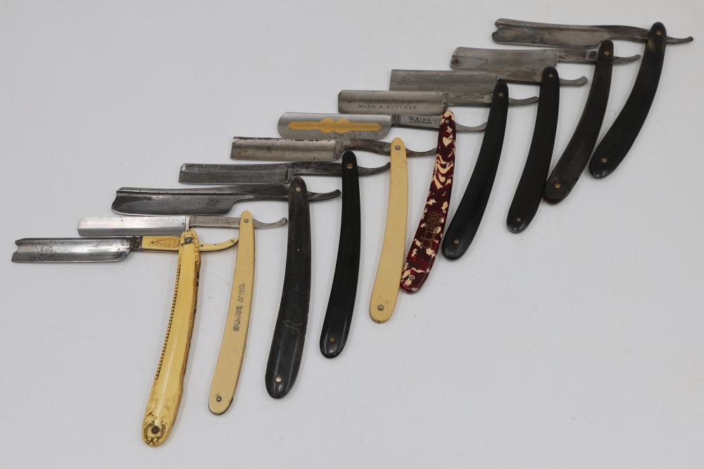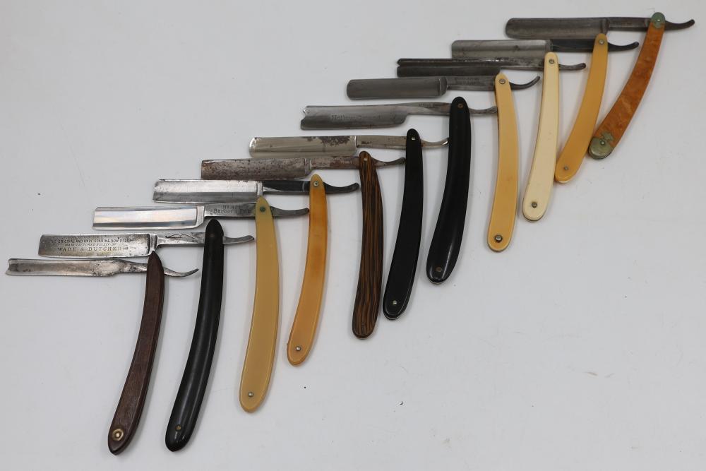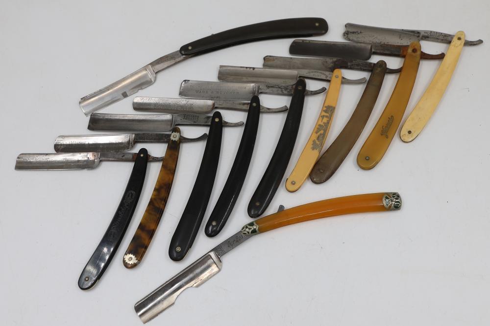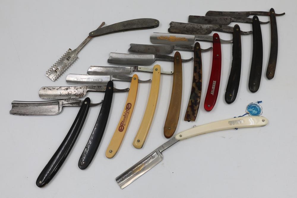 51 Straight Razors from many different makers such as M. Wolkin, Cattaraugus, and L. West, featuring celluloid, wood, and horn scales, with hollow and wedge style blades. Includes a leather rollup case with a blue softcloth interior and external handle with belt straps for storage. Pickup only.