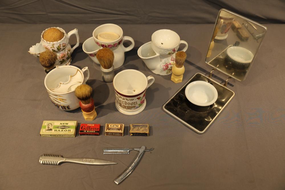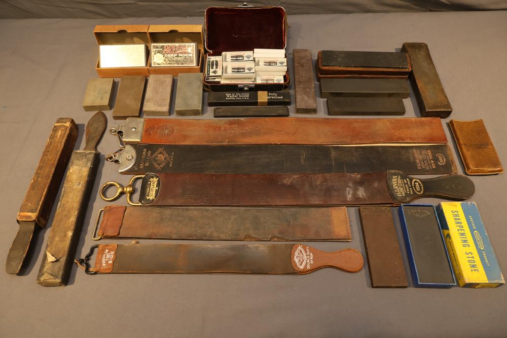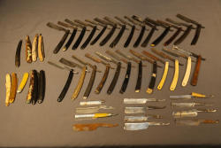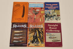 Six Straight Razor Identification and Value books with illustrations and price guides from authors such as Robert A. Doyle, Bill Schroeder, Roy Ritchie, and Ron Stewart. Titles include Value Guide for Barberiana & Shaving Collectibles, 1000 Razors, Straight Razor Collecting, Standard Guide to Razors 1st and 2nd Editons, and Wig, Hairdressing, and Shaving Bygones.