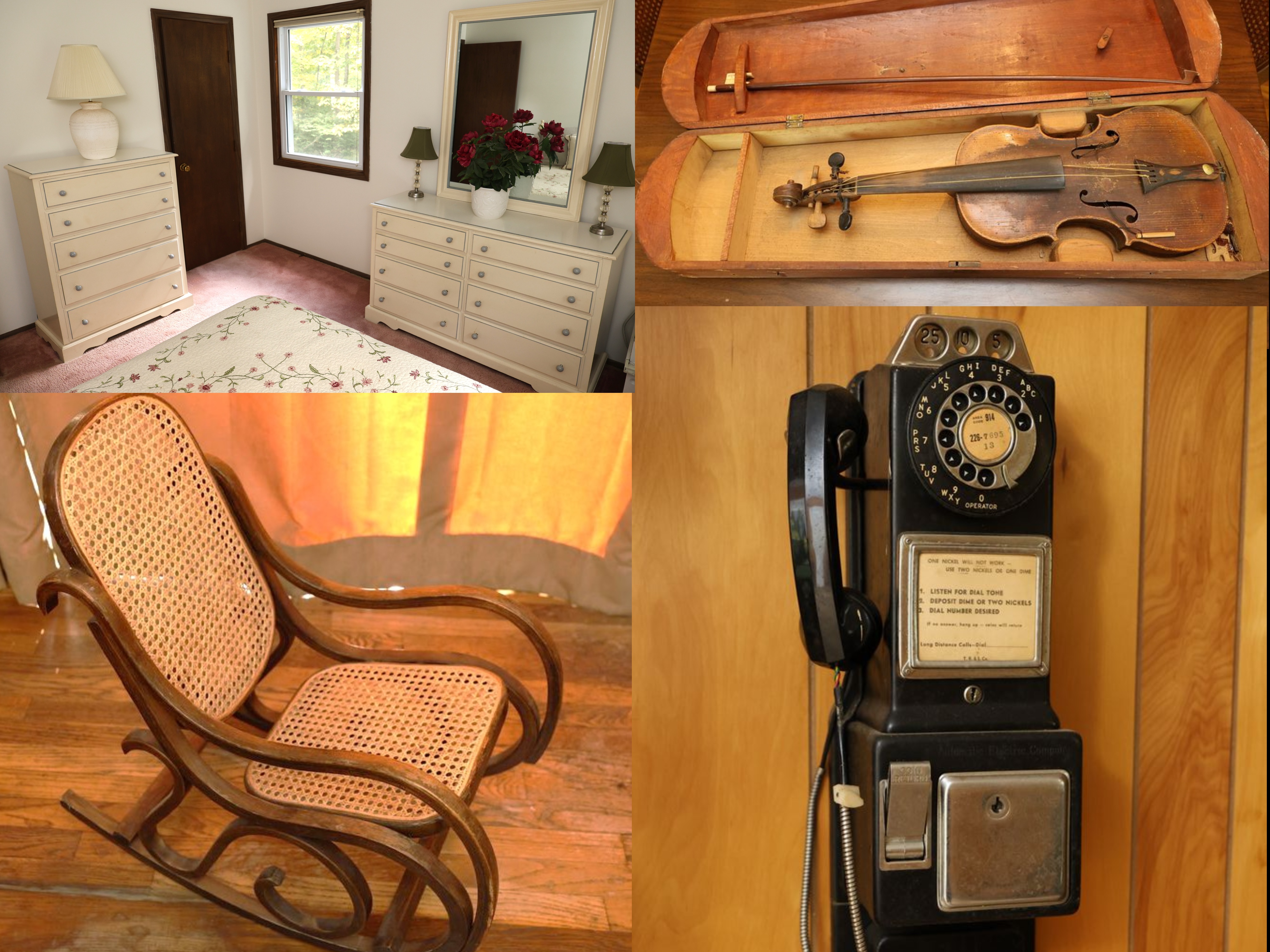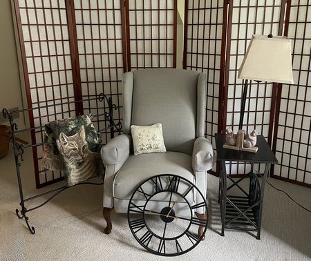 Items include Thomasville glass dining set & front hutch; Shoji screens; modern upholstered Queen Ann winged-back recliner; Corning/Pyrex cook/bake ware; Hampton Bay outdoor dining set; Royal Horti...