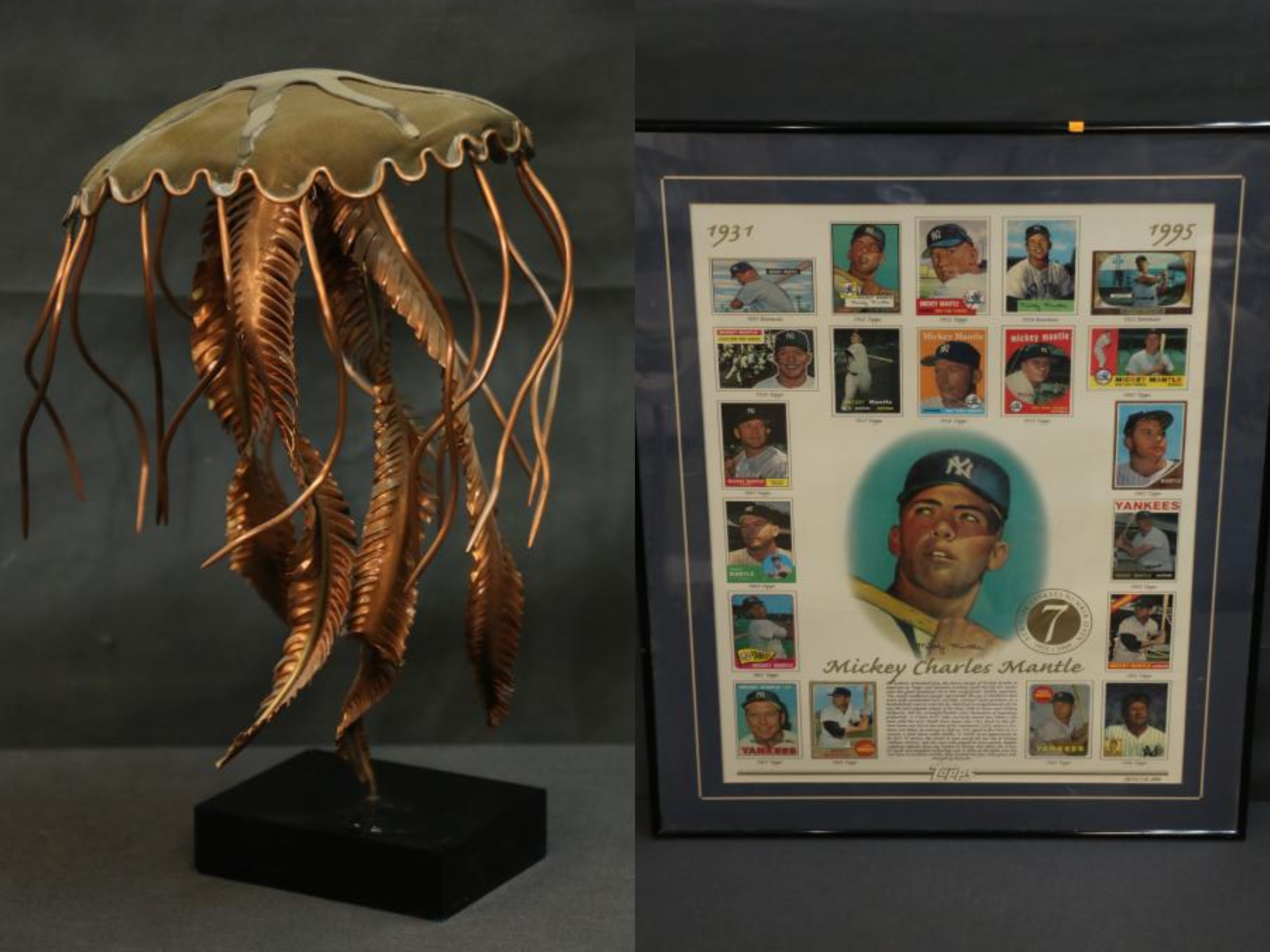Items include John Stark metal sculpture depicting a jellyfish; framed Mickey Mantle tribute; Mac Tools 24K gold-plated limited edition gift sets; Global Paradox leatherbound first edition personal...