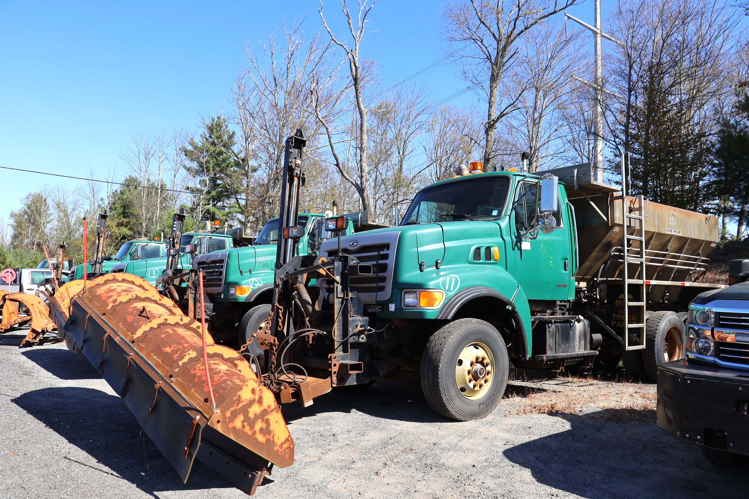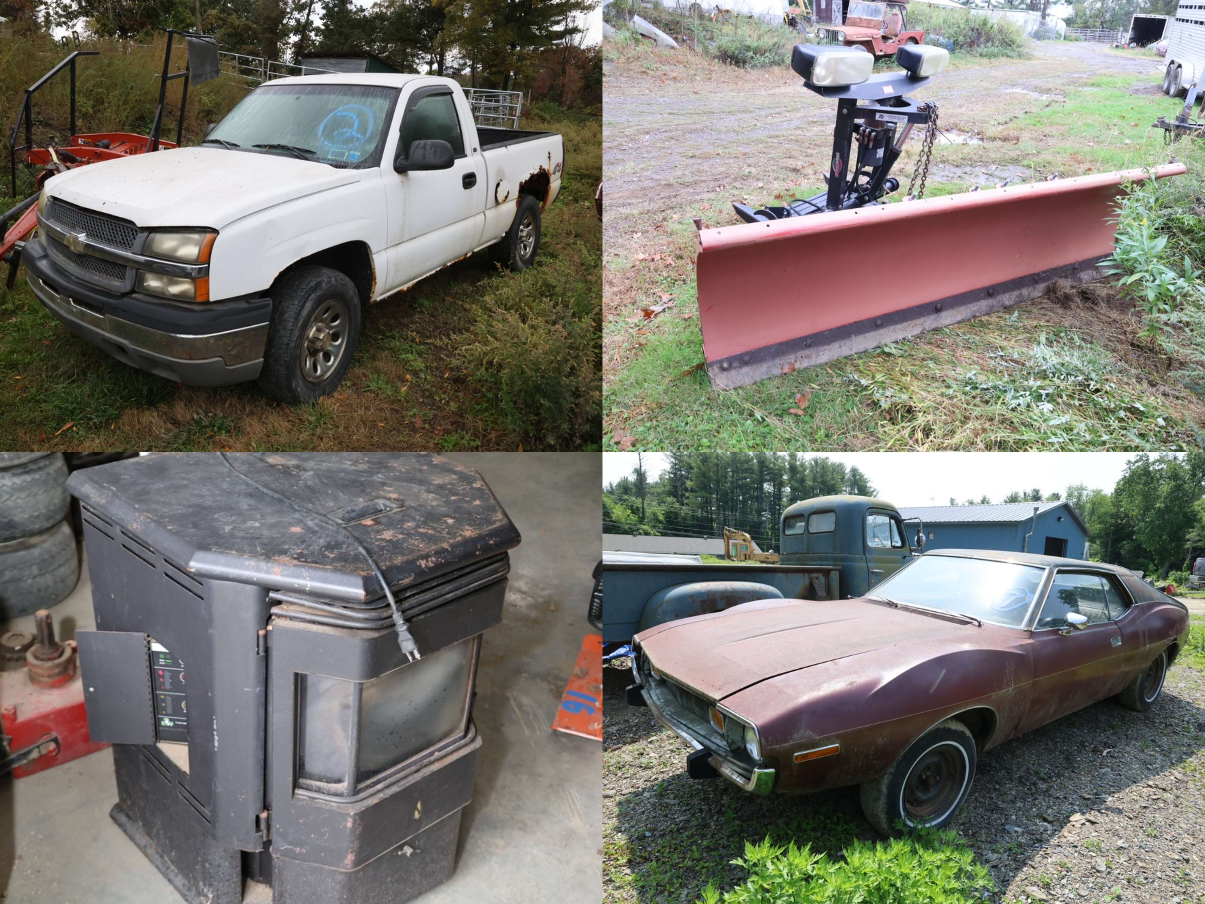 Items include 1986 Ford LN8000 Water Truck, 2008 Ford F-350 Super Duty Utility Truck with plow, and 1997 International 4800 Dump Truck 4X4. Items located in Poughquag, NY.